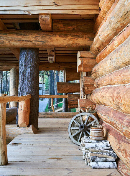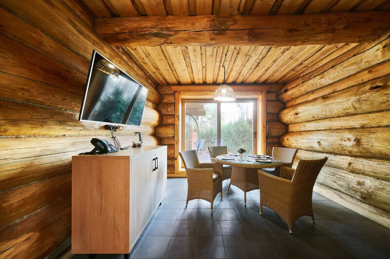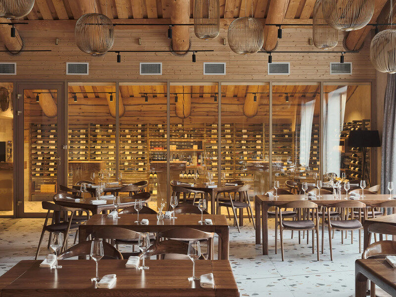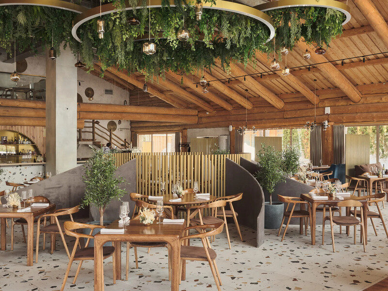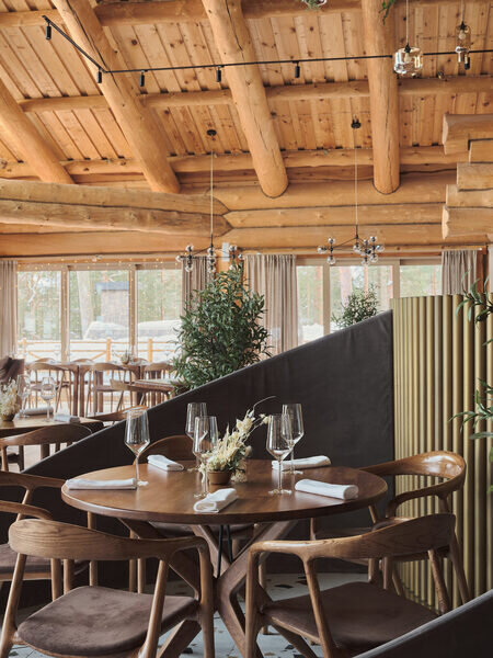 Блюда русской и европейской кухни, в широком разнообразии представленные в меню, готовятся на дровяной печи из свежих фермерских продуктов. В барном меню ресторана представлен широкий ассортимент крепких алкогольных и безалкогольных напитков, изысканных алкогольных коктейлей и согревающих горячих напитков. Все здесь создано с любовью к природе и находится в гармонии с ней: в отделке преимущественно использовано натуральное дерево и камень, а с дизайнерской мебелью прекрасно сочетаются живые растения. В панорамных окнах вы можете видеть сосновый бор.