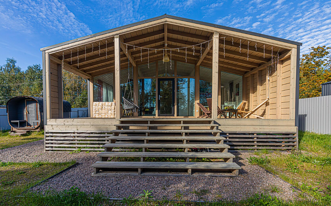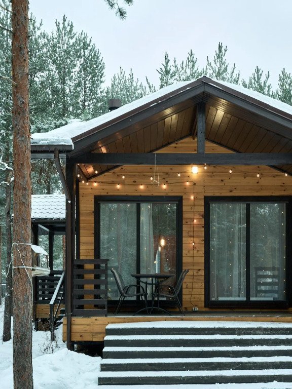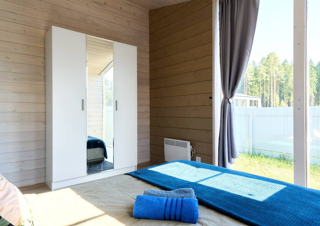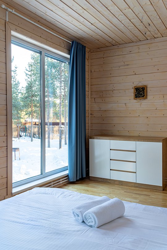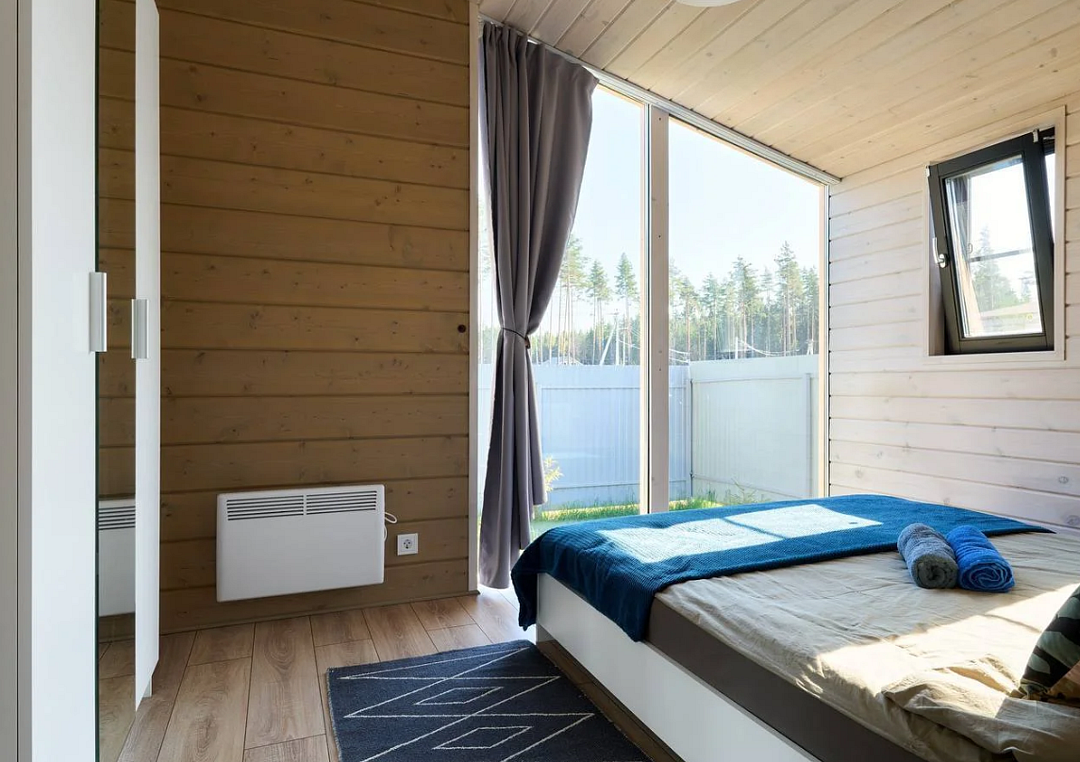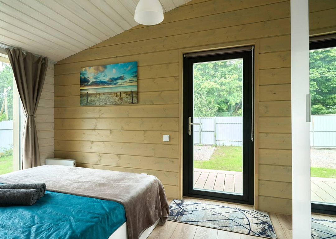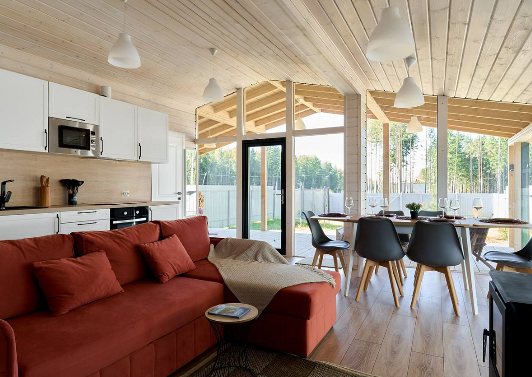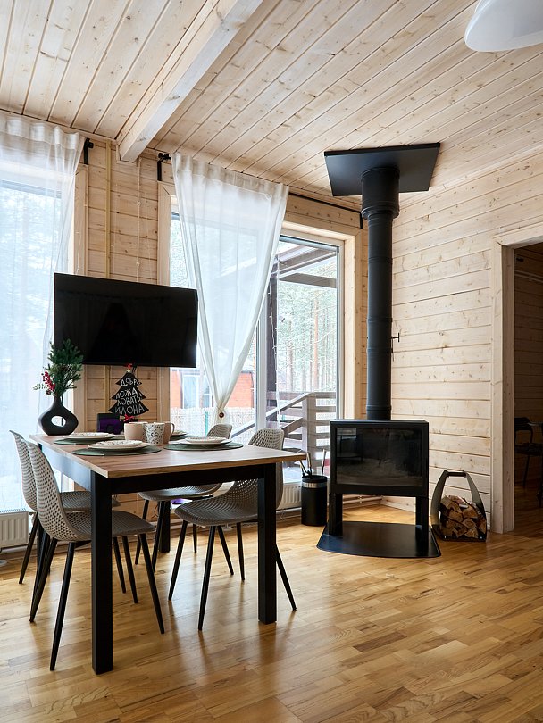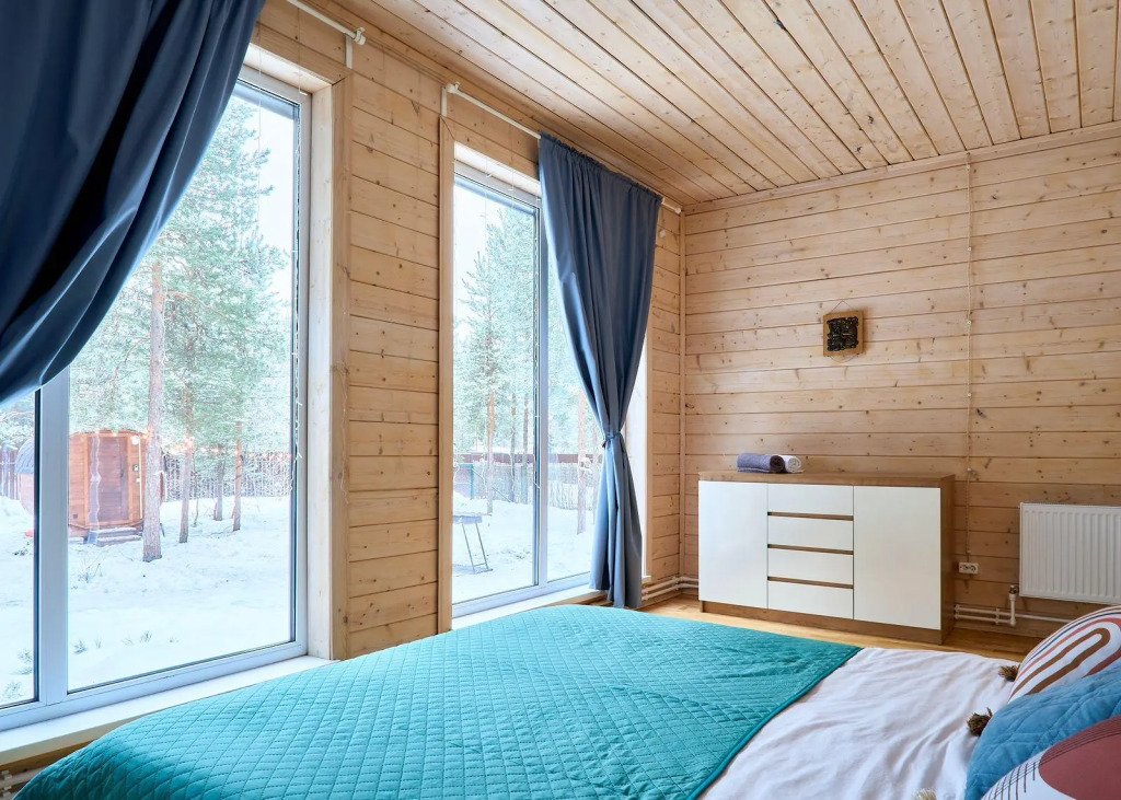 Дом Луна с баней в пешей доступности от озера для семейного отдыха, с полной отделкой и мебелью, панорамными окнами, камином, просторной террасой, закрытой территорией. Две спальни с двуспальными кроватями, кухня-гостиная с раскладным диваном и камином.