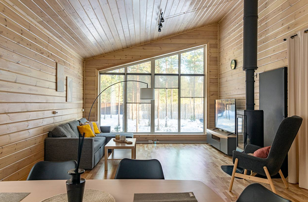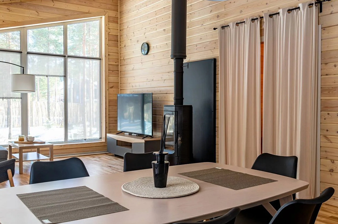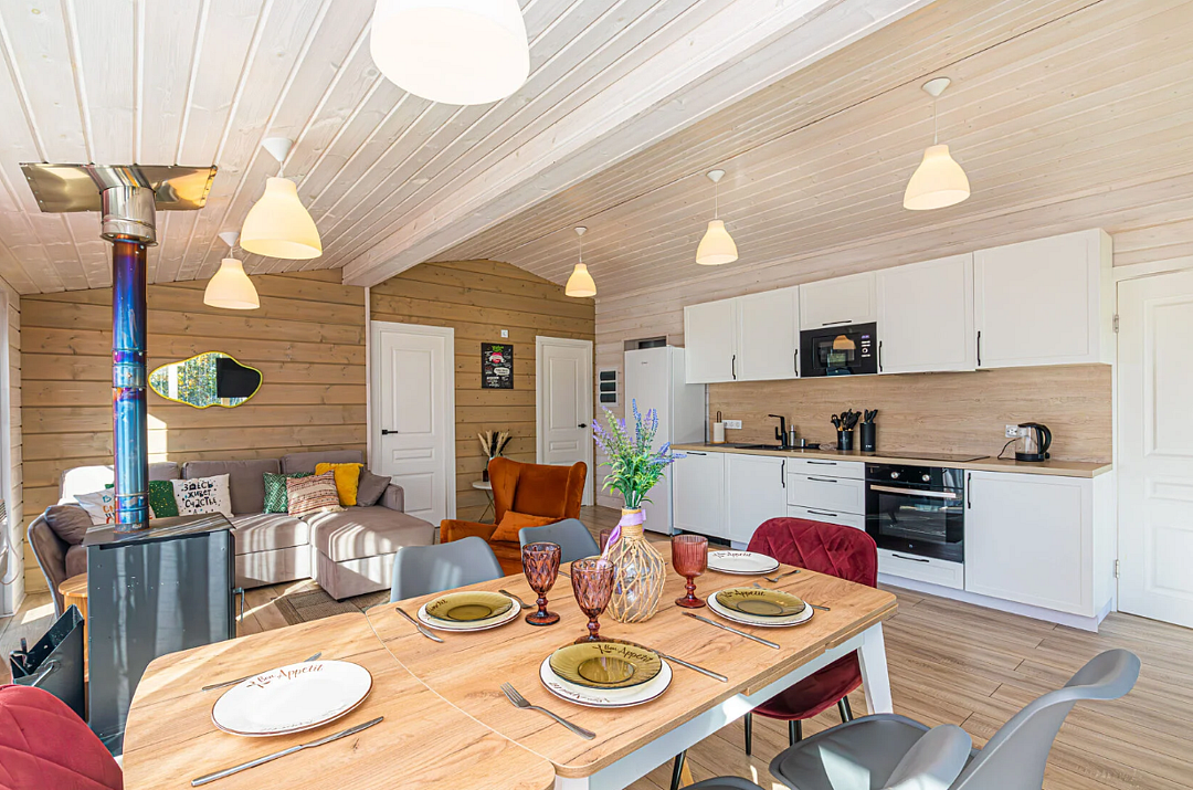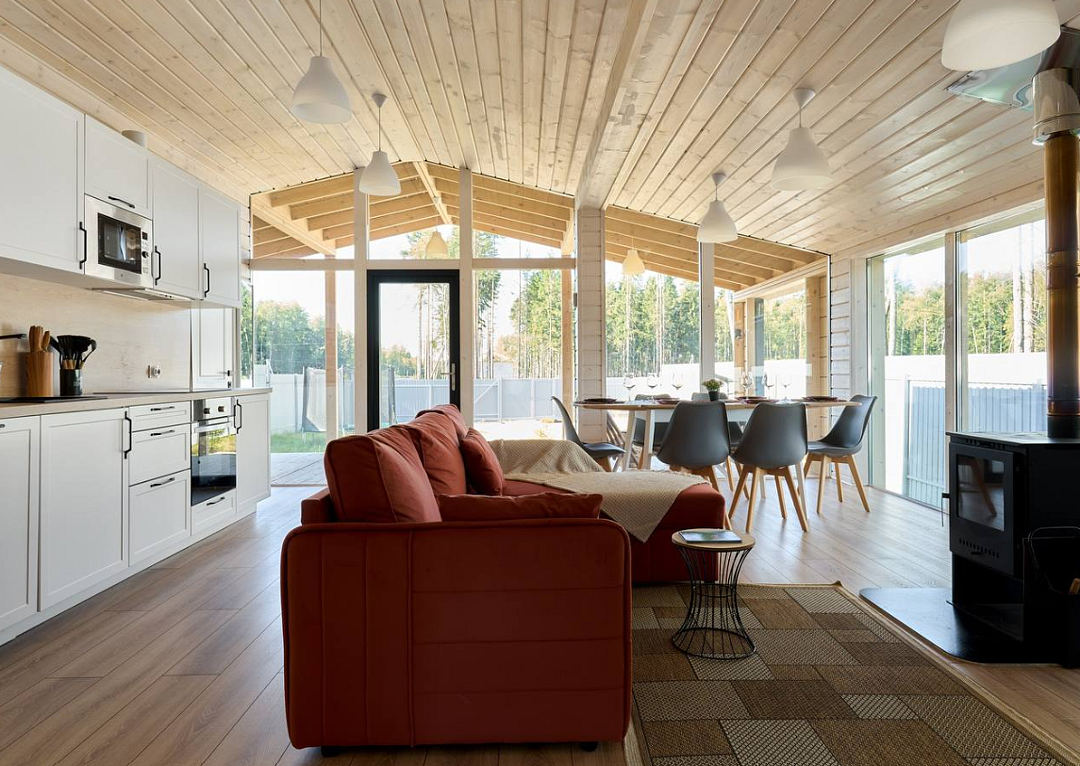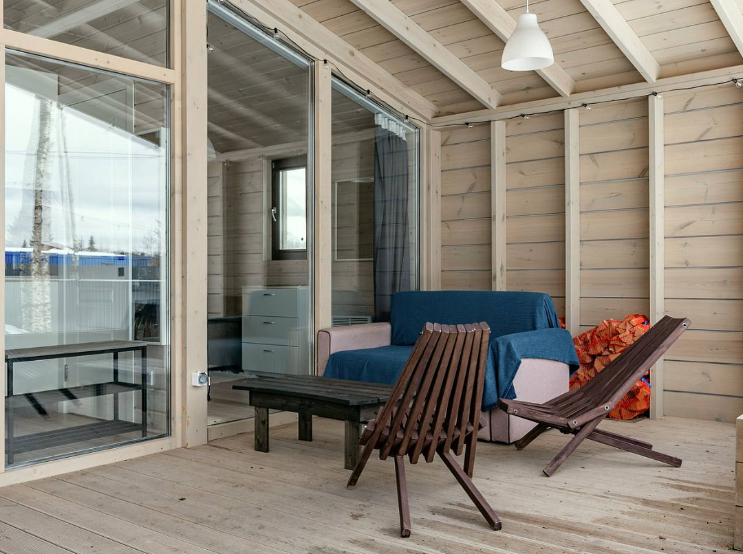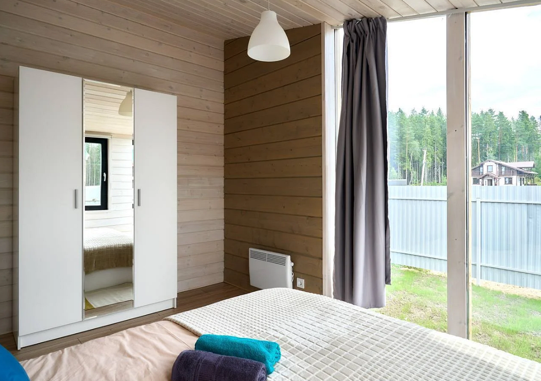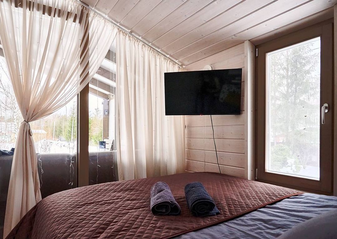 Дом Луна с баней в пешей доступности от озера для семейного отдыха, с полной отделкой и мебелью, панорамными окнами, камином, просторной террасой, закрытой территорией. Две спальни с двуспальными кроватями, кухня-гостиная с раскладным диваном и камином.