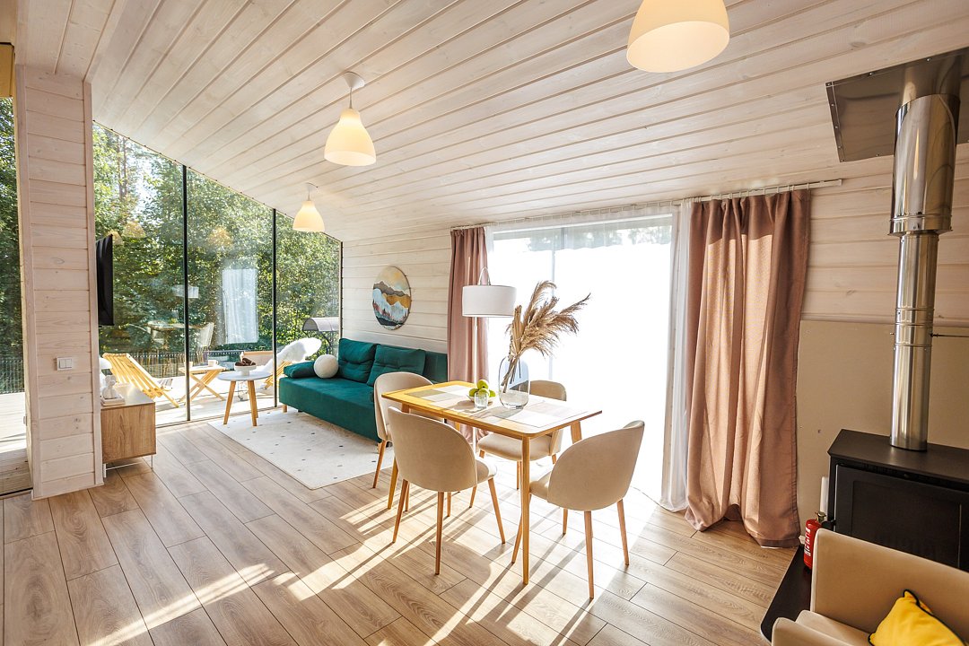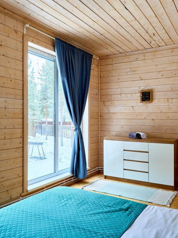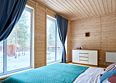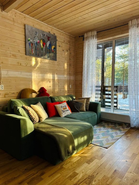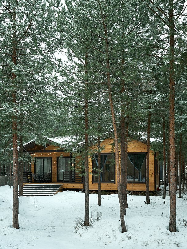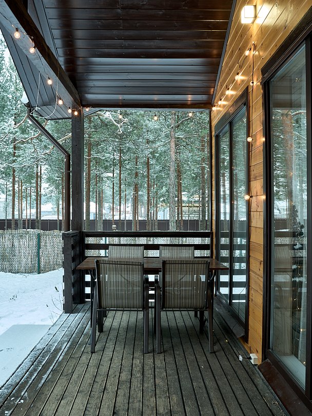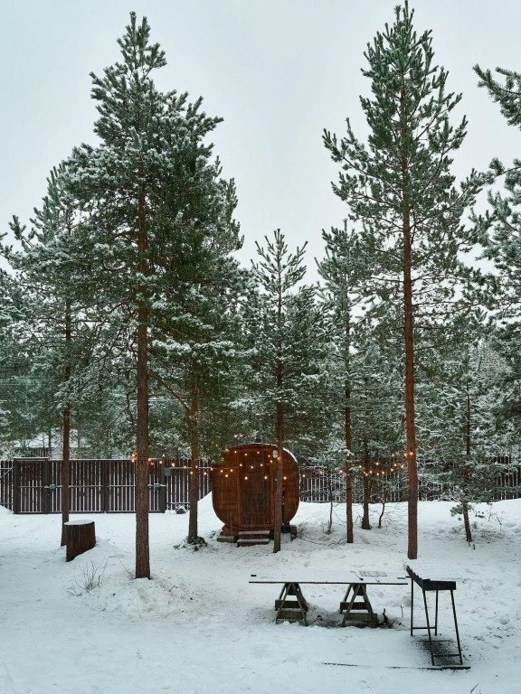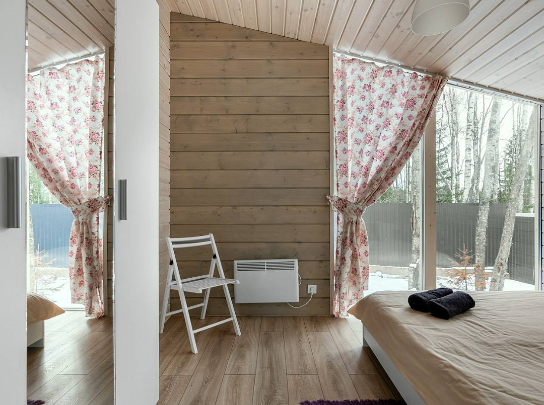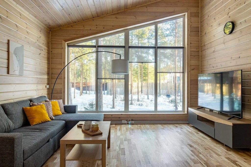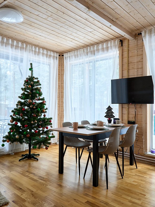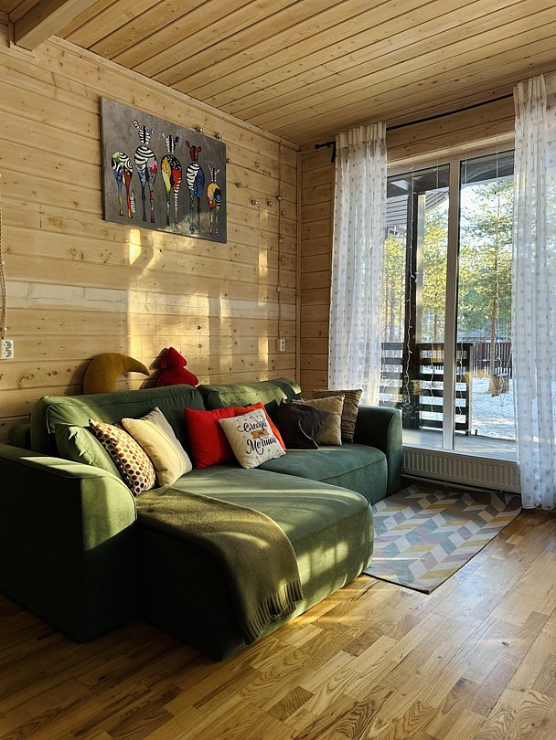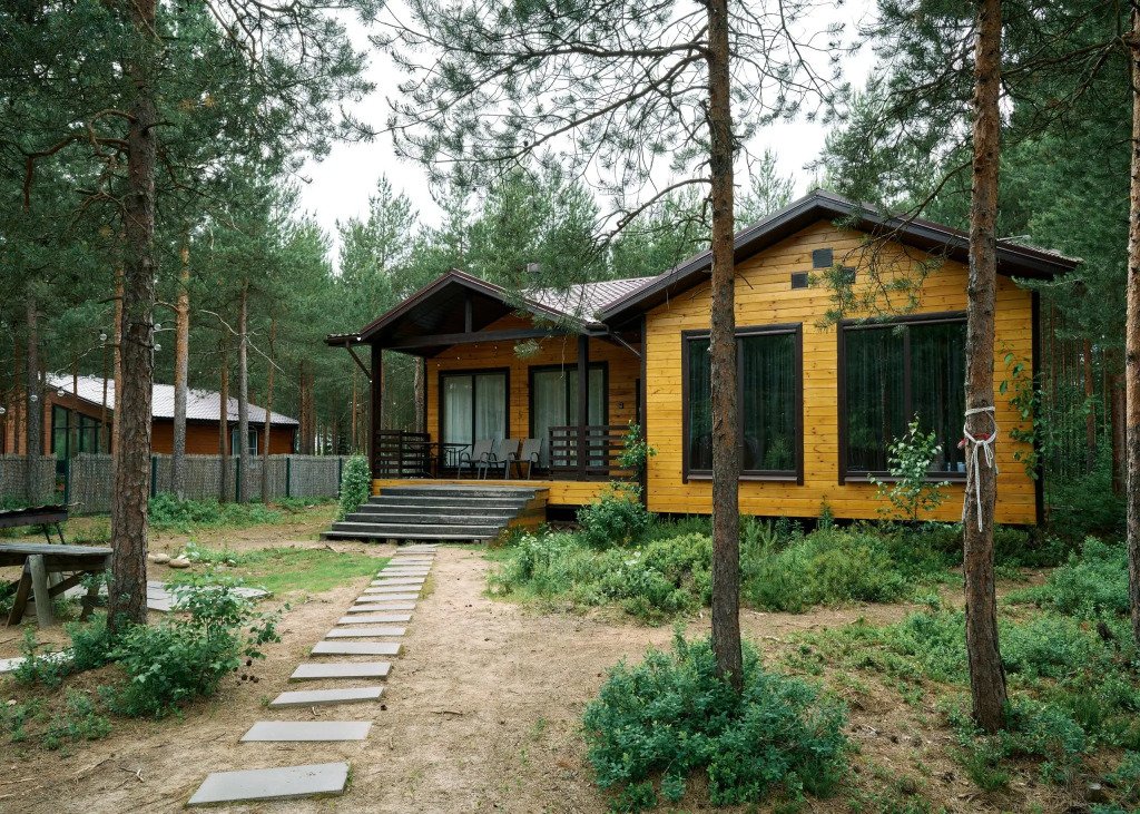 Дом Луна с баней в пешей доступности от озера для семейного отдыха, с полной отделкой и мебелью, панорамными окнами, камином, просторной террасой, закрытой территорией. Две спальни с двуспальными кроватями, кухня-гостиная с раскладным диваном и камином.