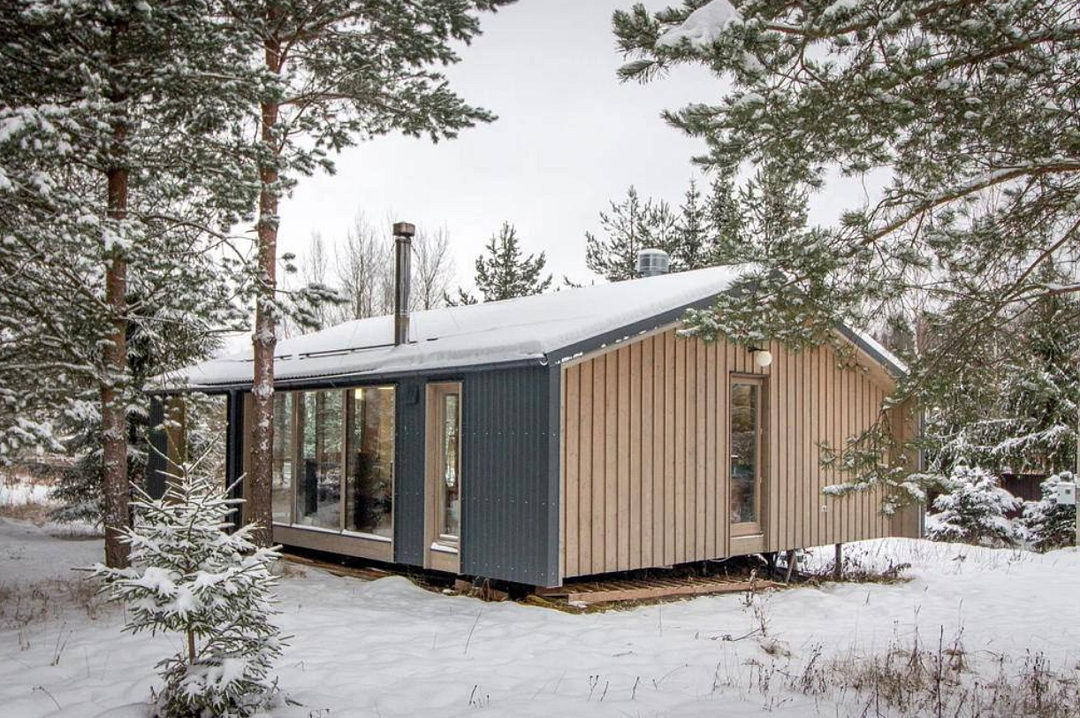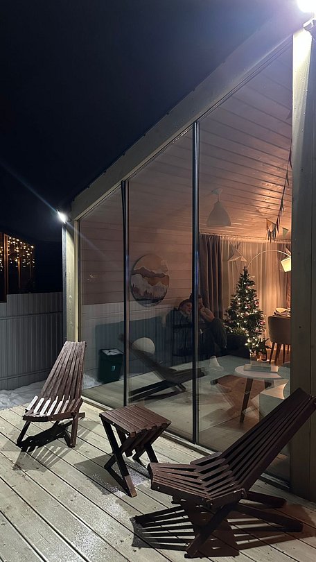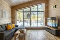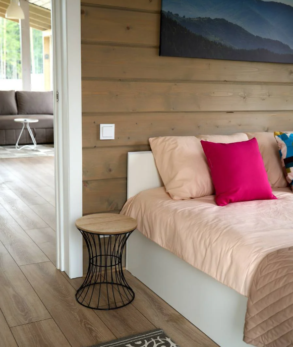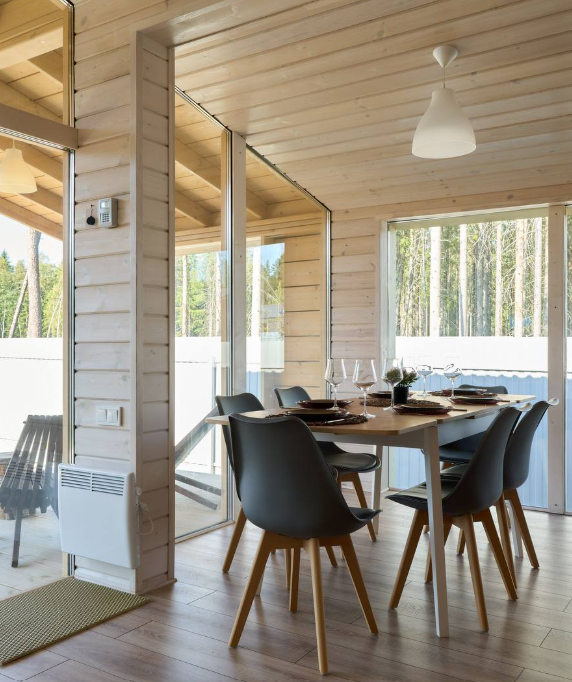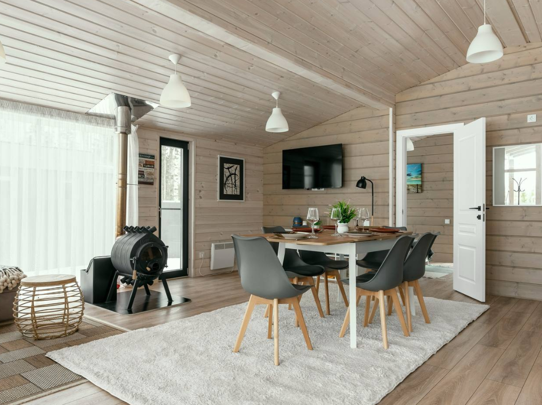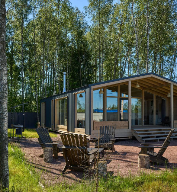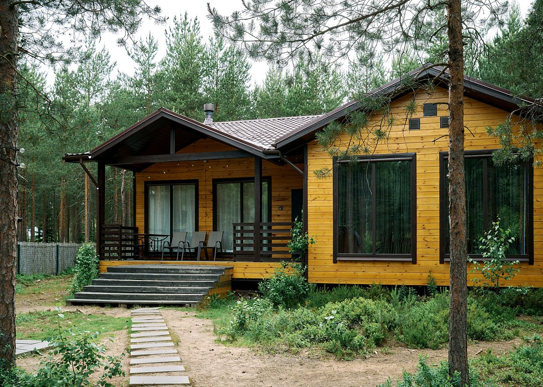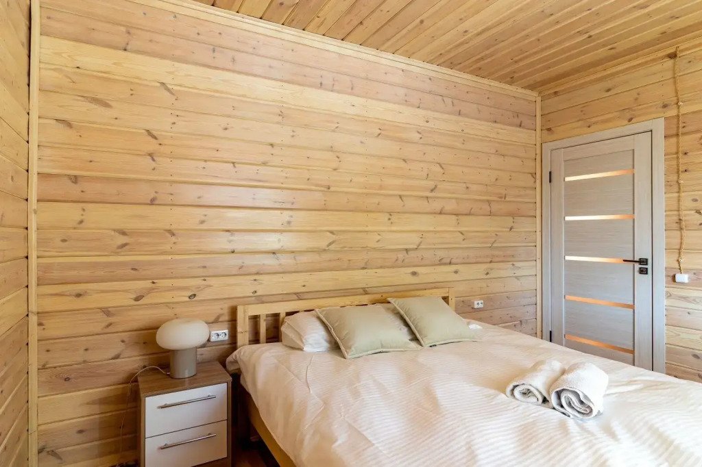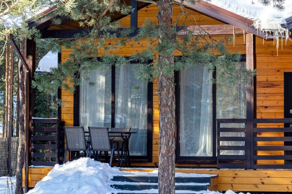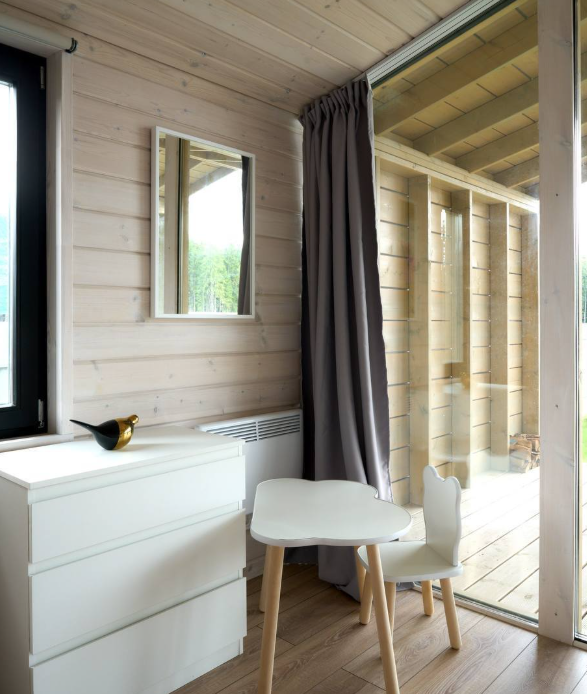 Дом Луна с баней в пешей доступности от озера для семейного отдыха, с полной отделкой и мебелью, панорамными окнами, камином, просторной террасой, закрытой территорией. Две спальни с двуспальными кроватями, кухня-гостиная с раскладным диваном и камином.
