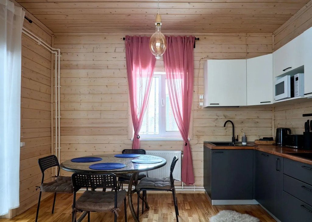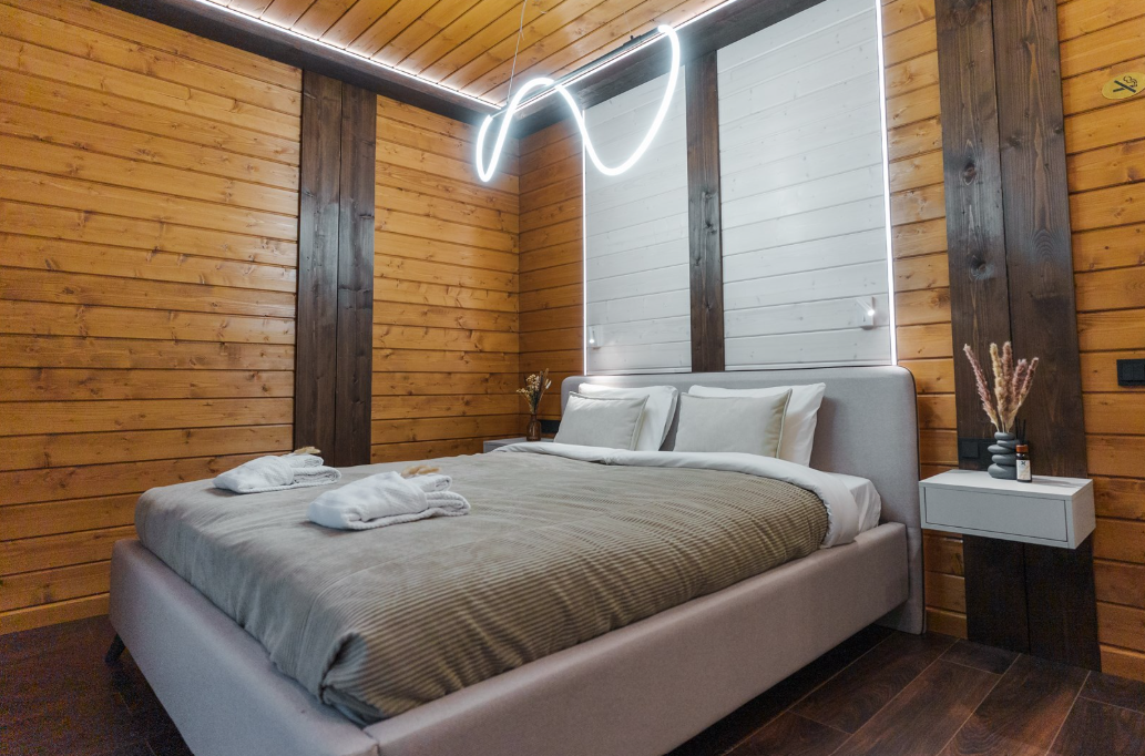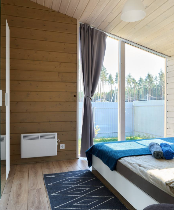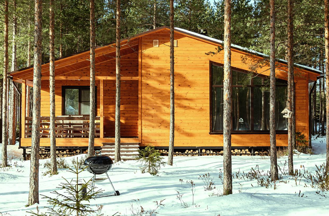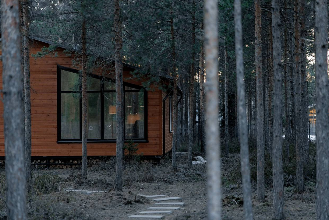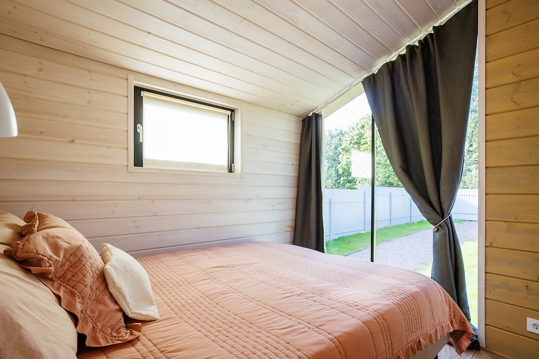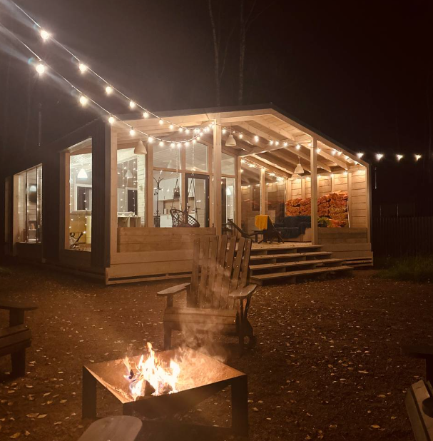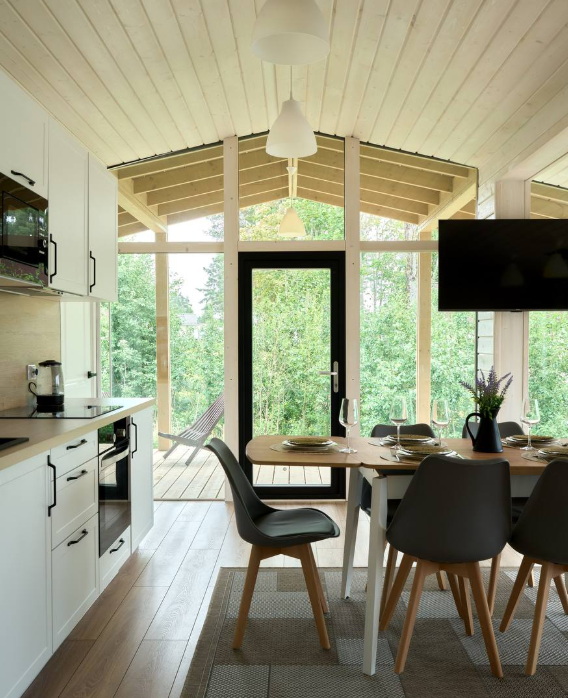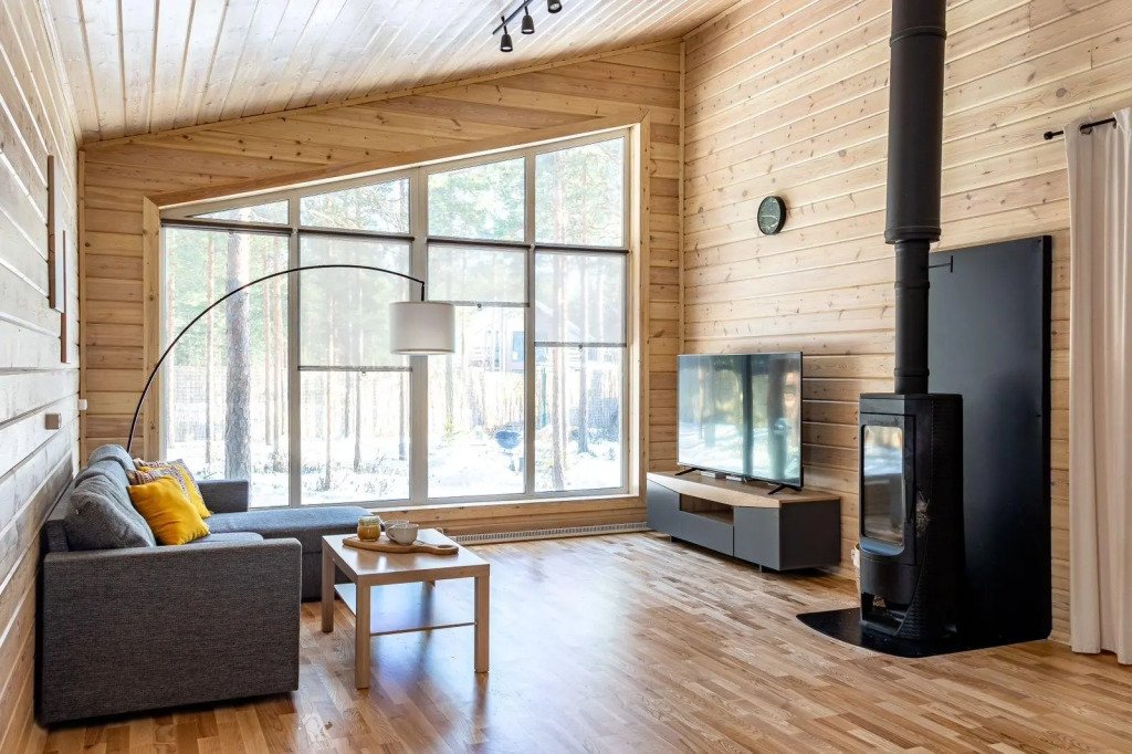 Дом Луна с баней в пешей доступности от озера для семейного отдыха, с полной отделкой и мебелью, панорамными окнами, камином, просторной террасой, закрытой территорией. Две спальни с двуспальными кроватями, кухня-гостиная с раскладным диваном и камином.