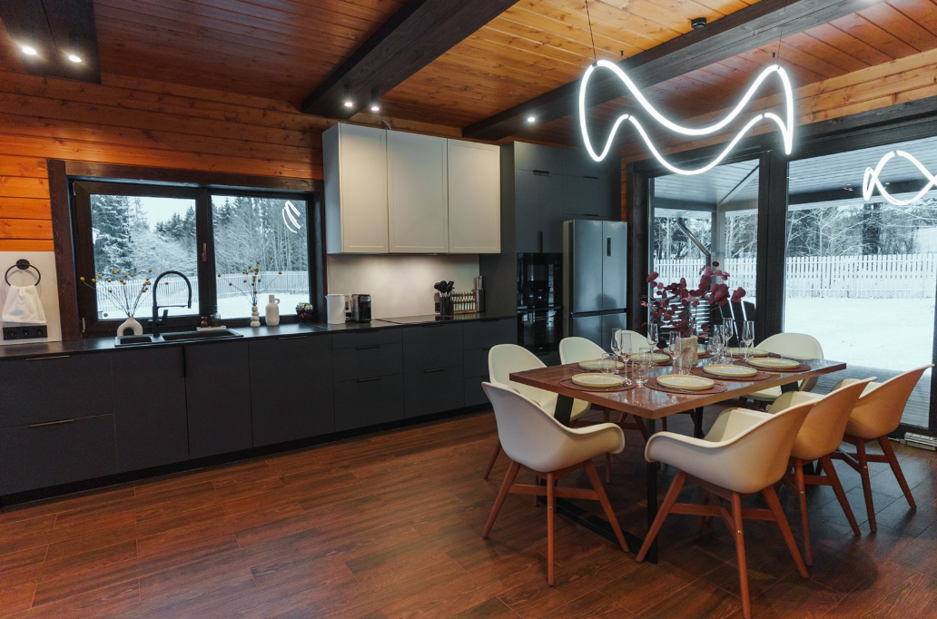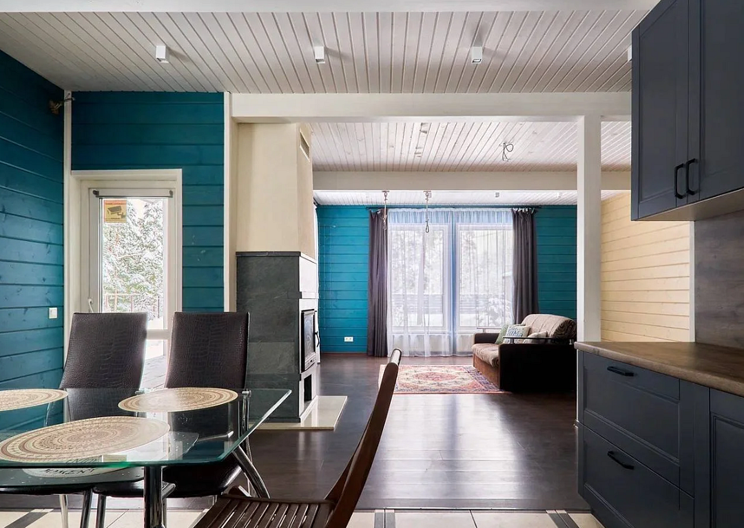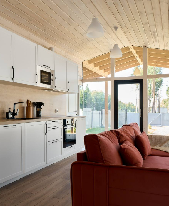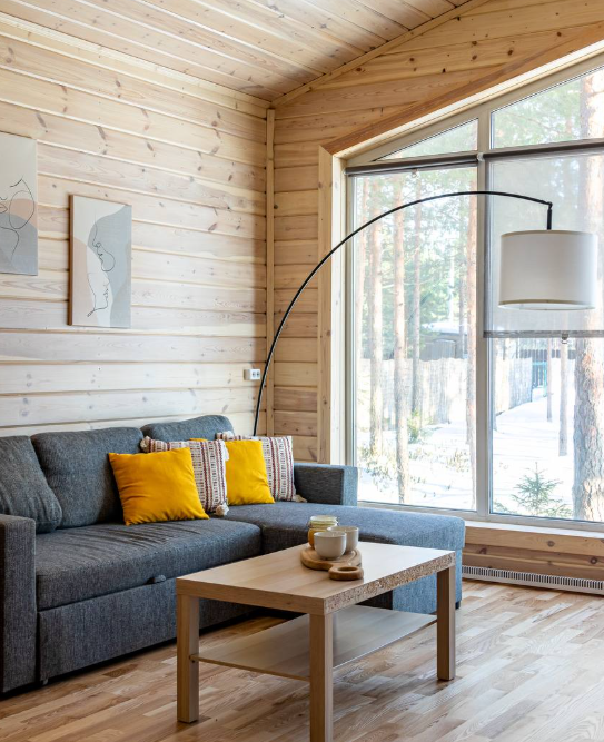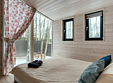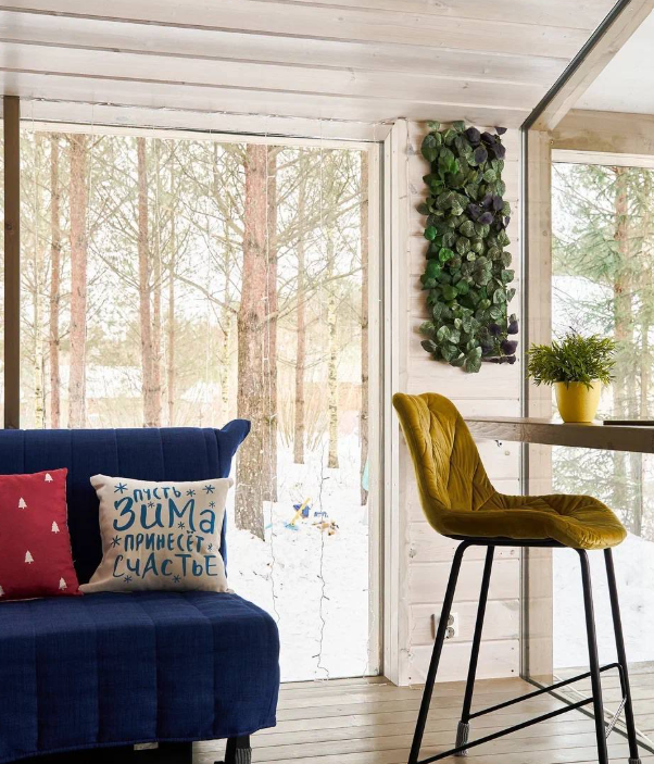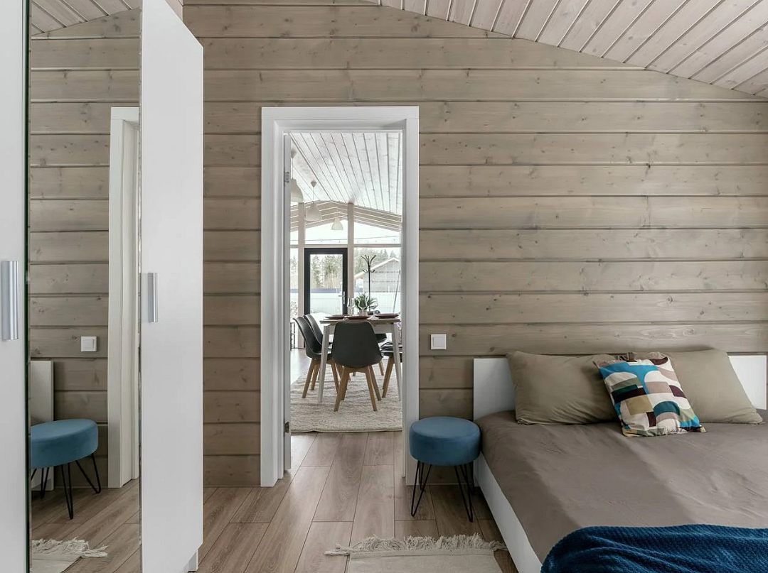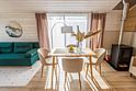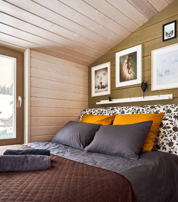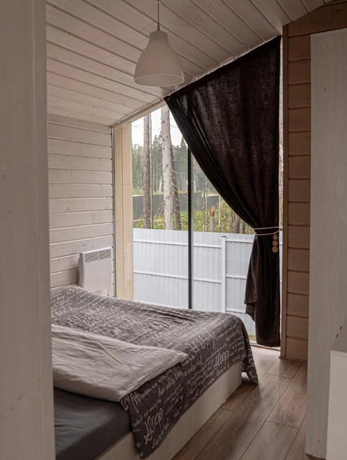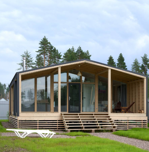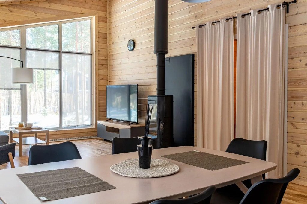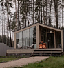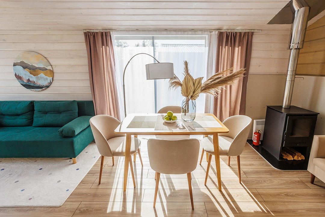 Дом Луна с баней в пешей доступности от озера для семейного отдыха, с полной отделкой и мебелью, панорамными окнами, камином, просторной террасой, закрытой территорией. Две спальни с двуспальными кроватями, кухня-гостиная с раскладным диваном и камином.