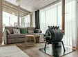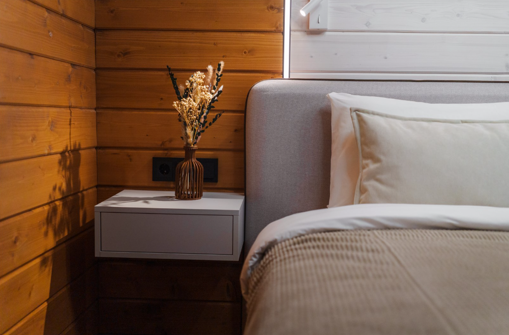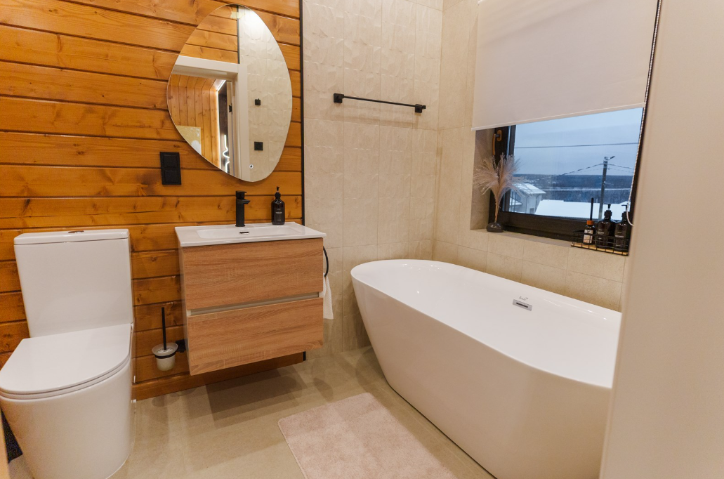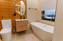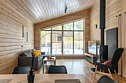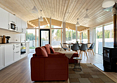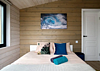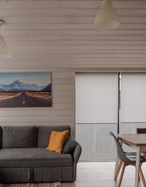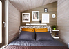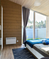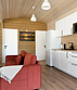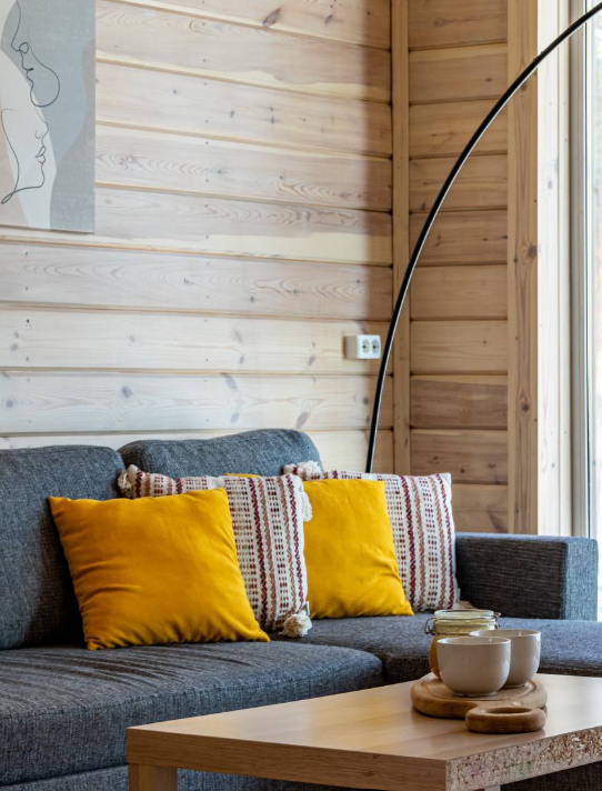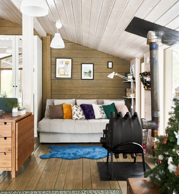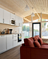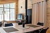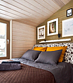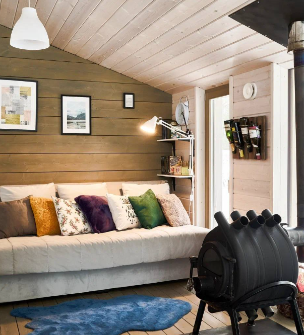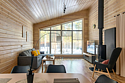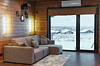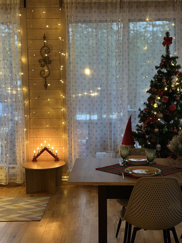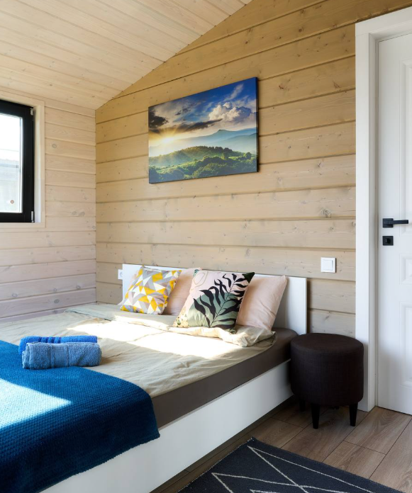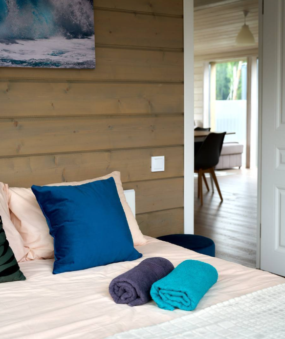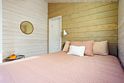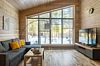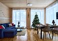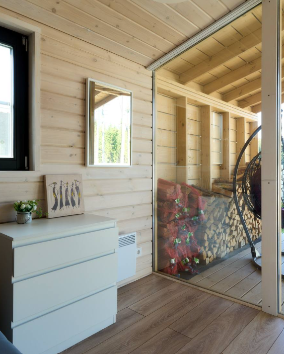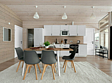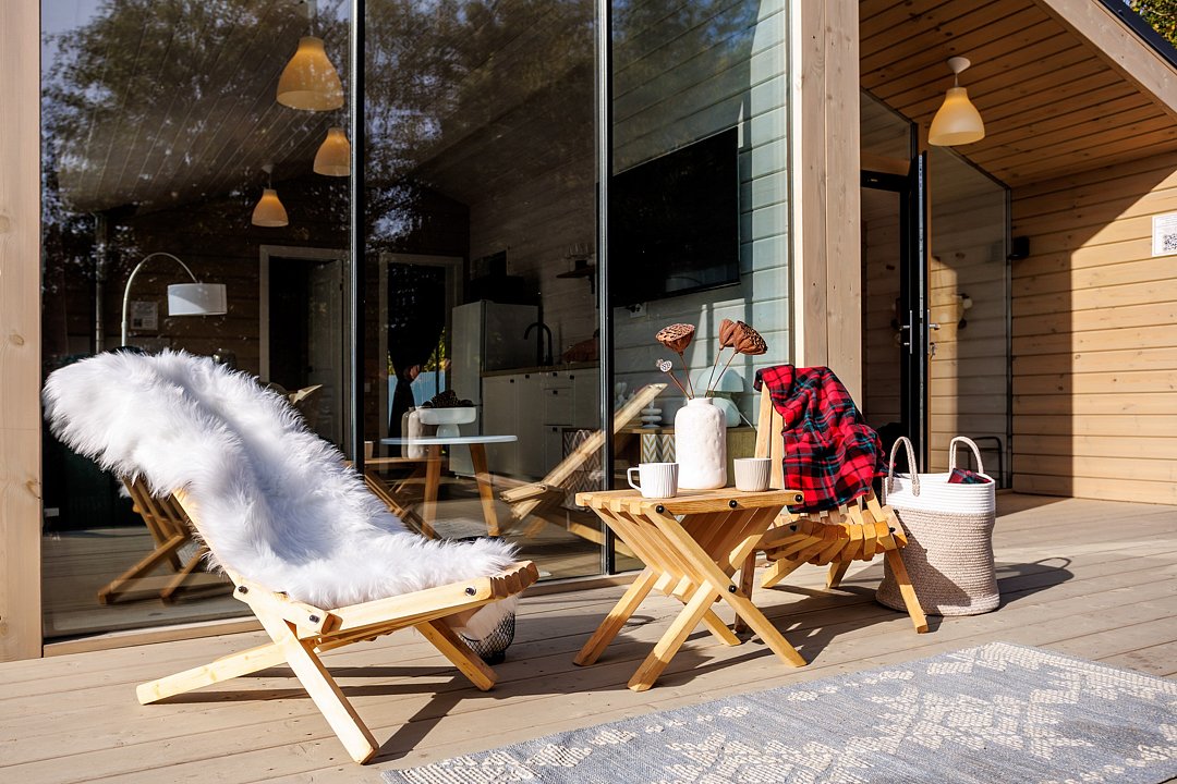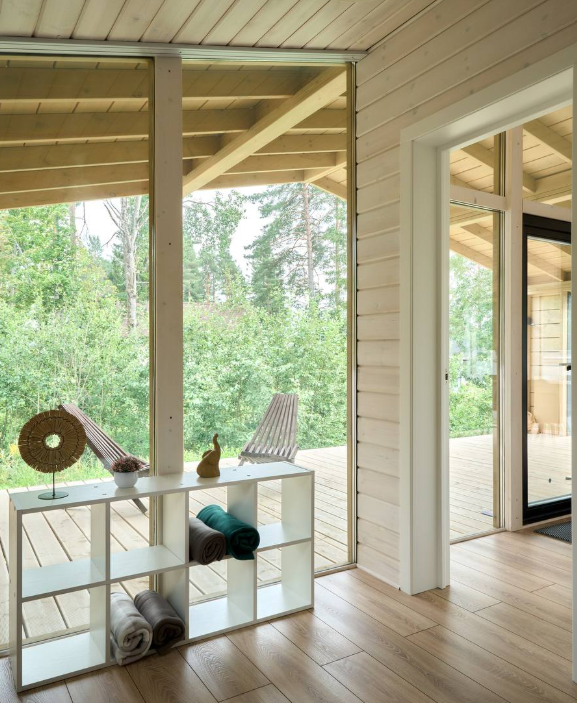 Дом Луна с баней в пешей доступности от озера для семейного отдыха, с полной отделкой и мебелью, панорамными окнами, камином, просторной террасой, закрытой территорией. Две спальни с двуспальными кроватями, кухня-гостиная с раскладным диваном и камином.