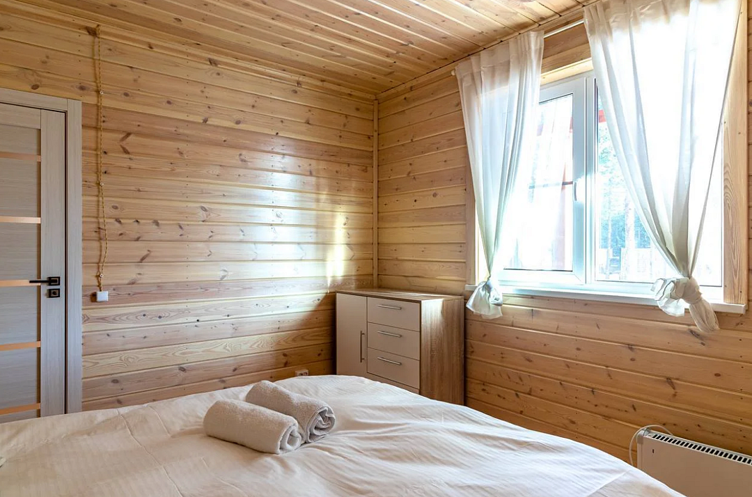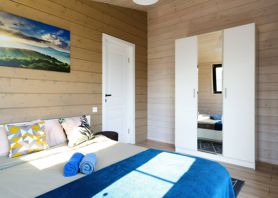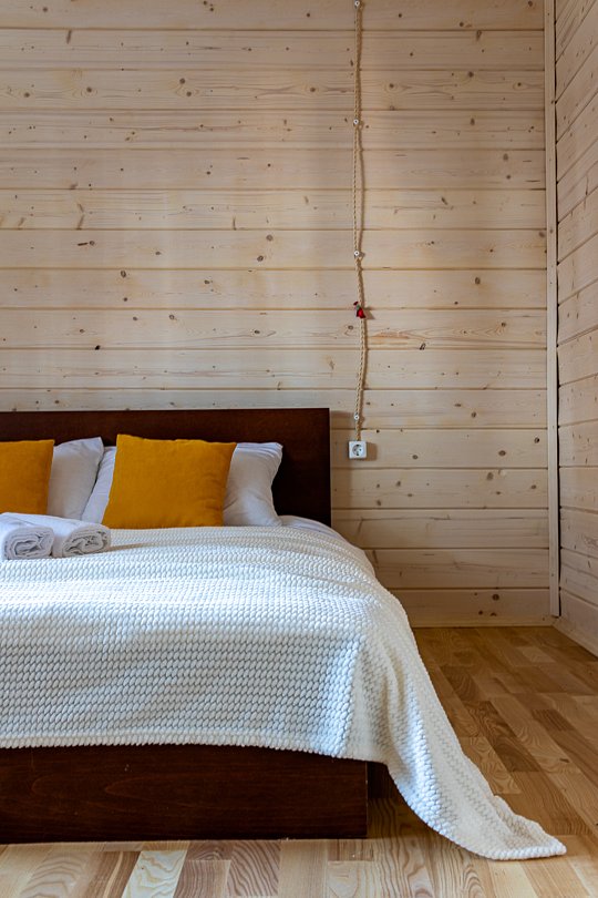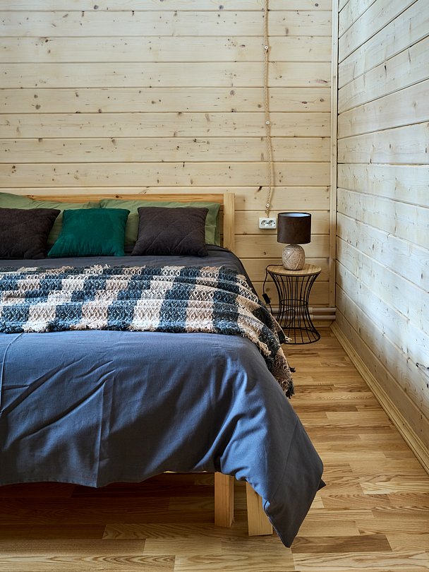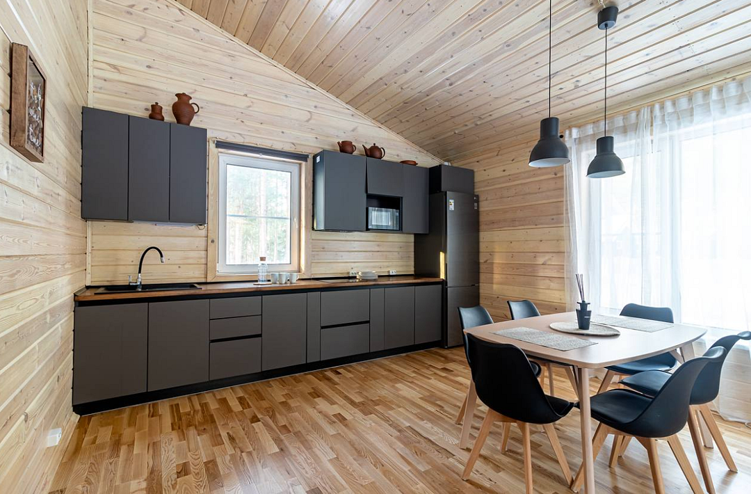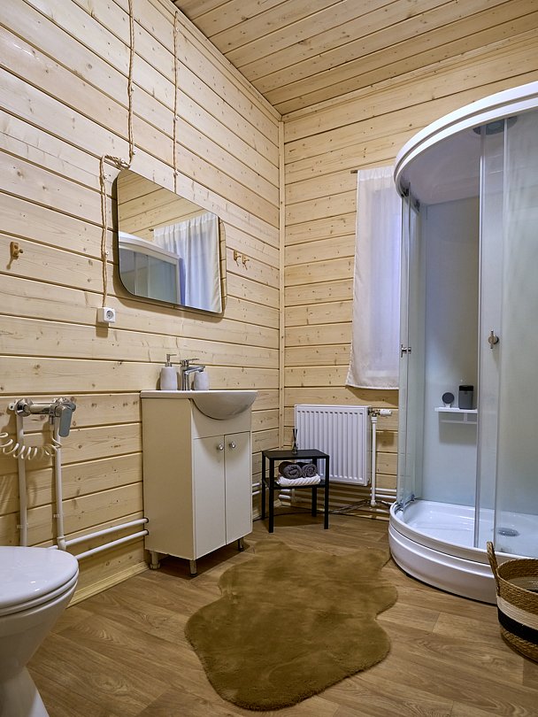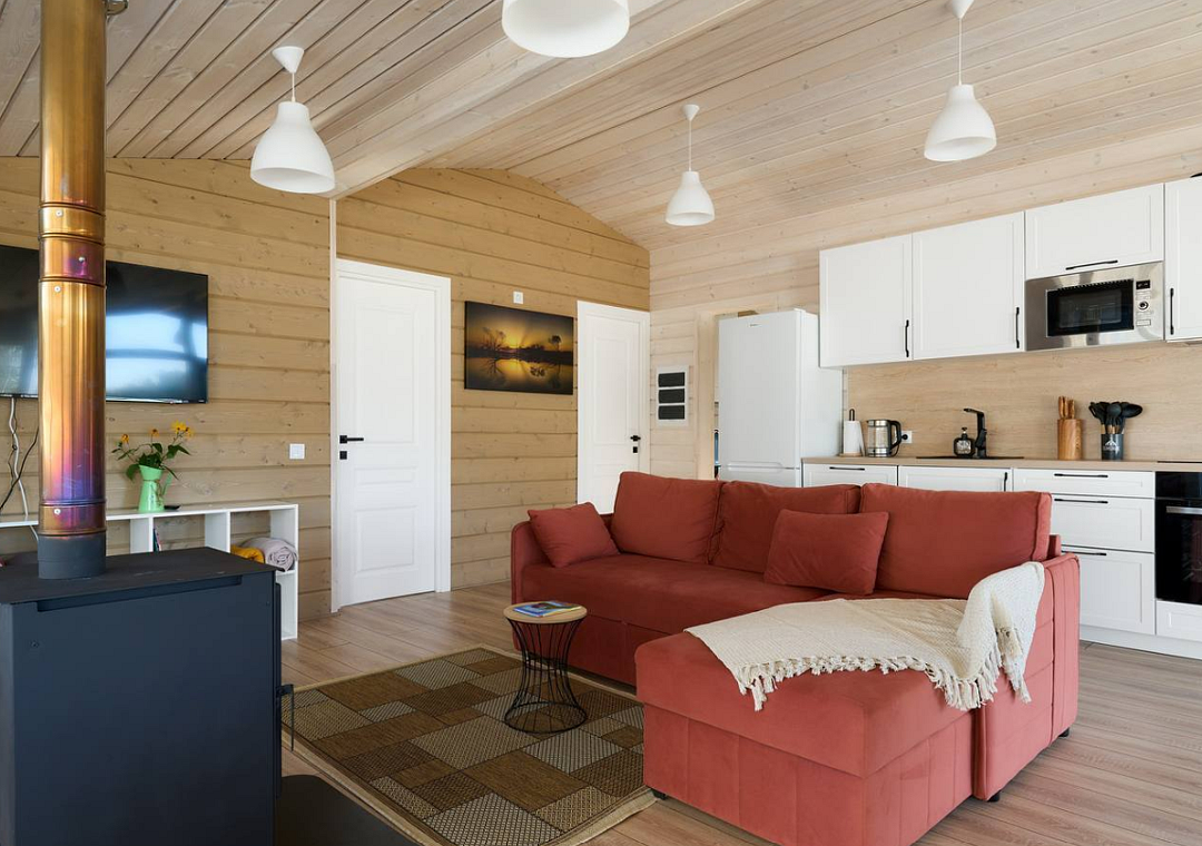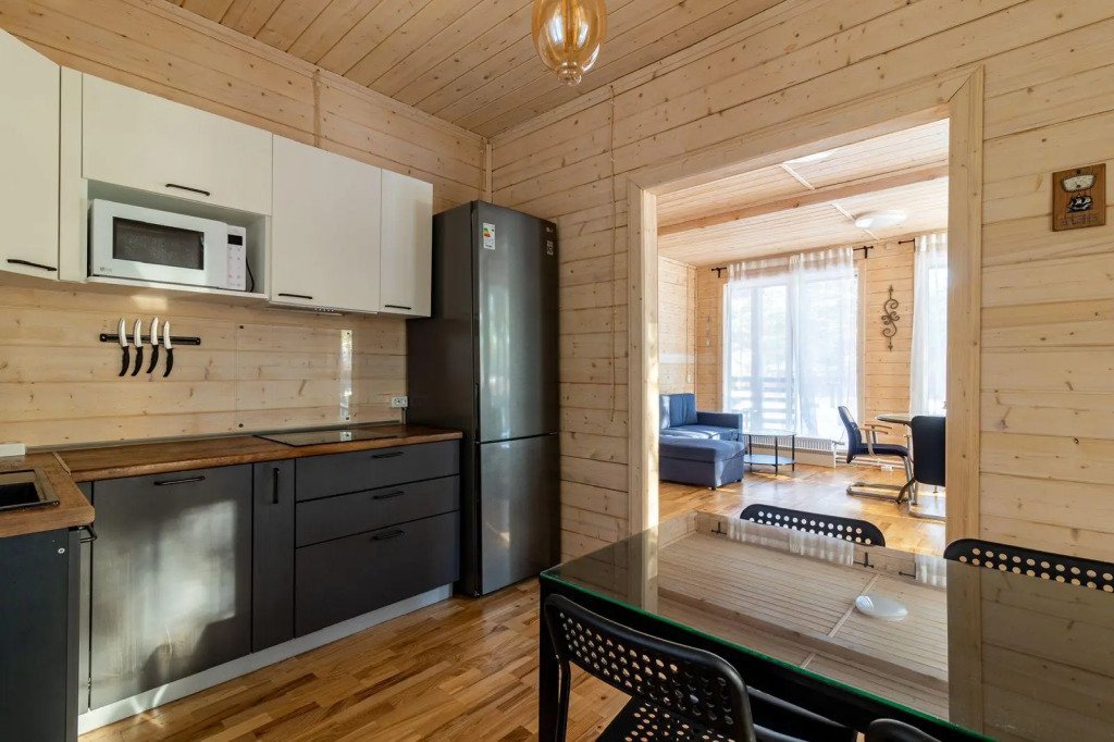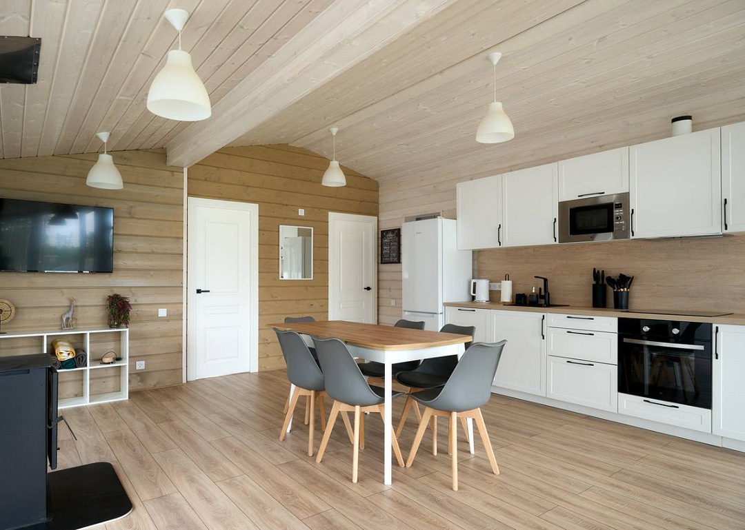 В доме для отдыха две отдельные спальни с двуспальными кроватями, гостевая комната с раскладным диваном, санузел с ванной. Кухня-гостиная с камином добавит вечером уюта и тепла. Дом комфортно разместит семью или компанию друзей до 6-8 человек.