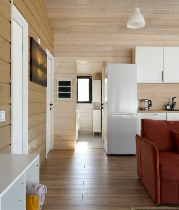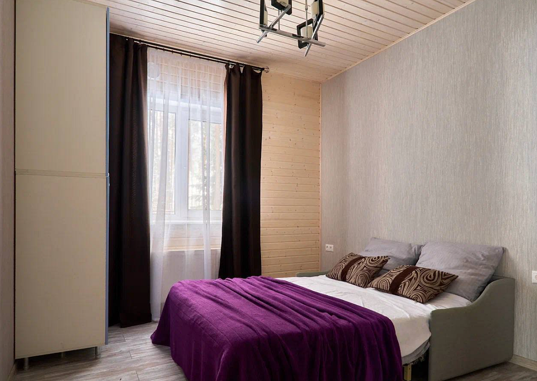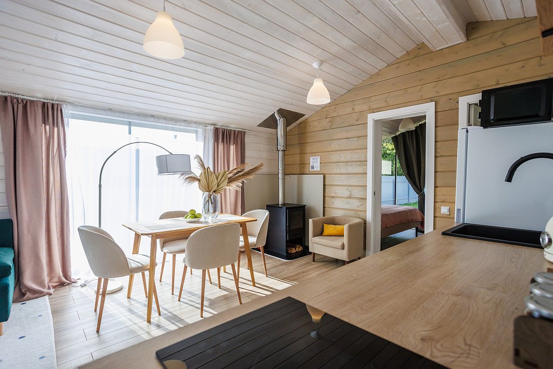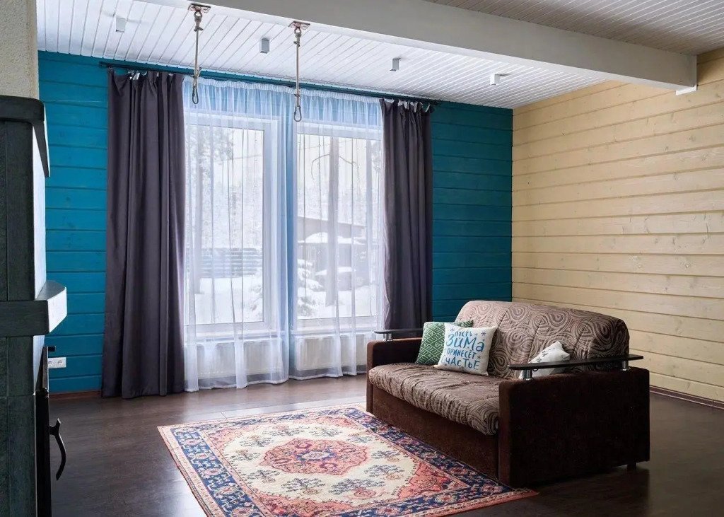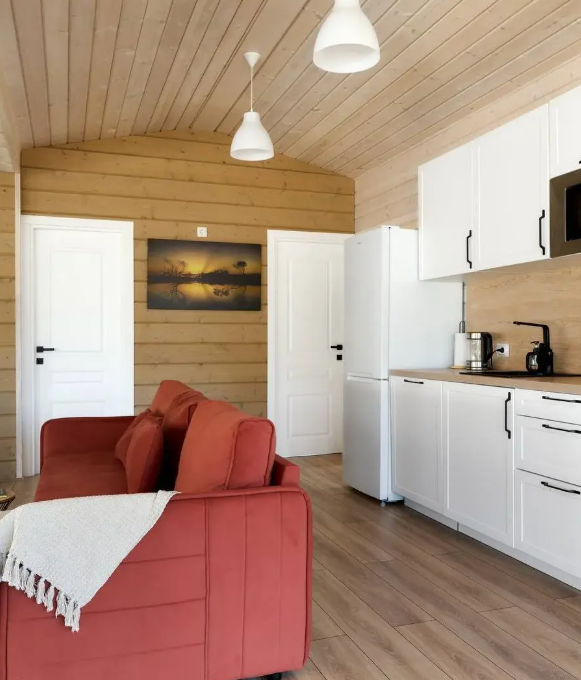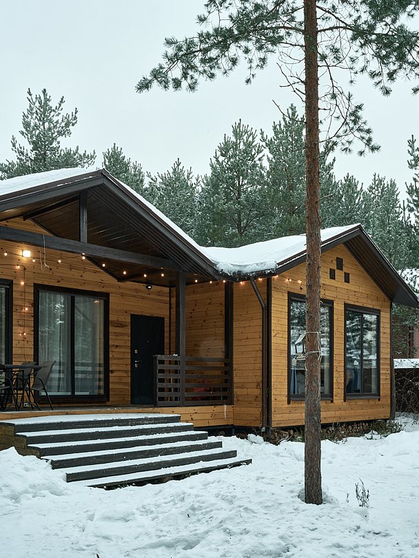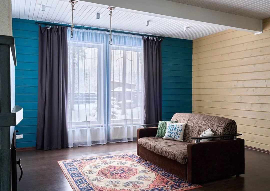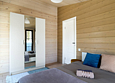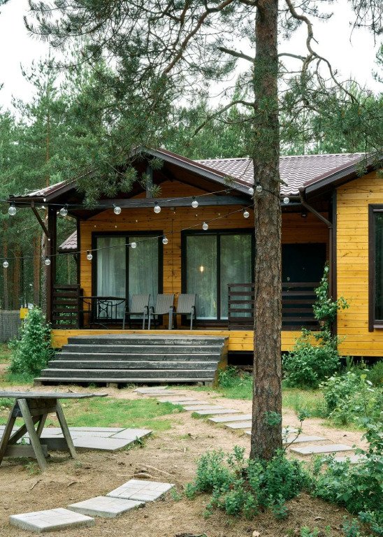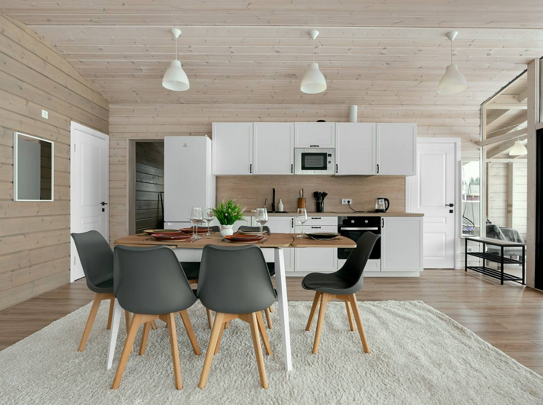 В доме для отдыха две отдельные спальни с двуспальными кроватями, гостевая комната с раскладным диваном, санузел с ванной. Кухня-гостиная с камином добавит вечером уюта и тепла. Дом комфортно разместит семью или компанию друзей до 6-8 человек.