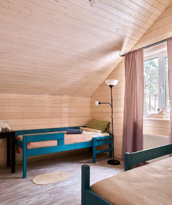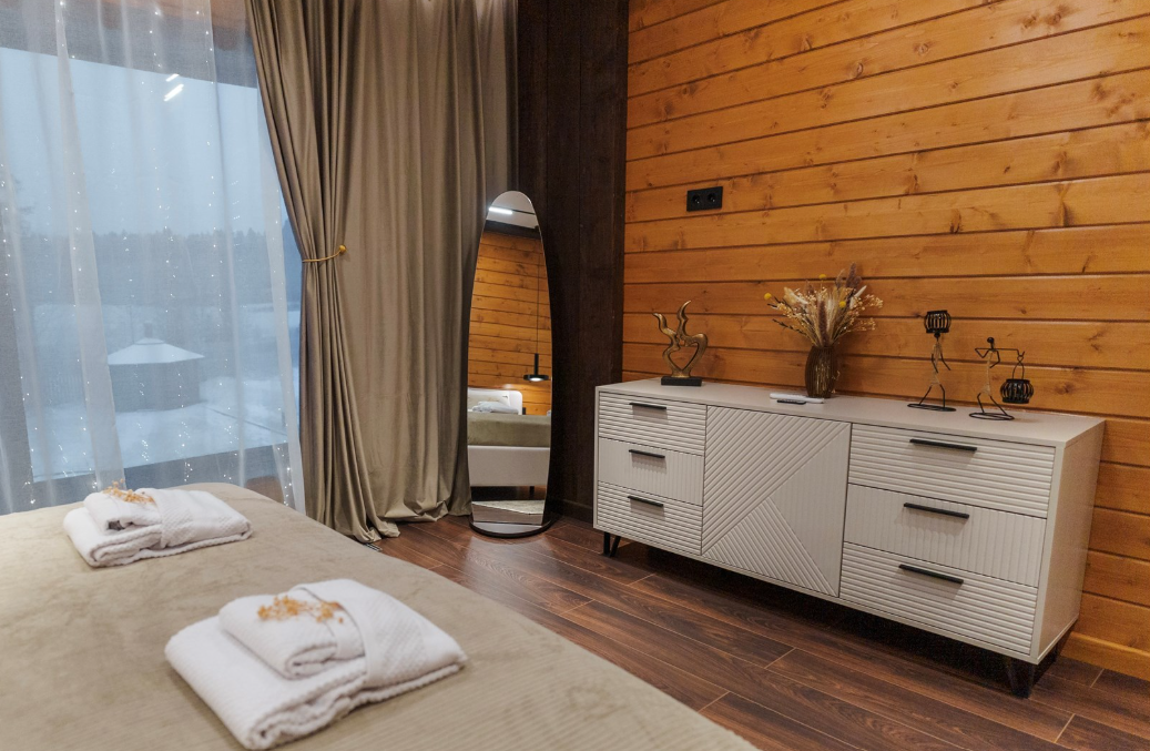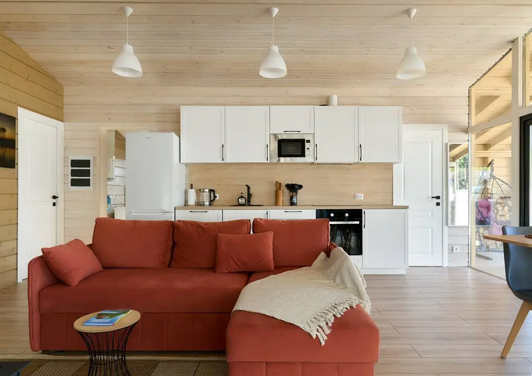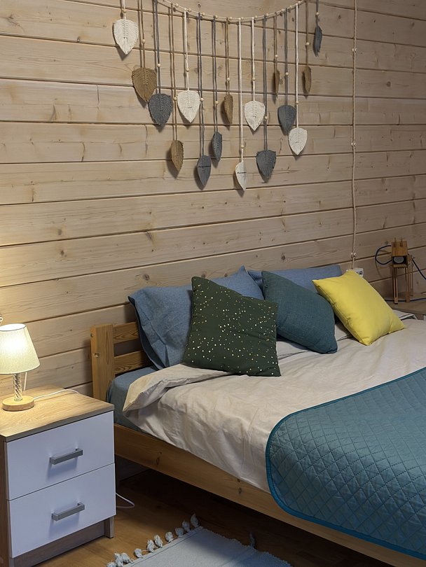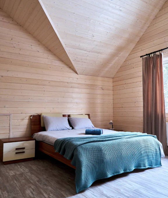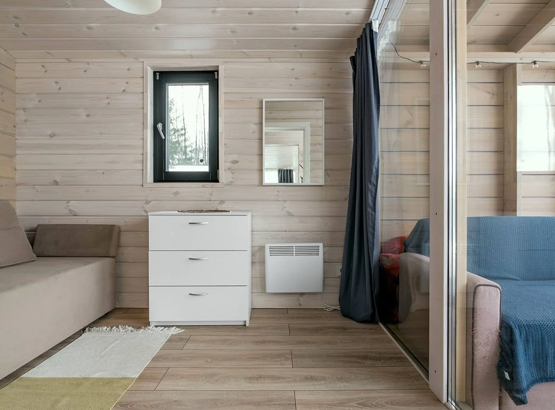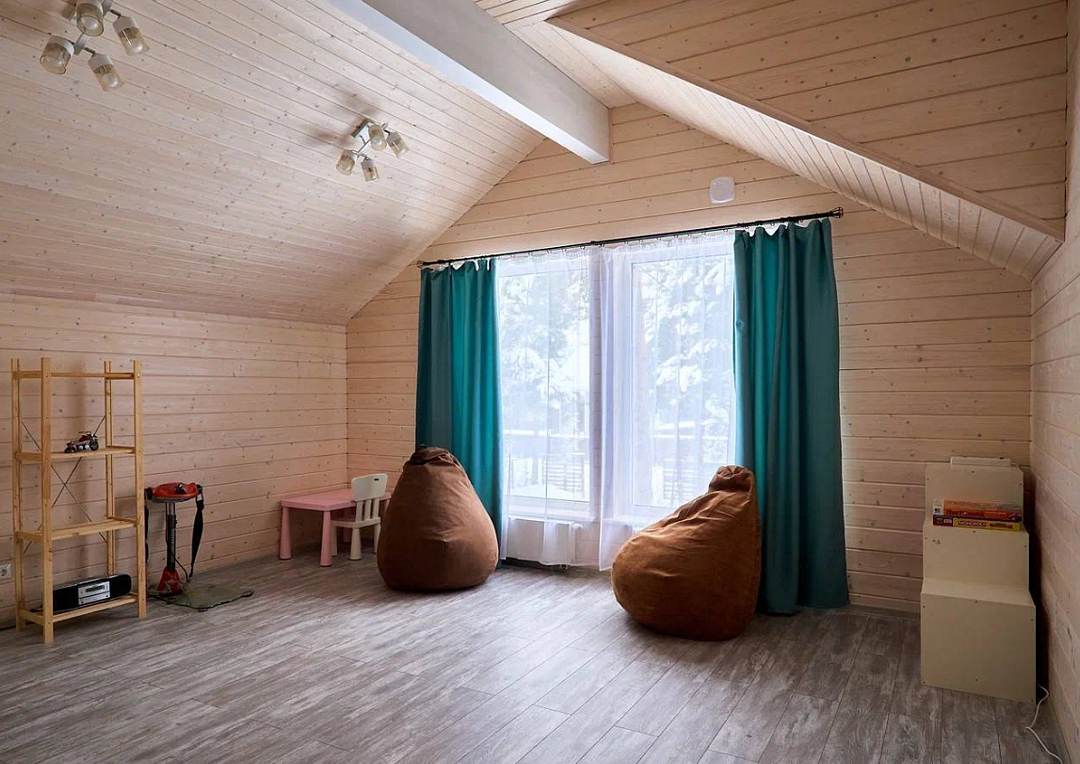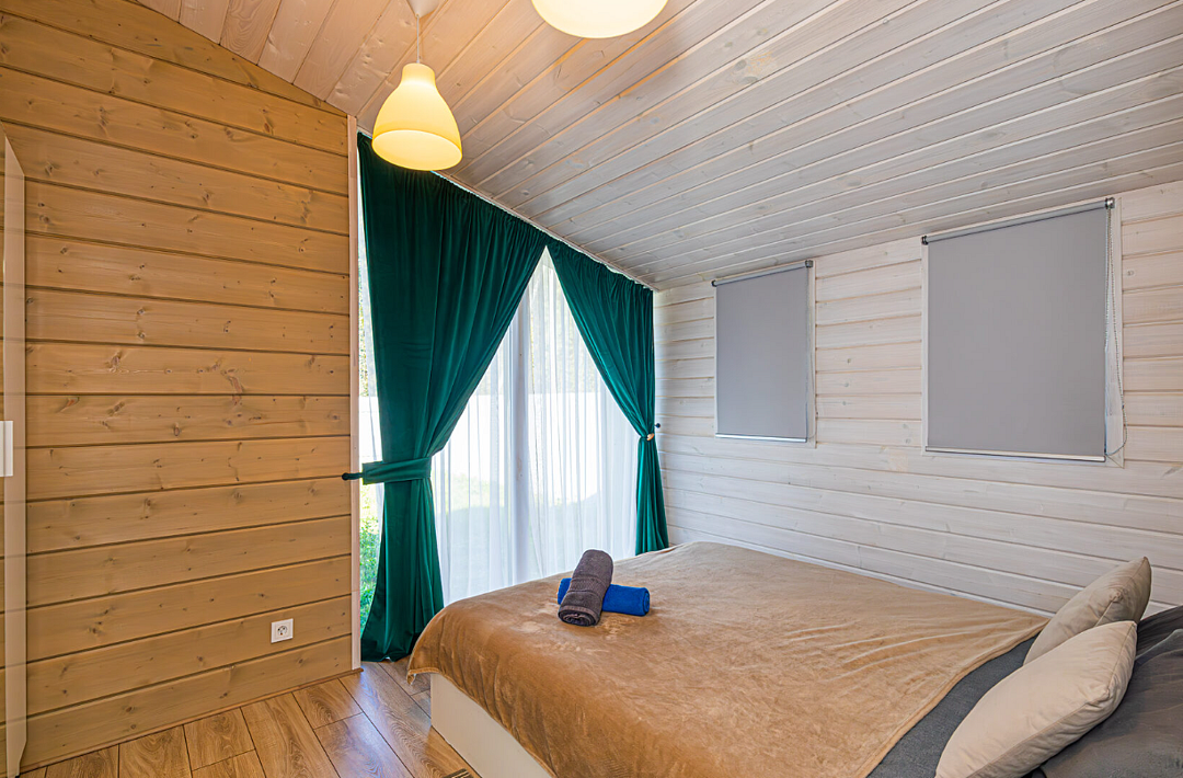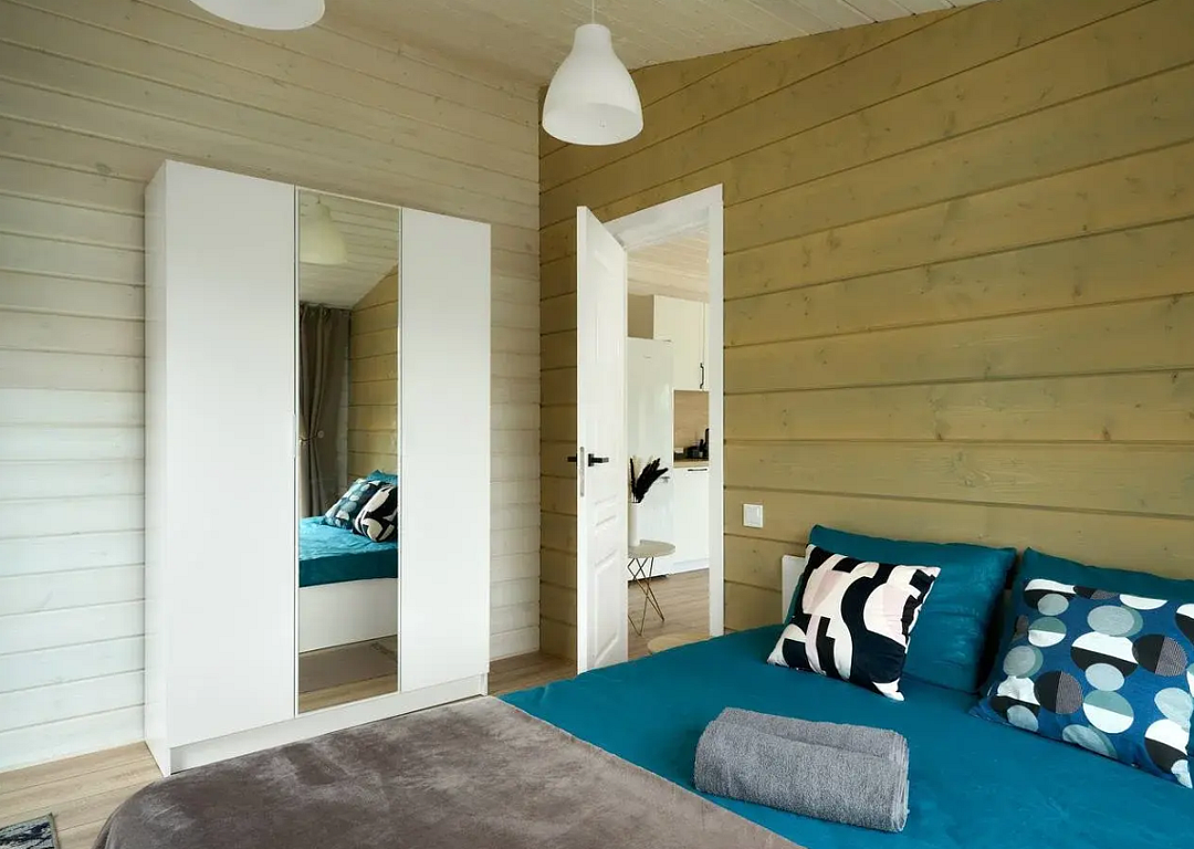В доме для отдыха две отдельные спальни с двуспальными кроватями, гостевая комната с раскладным диваном, санузел с ванной. Кухня-гостиная с камином добавит вечером уюта и тепла. Дом комфортно разместит семью или компанию друзей до 6-8 человек.