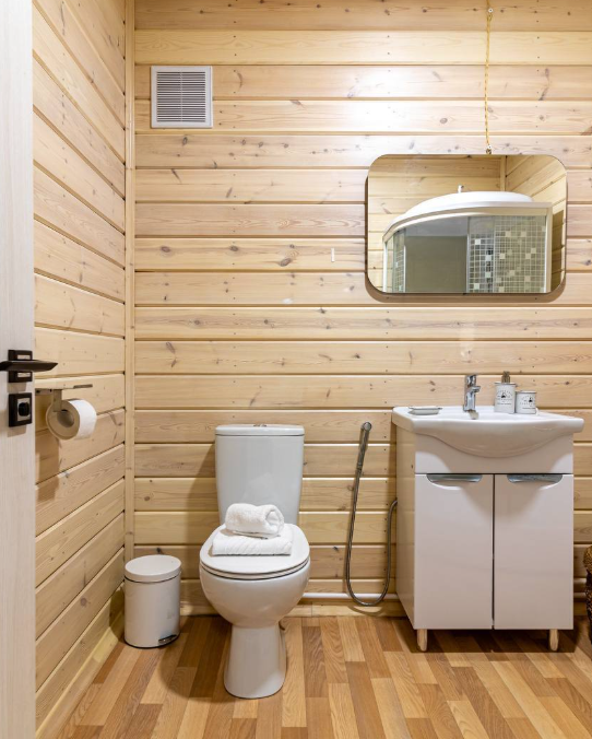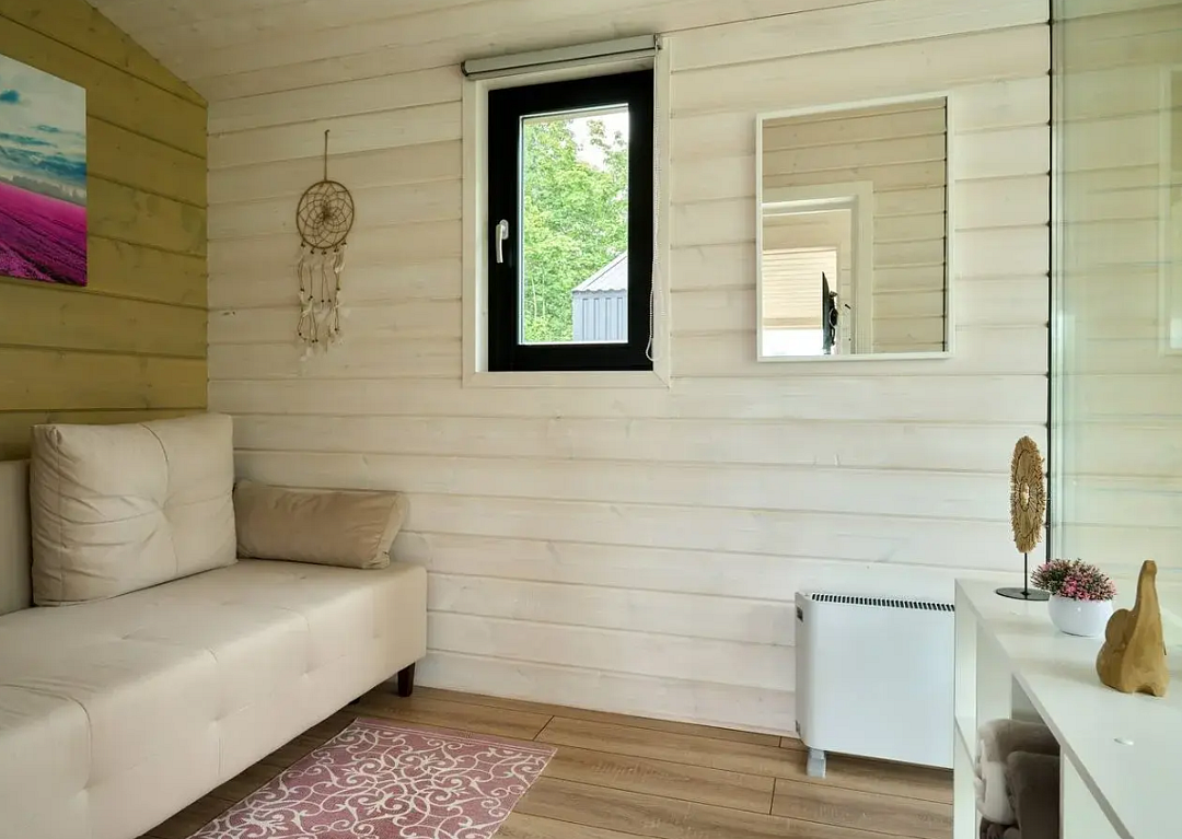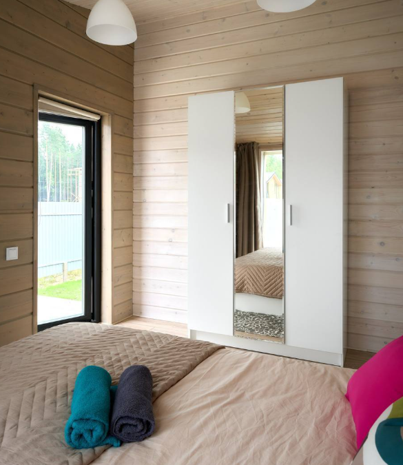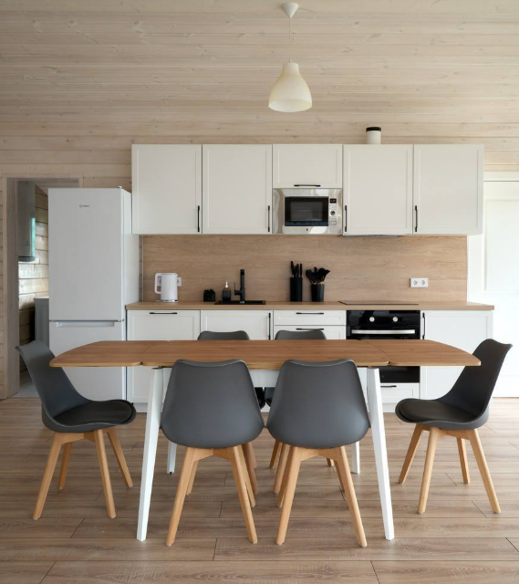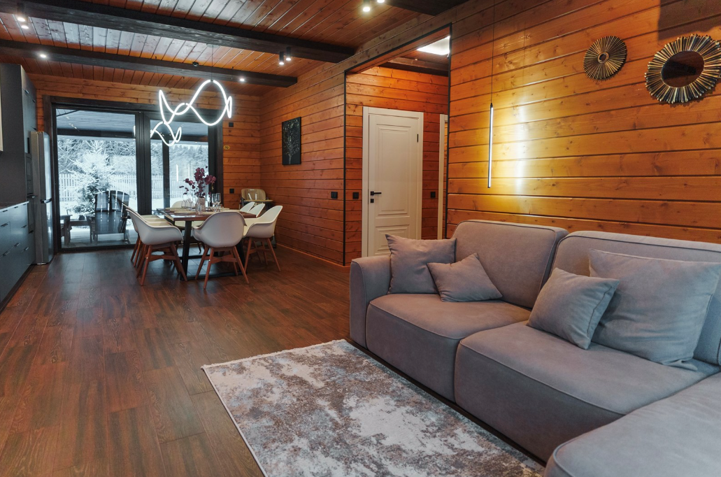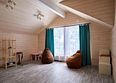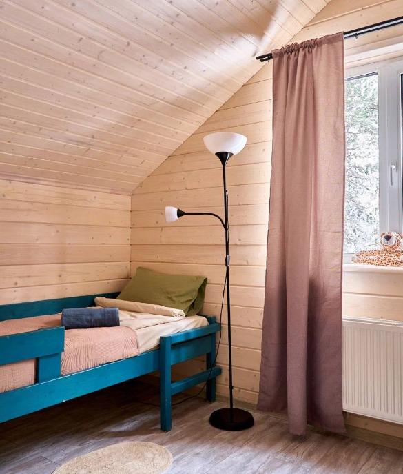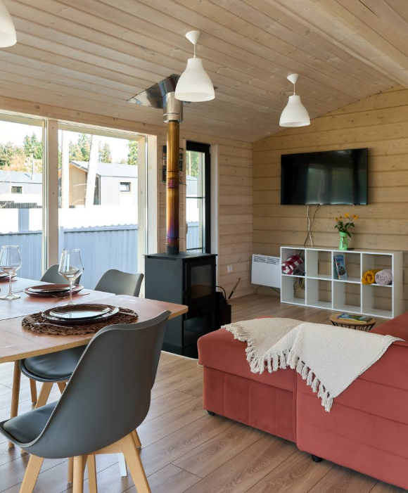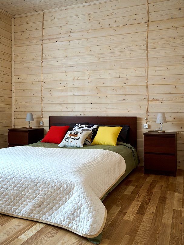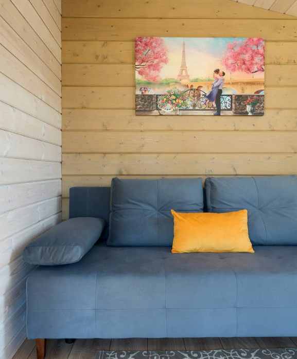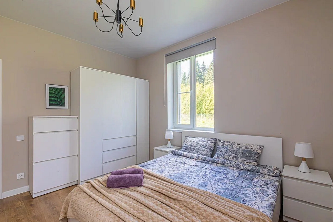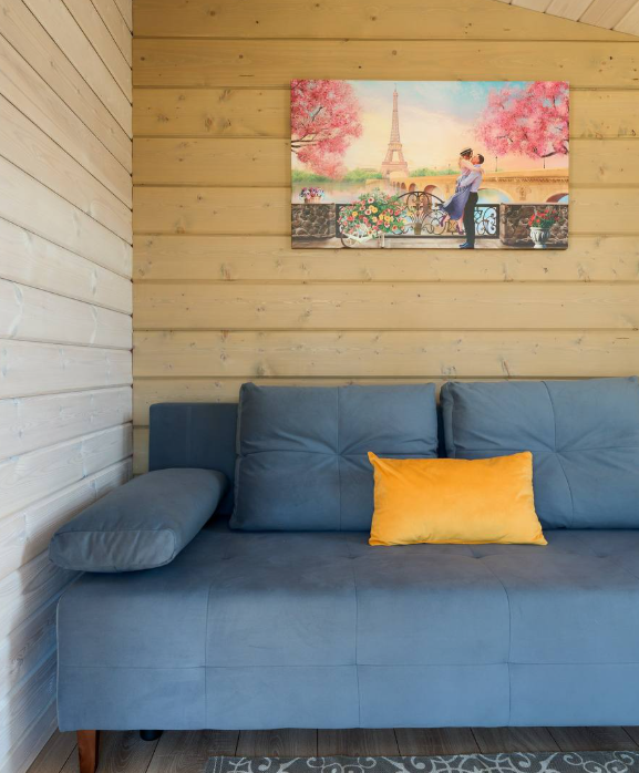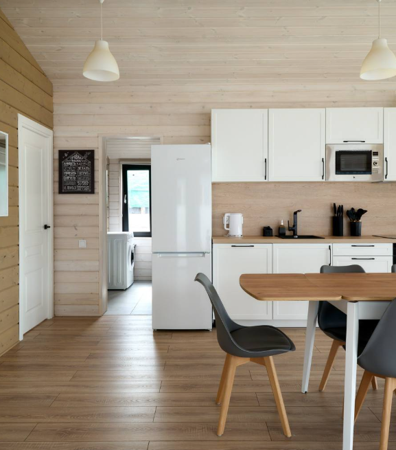 В доме для отдыха две отдельные спальни с двуспальными кроватями, гостевая комната с раскладным диваном, санузел с ванной. Кухня-гостиная с камином добавит вечером уюта и тепла. Дом комфортно разместит семью или компанию друзей до 6-8 человек.