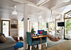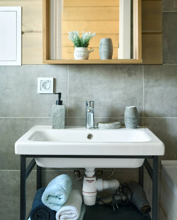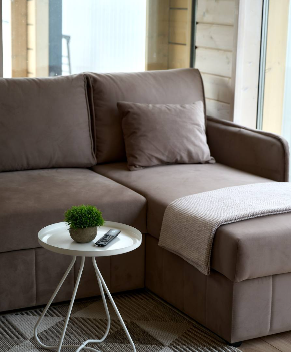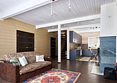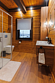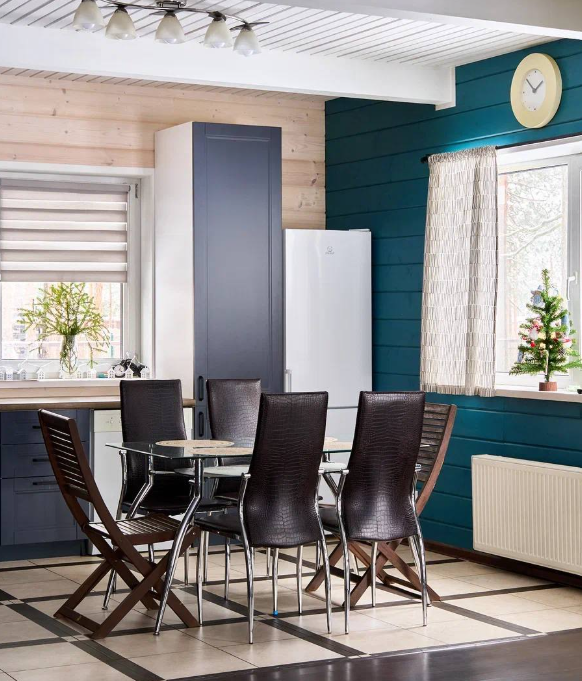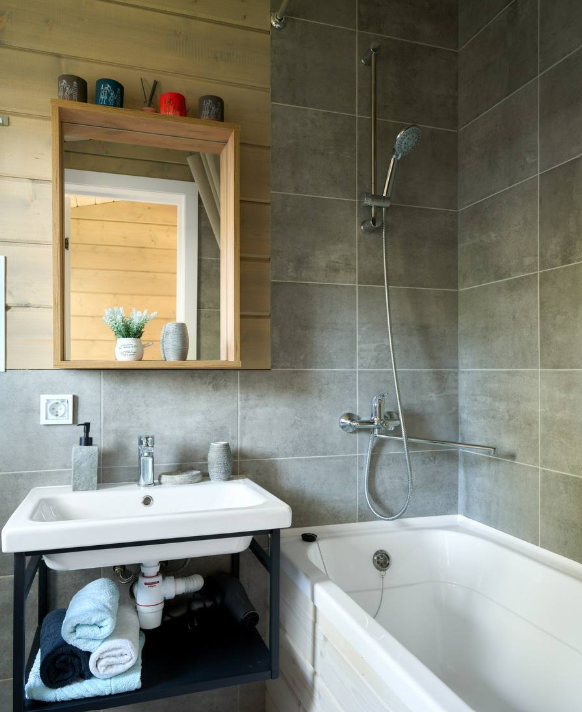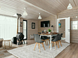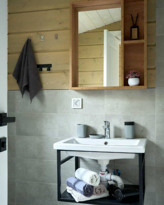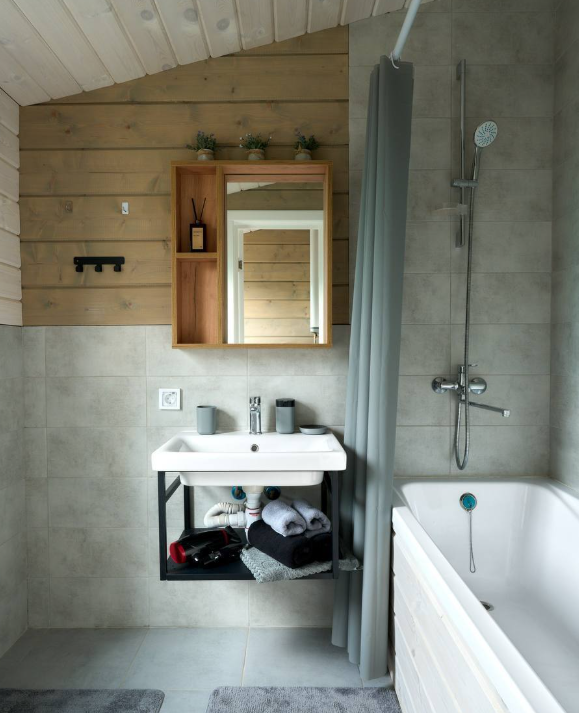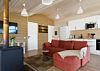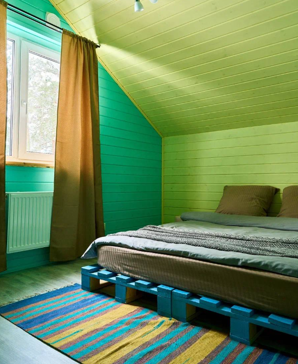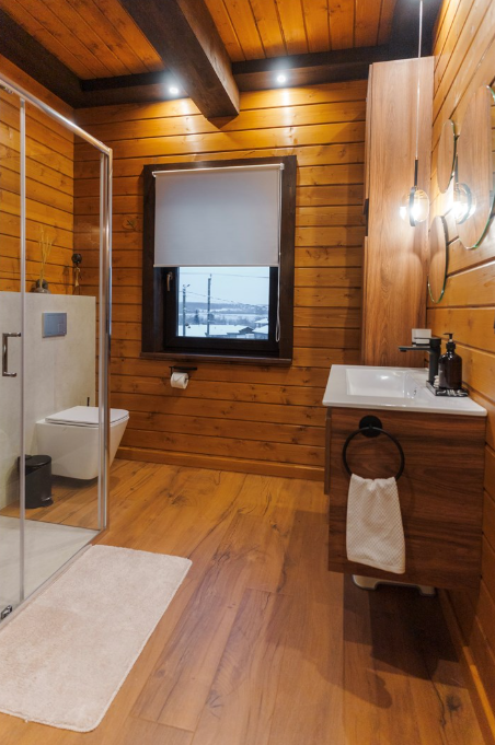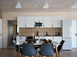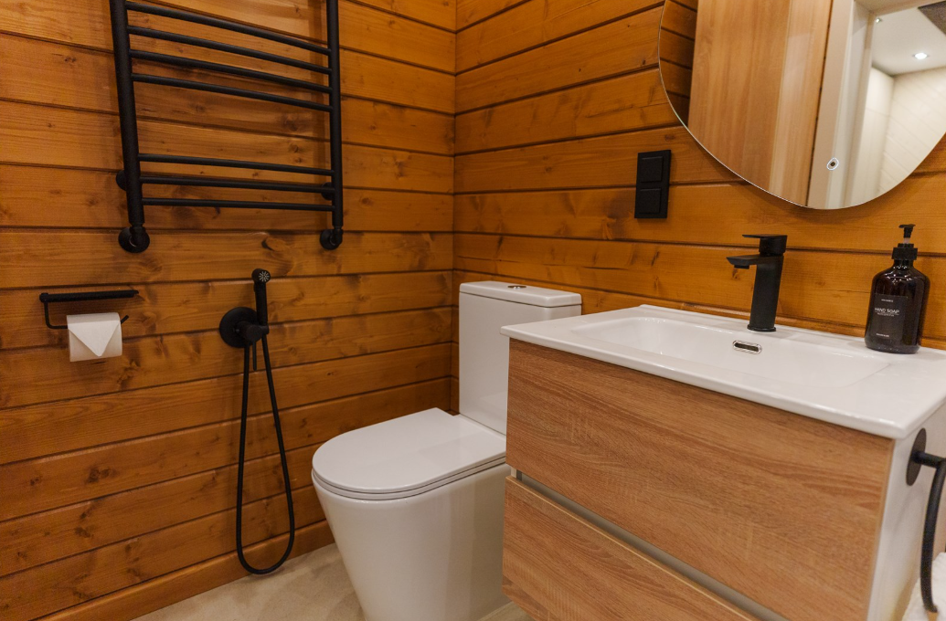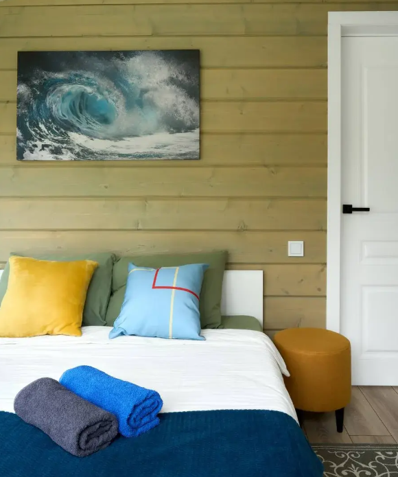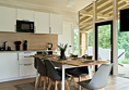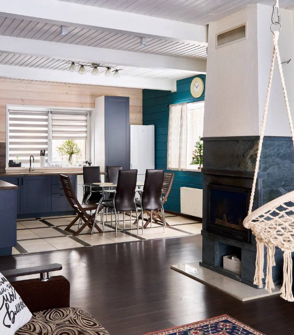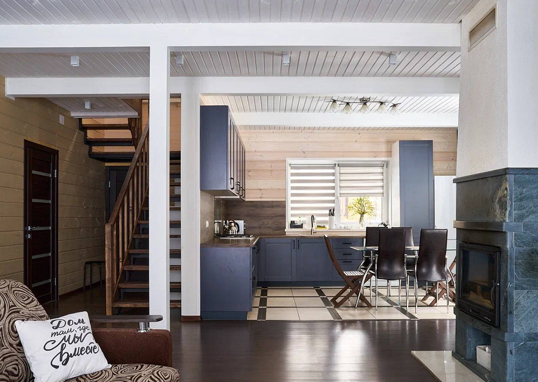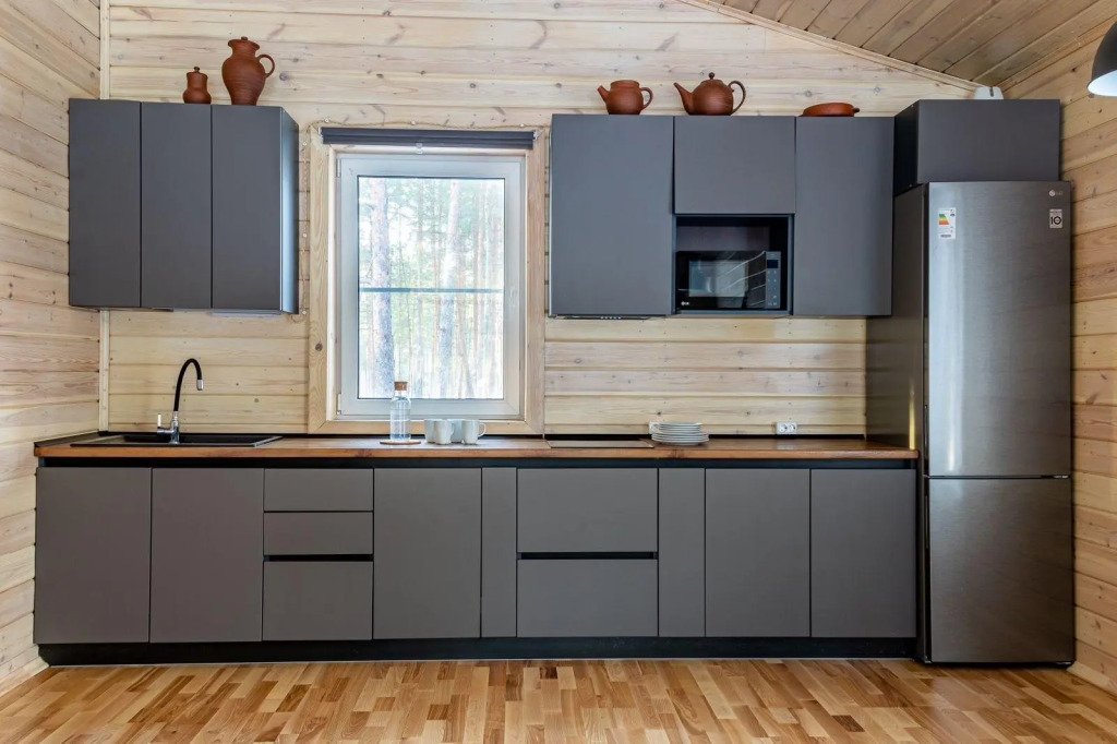 В доме для отдыха две отдельные спальни с двуспальными кроватями, гостевая комната с раскладным диваном, санузел с ванной. Кухня-гостиная с камином добавит вечером уюта и тепла. Дом комфортно разместит семью или компанию друзей до 6-8 человек.