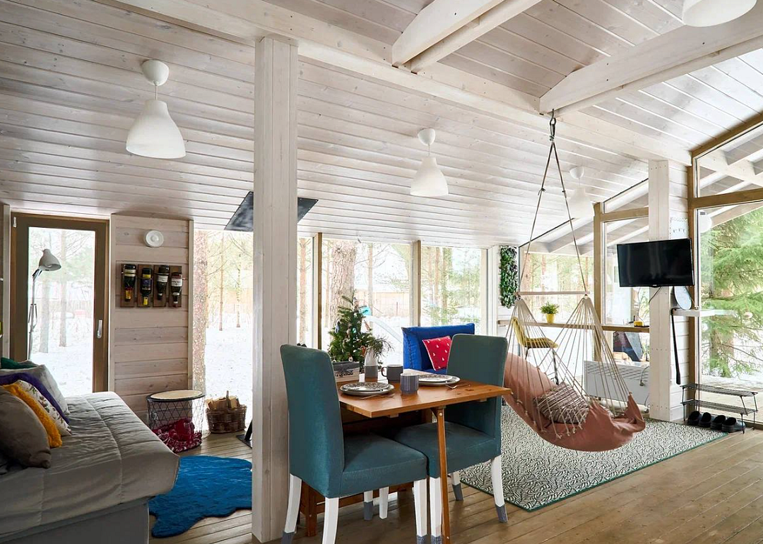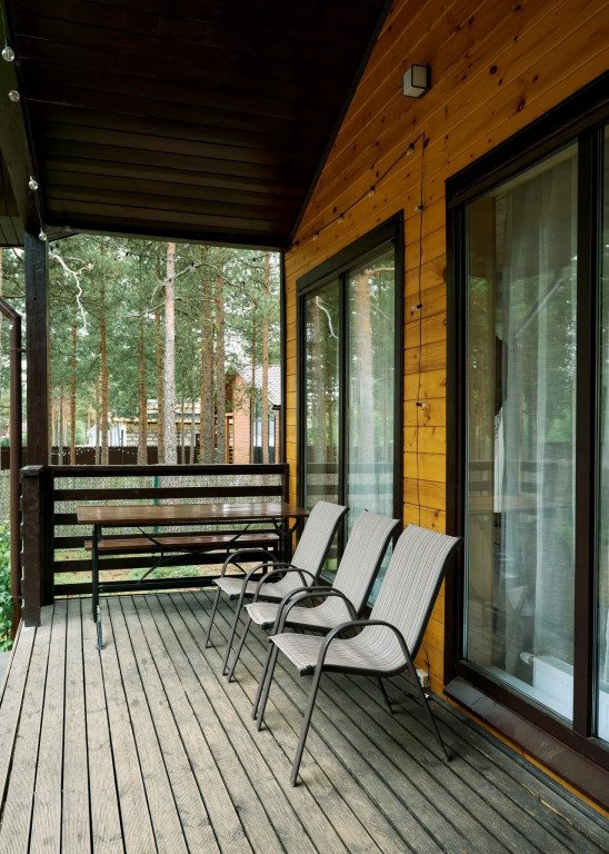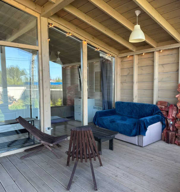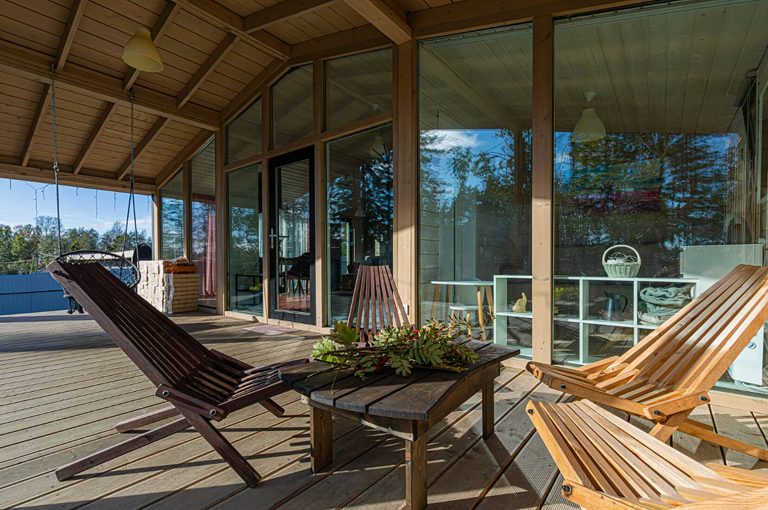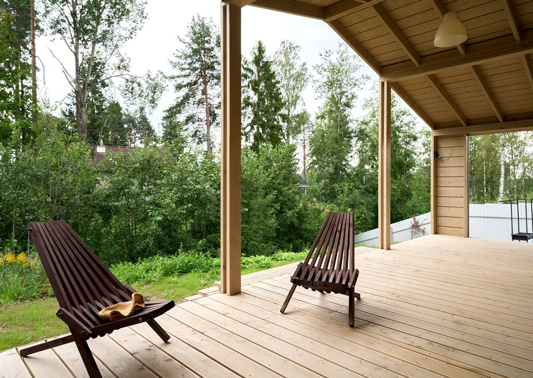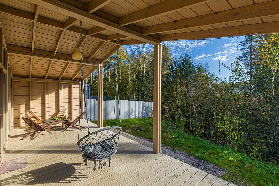 Дом Карела с двумя спальнями, гостевой комнатой с раскладным диваном, кухней-гостиной с обеденной зоной и камином, террасой с шезлонгами и качелью Расположен по адресу: Ленинградская область, г. Сертолово.