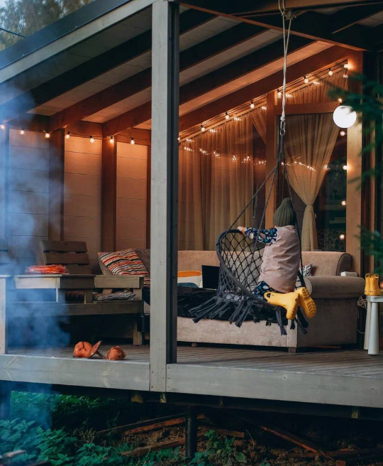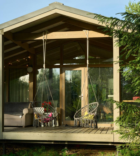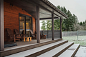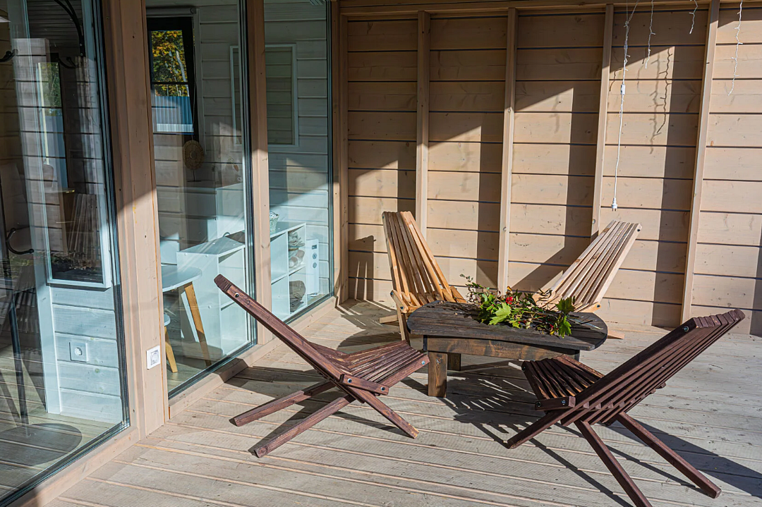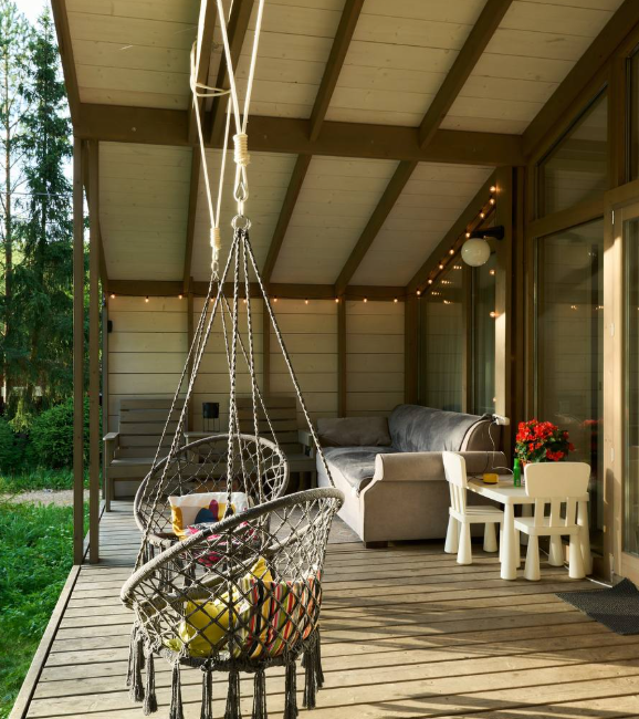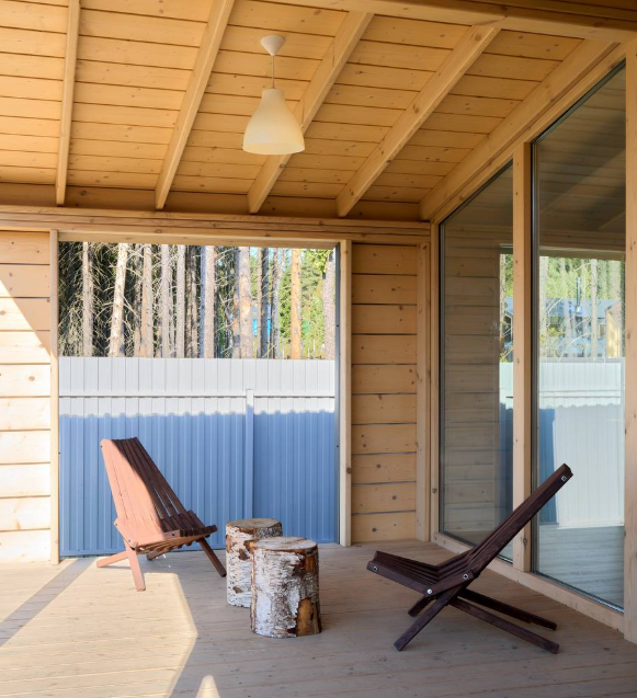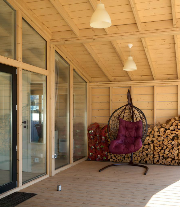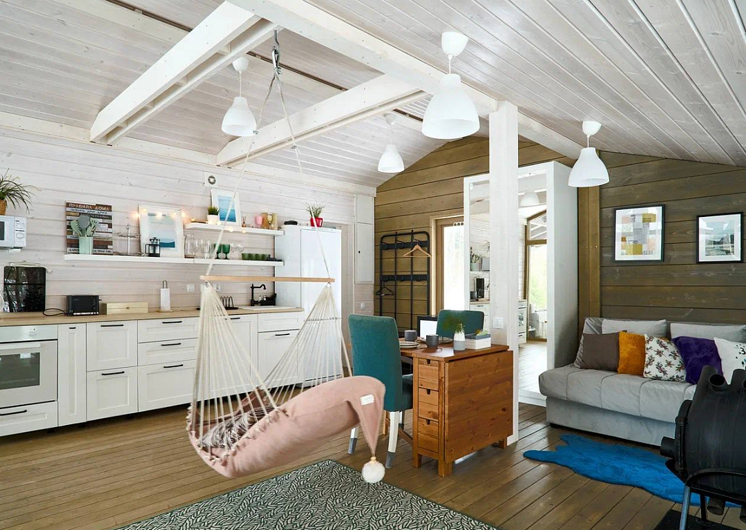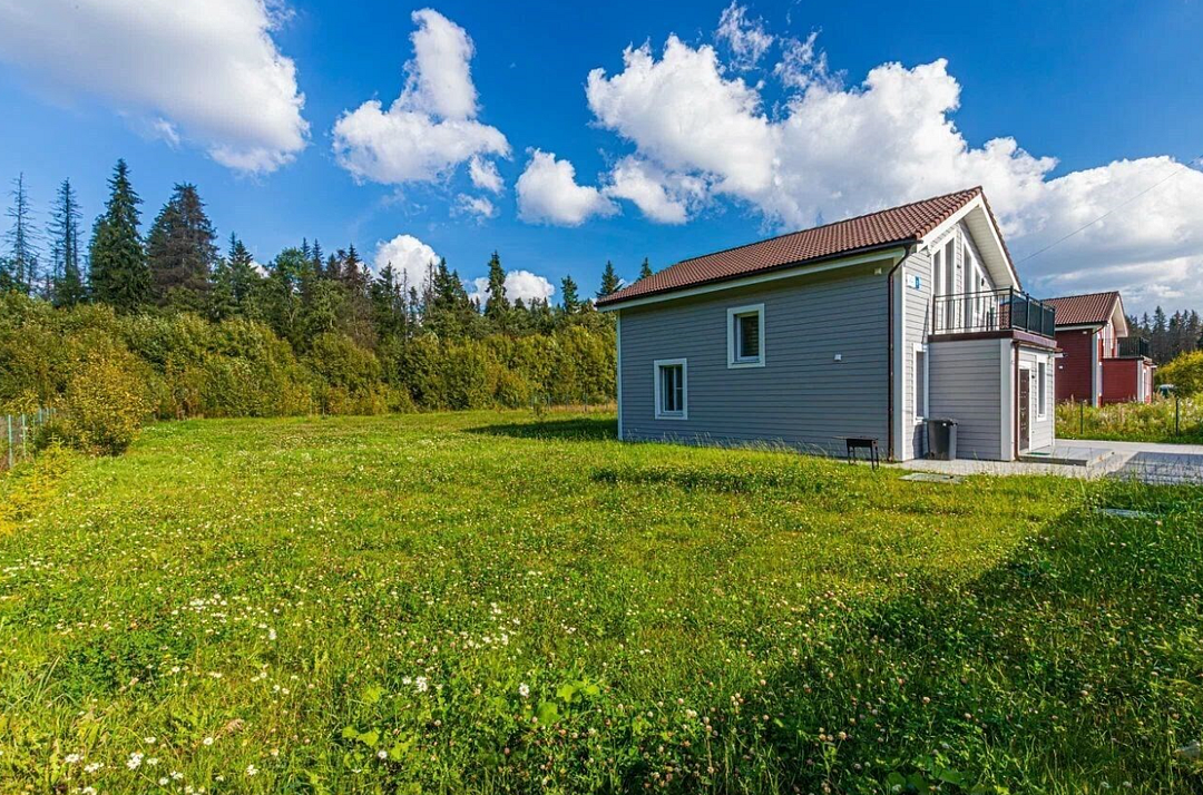 Дом Карела с двумя спальнями, гостевой комнатой с раскладным диваном, кухней-гостиной с обеденной зоной и камином, террасой с шезлонгами и качелью Расположен по адресу: Ленинградская область, г. Сертолово.