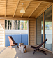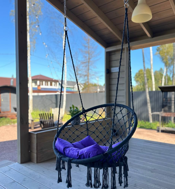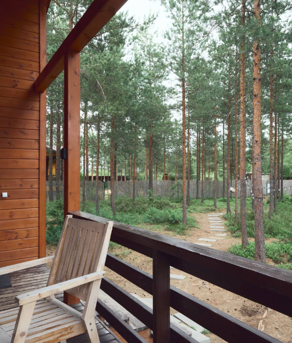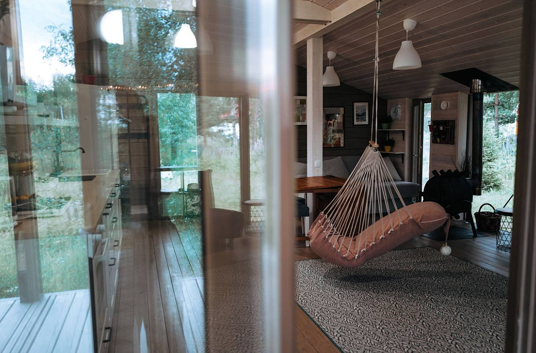 Дом Хвоя с двумя спальнями, гостевой комнатой с раскладным диваном, кухней-гостиной с камином, террасой с шезлонгами и качелью и видом на ручей. На участке баня на дровах. В 200 метрах от дома находится озеро, конюшня, лес для прогулок, детская площадка.