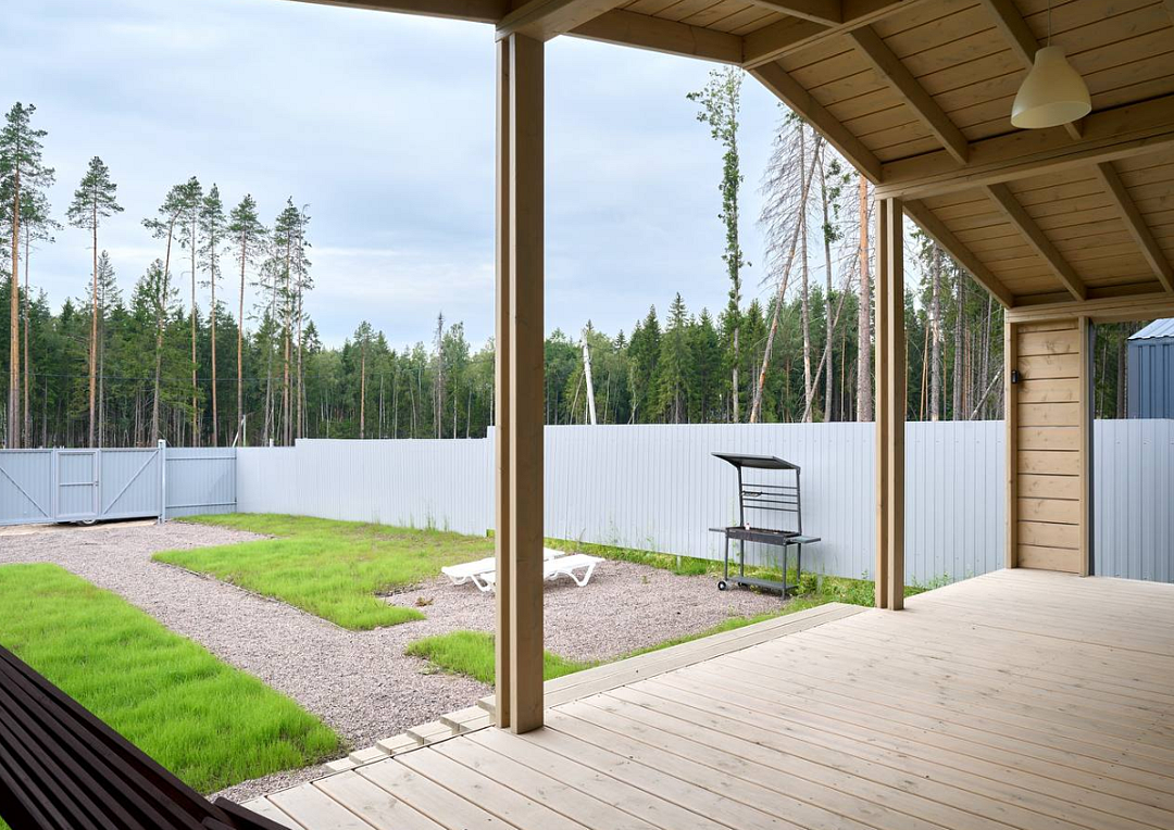 Дом Лахта с баней на дровах, двумя спальнями, гостевой комнатой, кухней-гостиной с камином, террасой с мебелью и качелью. В пешей доступности озеро и конюшня.