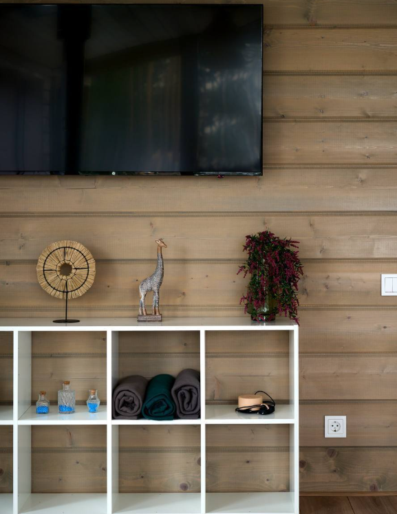 К услугам гостей 2 телевизора. Можно собраться всем вместе возле уютного камина, устроить банные процедуры в дровяной баньке или вкусный ужин с приготовленными на мангале продуктами. На кухне есть все необходимое для удобства – встроенная кухня с техникой, духовой шкаф, микроволновая печь, посудомоечная машина, набор посуды и бокалов.