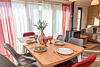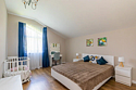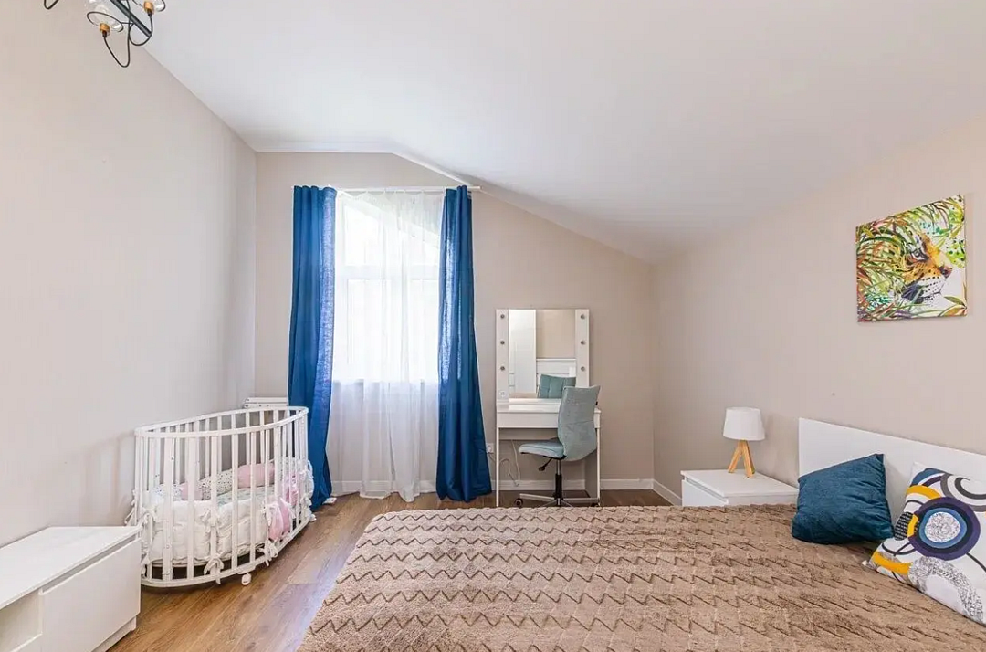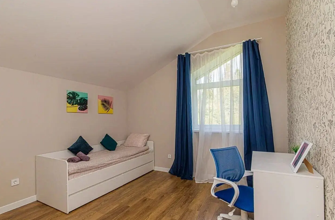 Две спальни с двуспальными кроватями, две спальни — детские с односпальными кроватями, кухня-гостиная — есть где разместиться гостям в количестве до 8 человек.