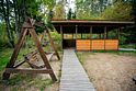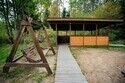 На улице — зона отдыха с мангалом, очагом для костра, столом и деревянными качелями.
