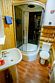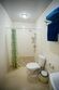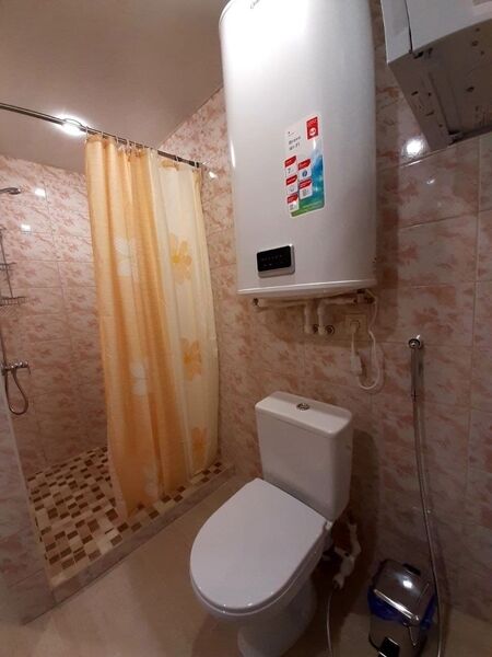 Санузел — душевая кабина, туалет, раковина, туалетная бумага.