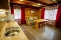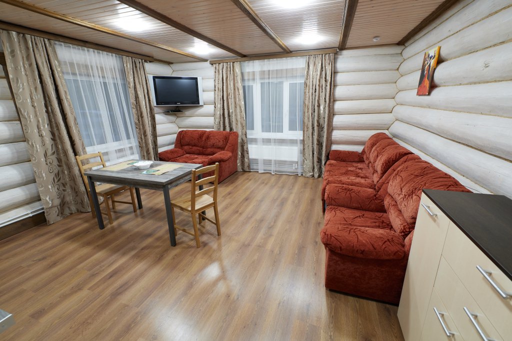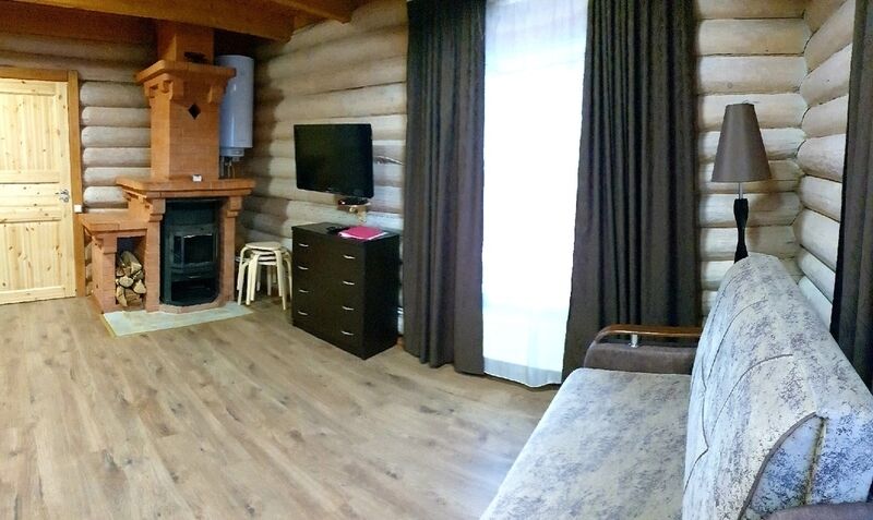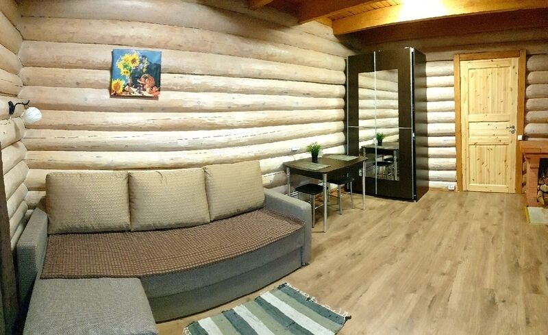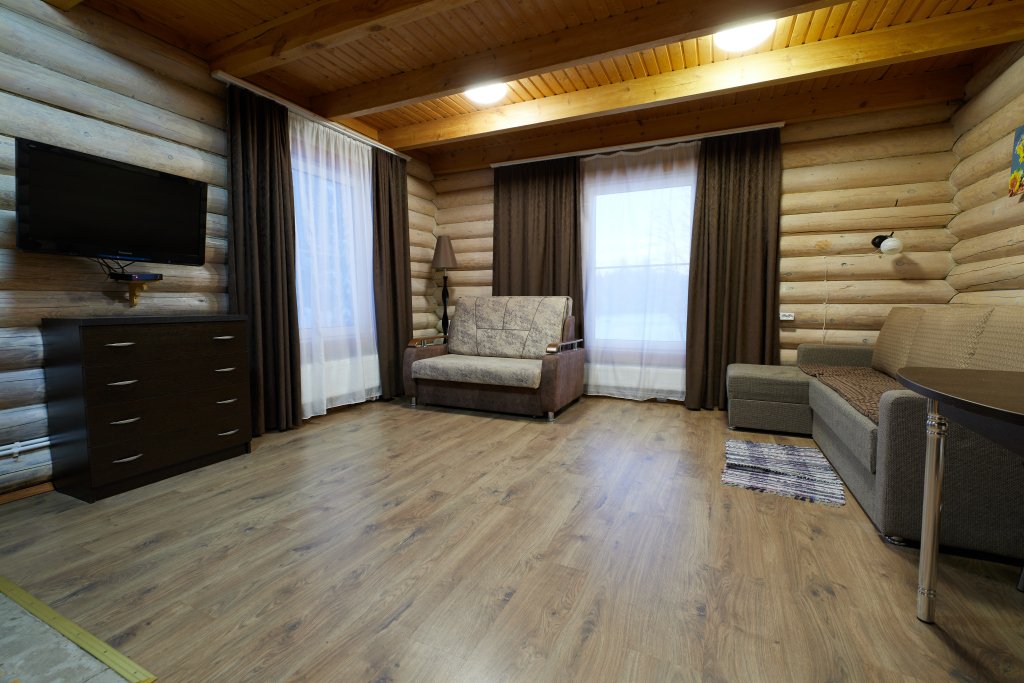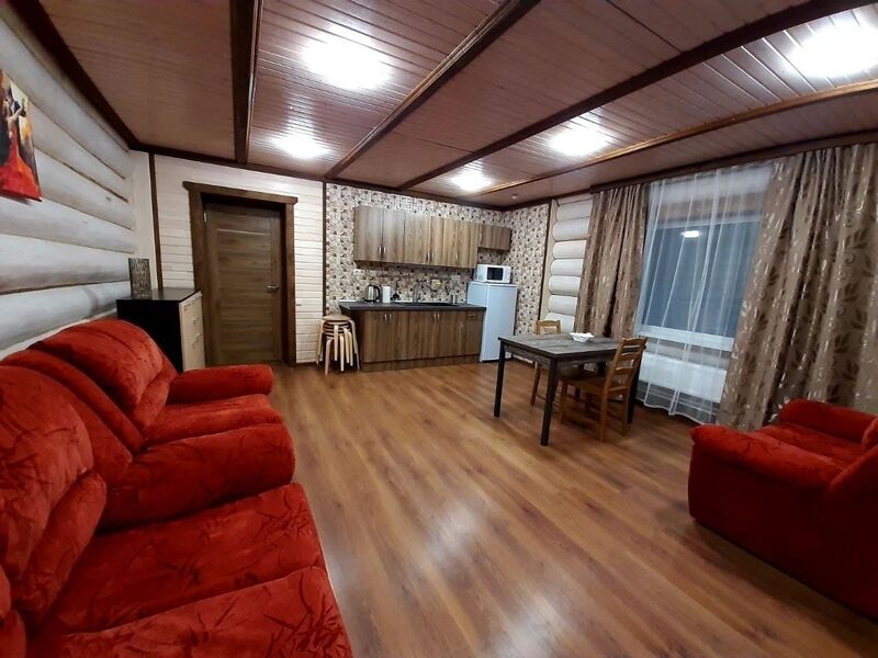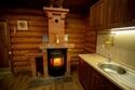 Кухня-гостиная с раскладным диваном, обеденным столом, камином, спутниковым TV. Есть холодильник, микроволновка, электрический чайник.