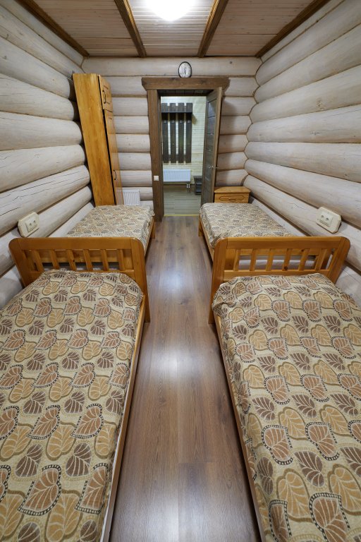 Комната №2 с двумя односпальным кроватями, комодом, столом, табуретками и вешалкой для одежды.