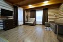 Гостиная с раскладным диваном, мини-кухней, столом и спутниковым TV.