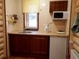 Гостиная с раскладным диваном, мини-кухней (холодильник, микроволновка, электрический чайник), столом и спутниковым TV.