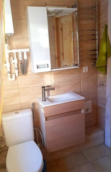 1 этаж. Спальня с тремя односпальными кроватями. Гостиная с двуспальным раскладным диваном, телевизором и мини-кухней (холодильник, микроволновка, электрический чайник). Санузел с душевой кабиной, туалетом, раковиной.