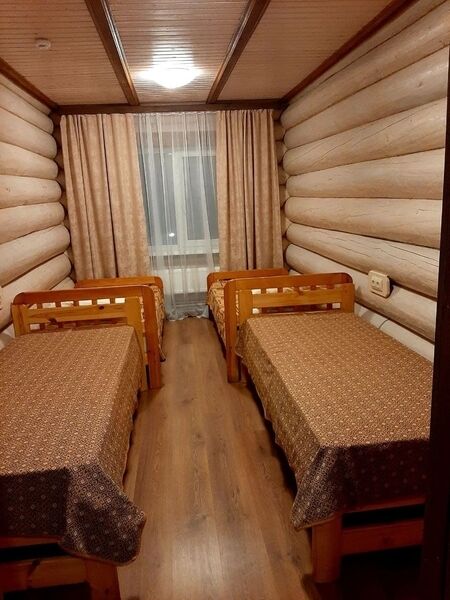 1 комната с четырьмя односпальными кроватями и тумбочками.