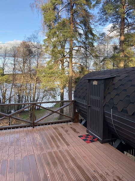 Современный красивый дом, укомплектованный всем необходимым, с кухонной зоной и маленькой сауной. Есть просторная терраса с видом на озеро. Четыре спальных места.