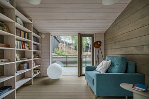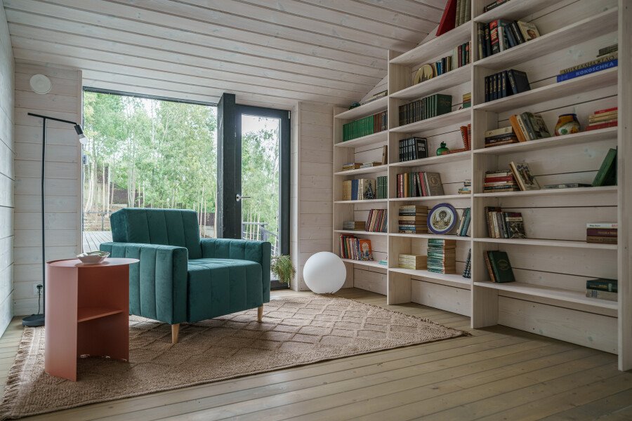 Просторный одноэтажный коттедж (77 кв.м.) — самый верхний из трех домов уникального проекта на склоне — «Три тома» прямо у Финского залива. Для тех, кто ценит покой и уединение, стиль и эстетику. В каждом доме пространства - полноценная библиотека — от классики до нон-фикшн.