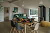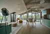 Панорамное остекление позволяет наслаждаться видами природы, создавая ощущение единства с окружающим миром. Дома пространства словно парят в воздухе, открывая вид на вековые сосны и залив.