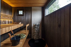 Сауна с панорамным окном доступна по предварительному бронированию.