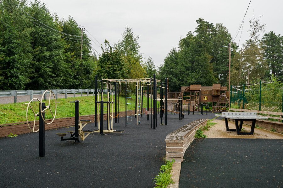 В десяти метрах от домов расположена детская площадка с теннисным столом. В нескольких минутах ходьбы находятся спортивные площадки для игры в баскетбол и футбол, а также батут.