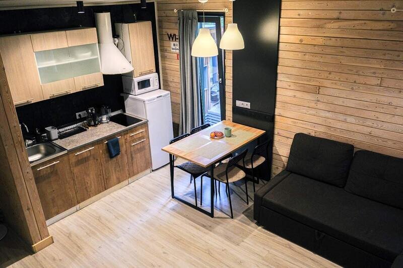 Несмотря на кажущийся с виду небольшой размер домика, в нем есть все необходимое даже для длительного пребывания: собственная кухня с плитой и холодильником, душ, удобная кровать, стол для приема пищи, комната для сушки лыж, системы хранения вещей.