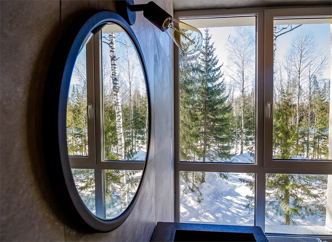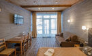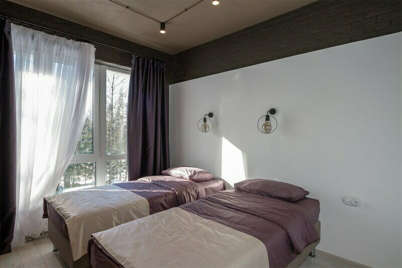 Светлый, угловой номер с панорамными окнами и выходом на террасу, а также прекрасным видом на склон СНТ "Черничное".