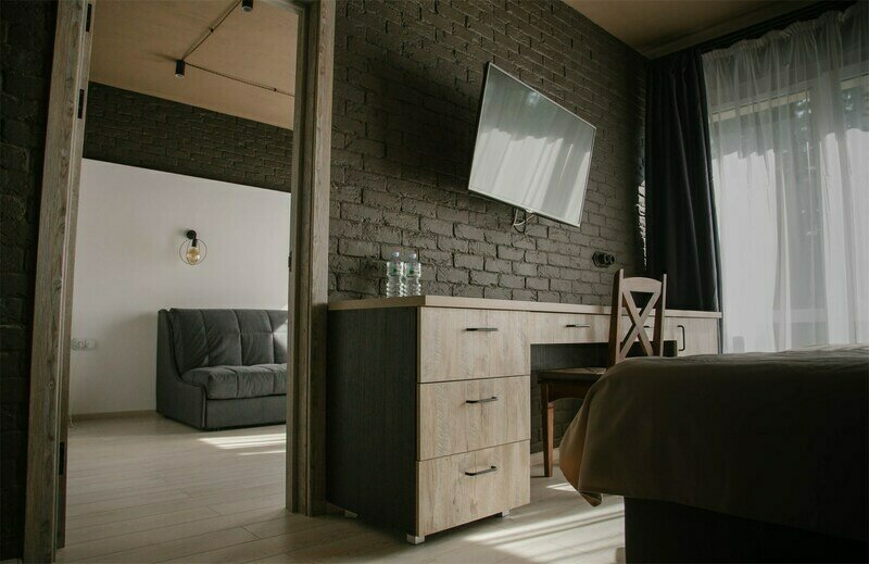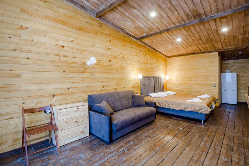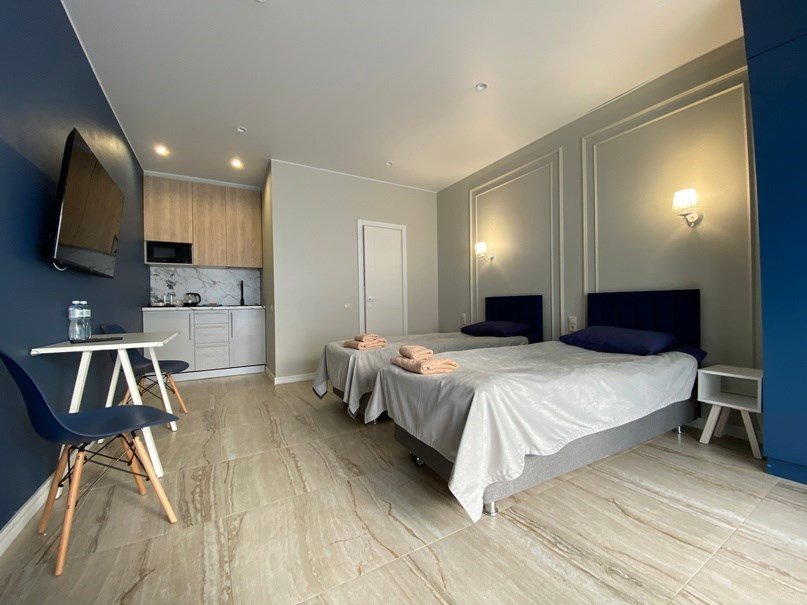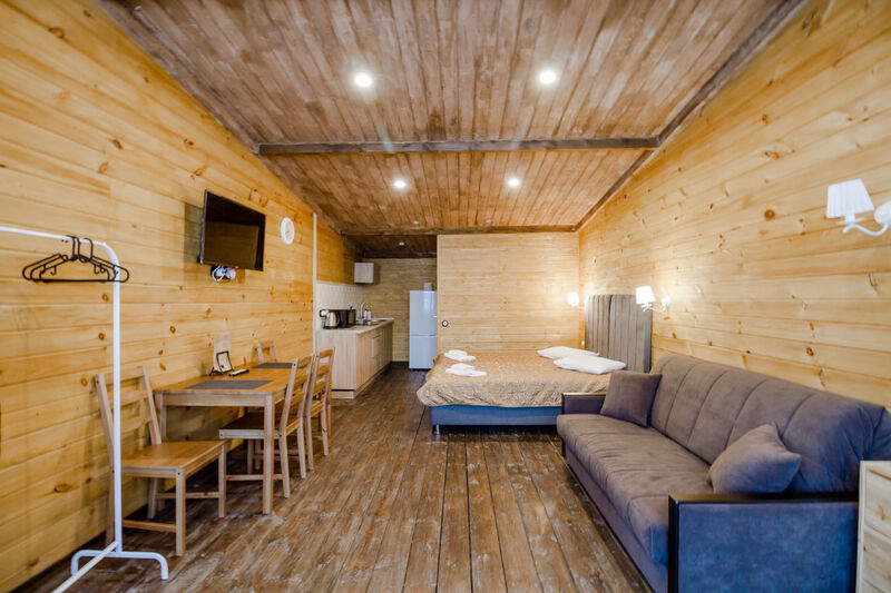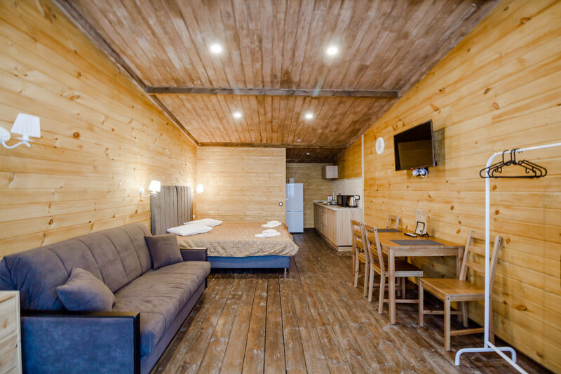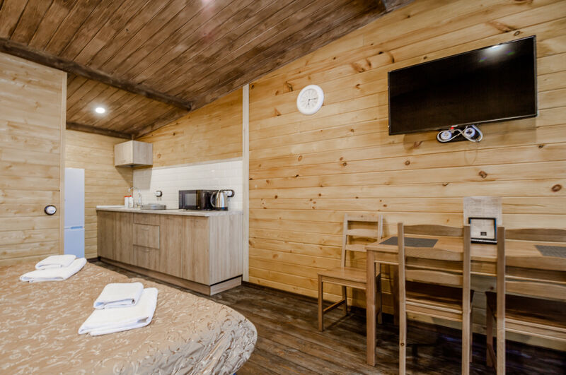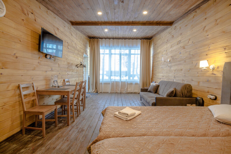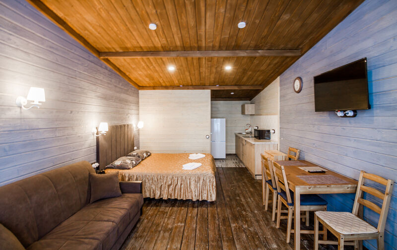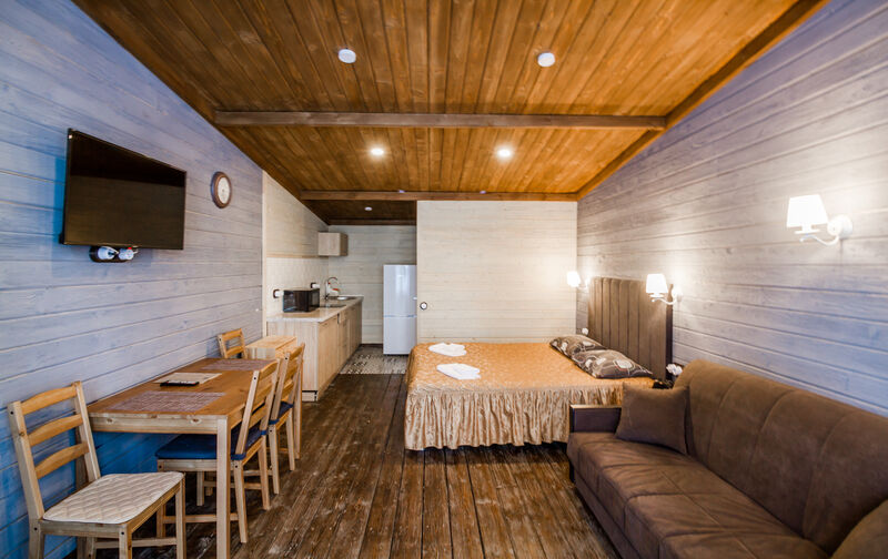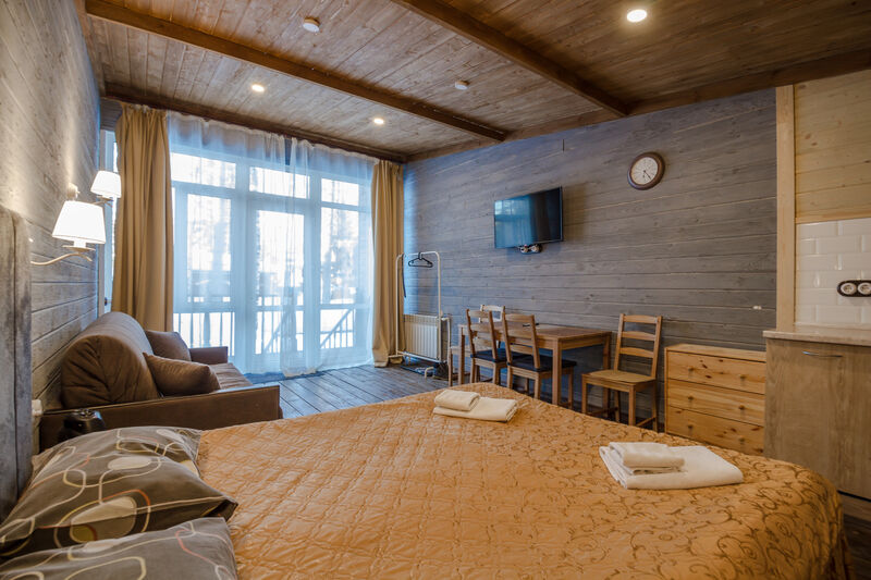 Апартаменты для двоих с одной большой двуспальной кроватью. В номере есть все необходимое для комфортного отдыха на несколько дней вблизи г.к. Игора и автодрома "Игора-Драйв". Оборудованная кухня, тв, обеденный столик для двоих, рейлинг для одежды, небольшие прикроватные тумбочки, комод для вещей и санузел с душевой кабиной.