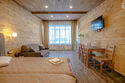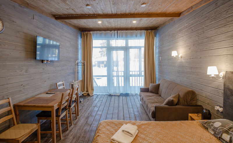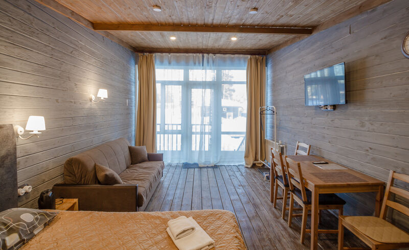 Просторный двухместный номер категории "Стандарт" с панорамными окнами и выходом на террасу.