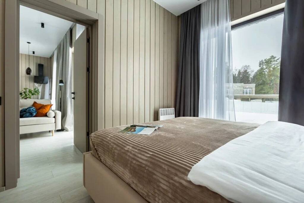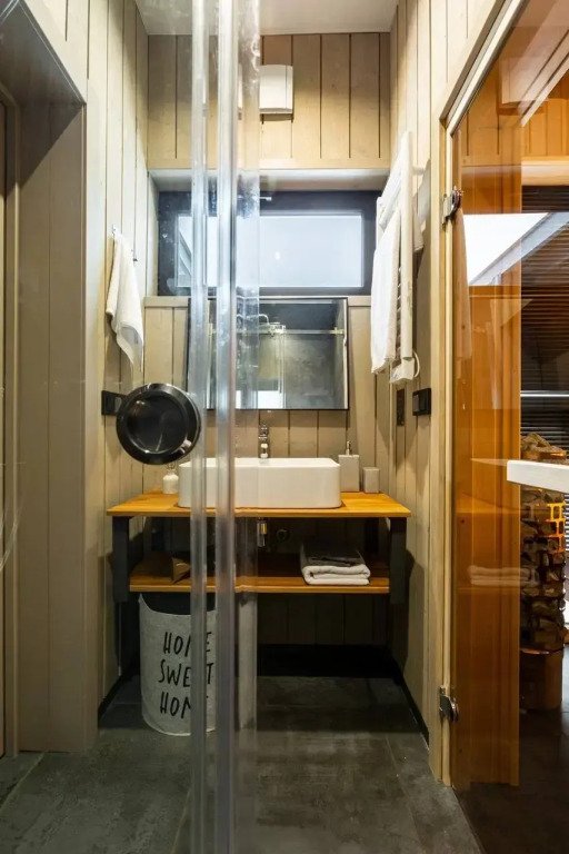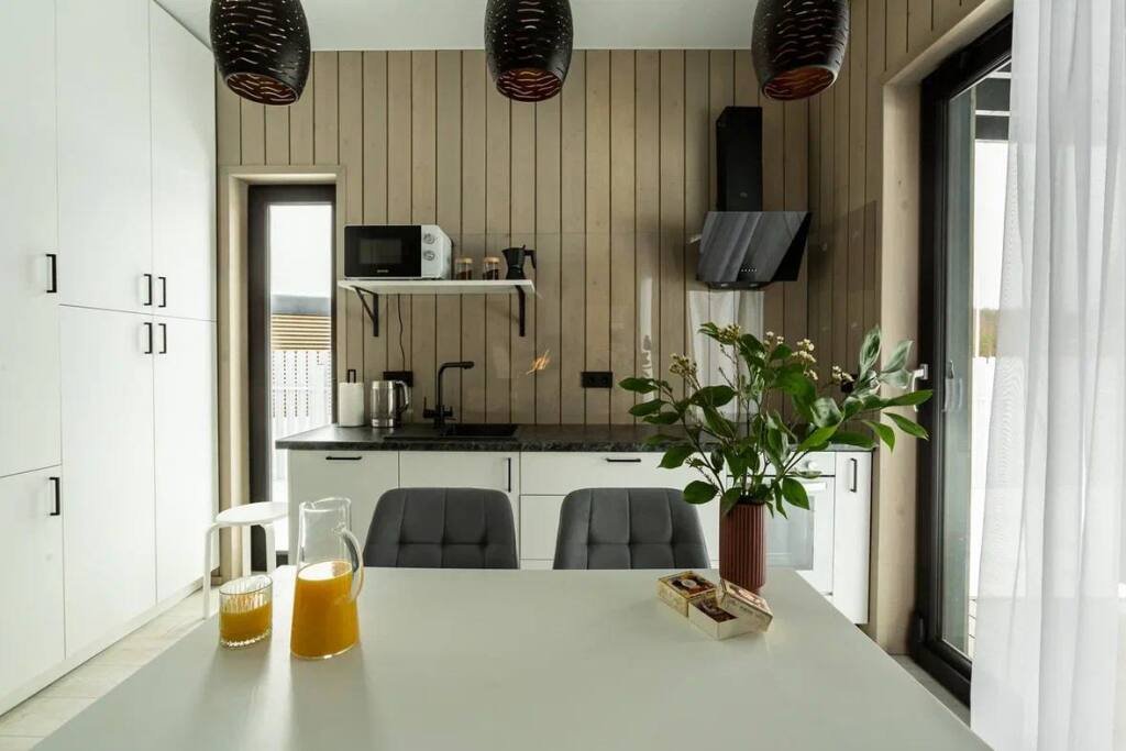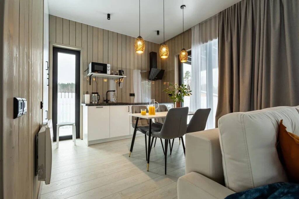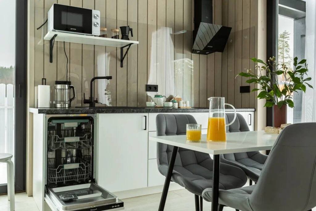 В доме есть всё для отдыха на 6 гостей: 2 спальных комнаты и кухня-гостиная, постельное бельё и полотенца, кровати трансформеры, 160 см делится на два места по 80 см. Также в распоряжении гостей есть посудомоечная машина, духовая печь, микроволновая печь, тёплые полы во всех комнатах, посуда ручной работы на 6 гостей.