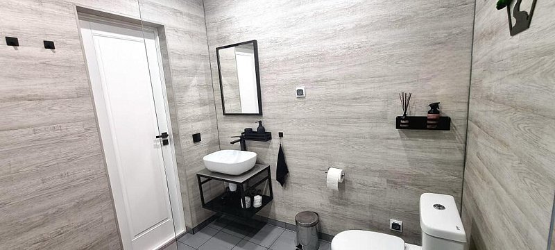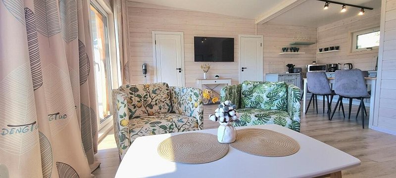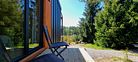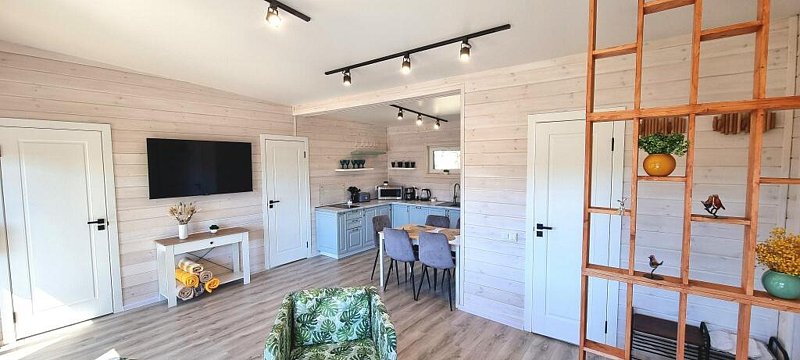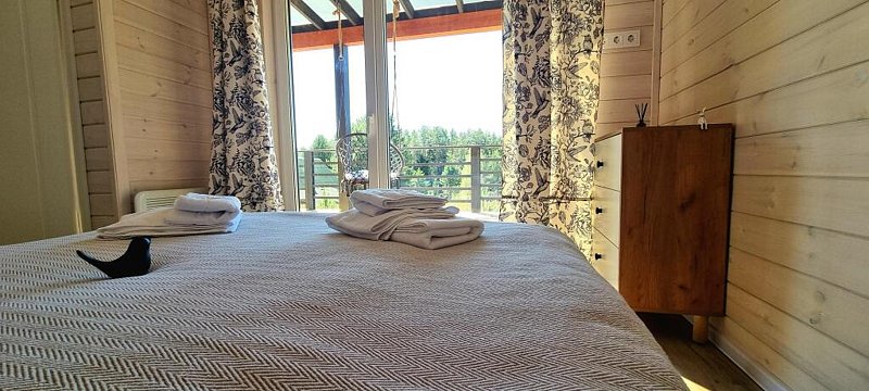 Дом вместимостью до 6 гостей. Спальные места: 2 двуспальные кровати и диван. 2 видовые спальни: одна с выходом на общую террасу и панорамным видом на лес. Вторая спальня имеет отдельную террасу. Просторная кухня-гостиная: комфортные кресла, большой телевизор, панорамные окна с видом на лес. Бытовая техника: посудомоечная машина, микроволновка, чайник, тостер, холодильник, плита.