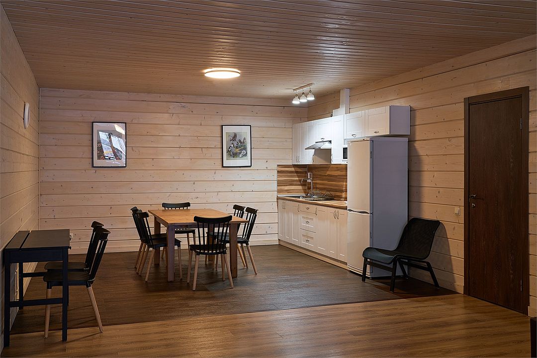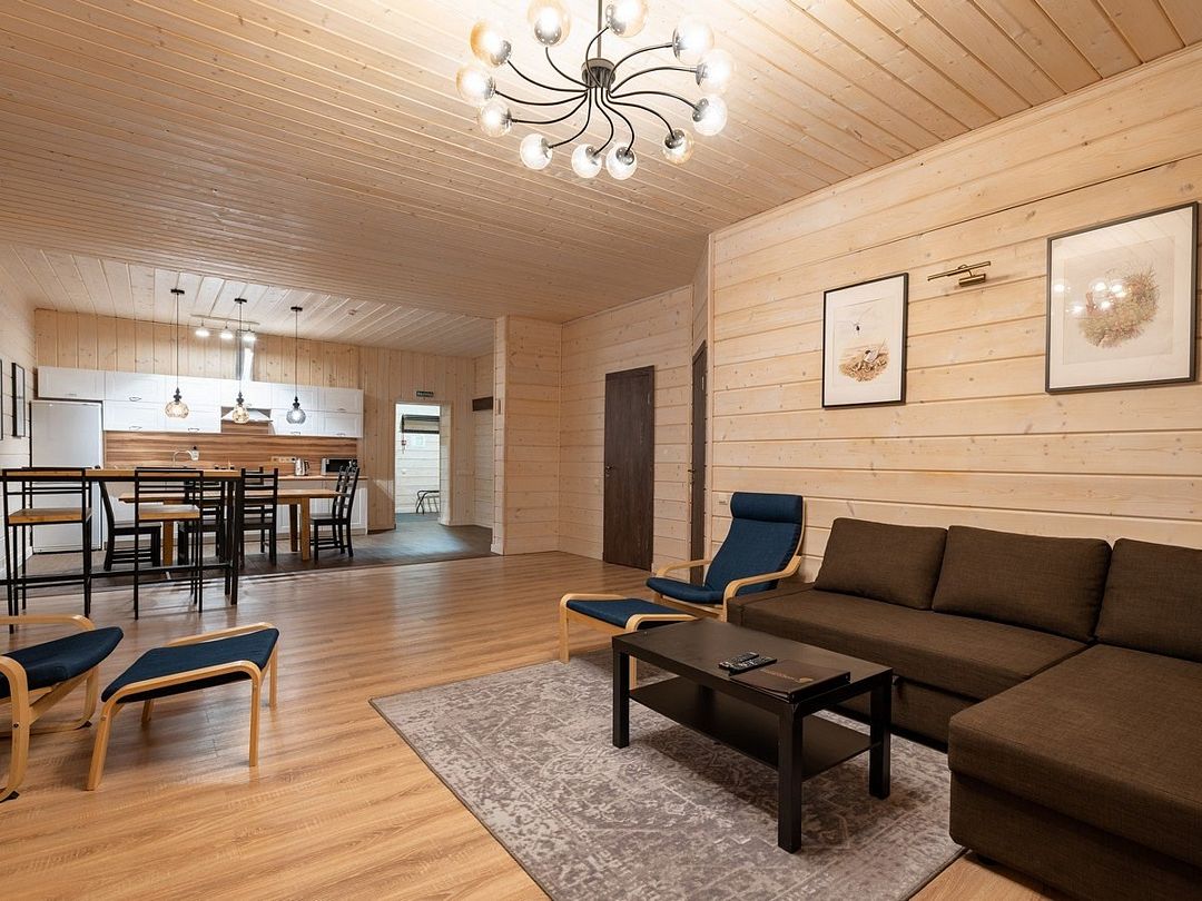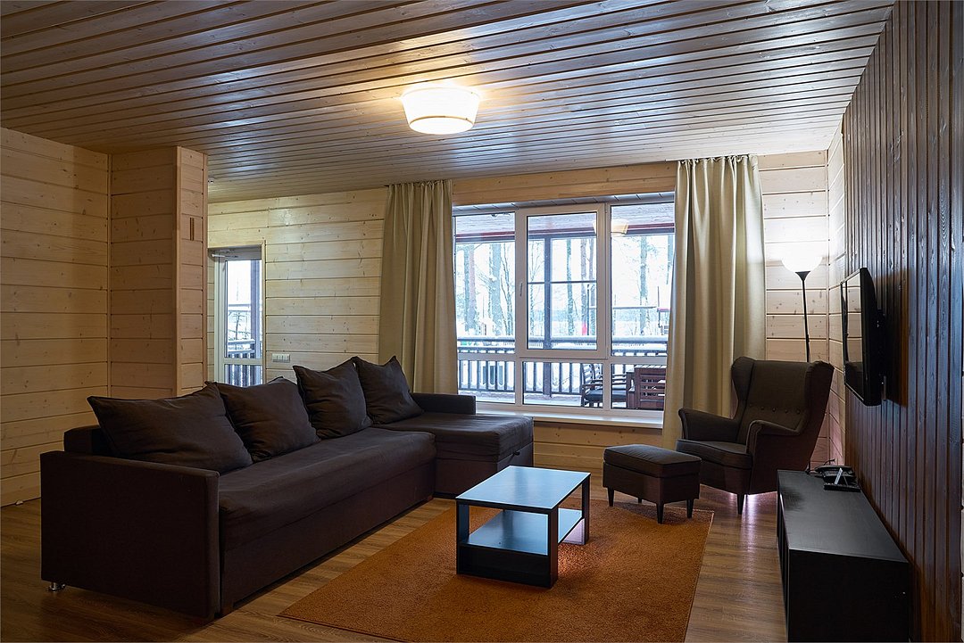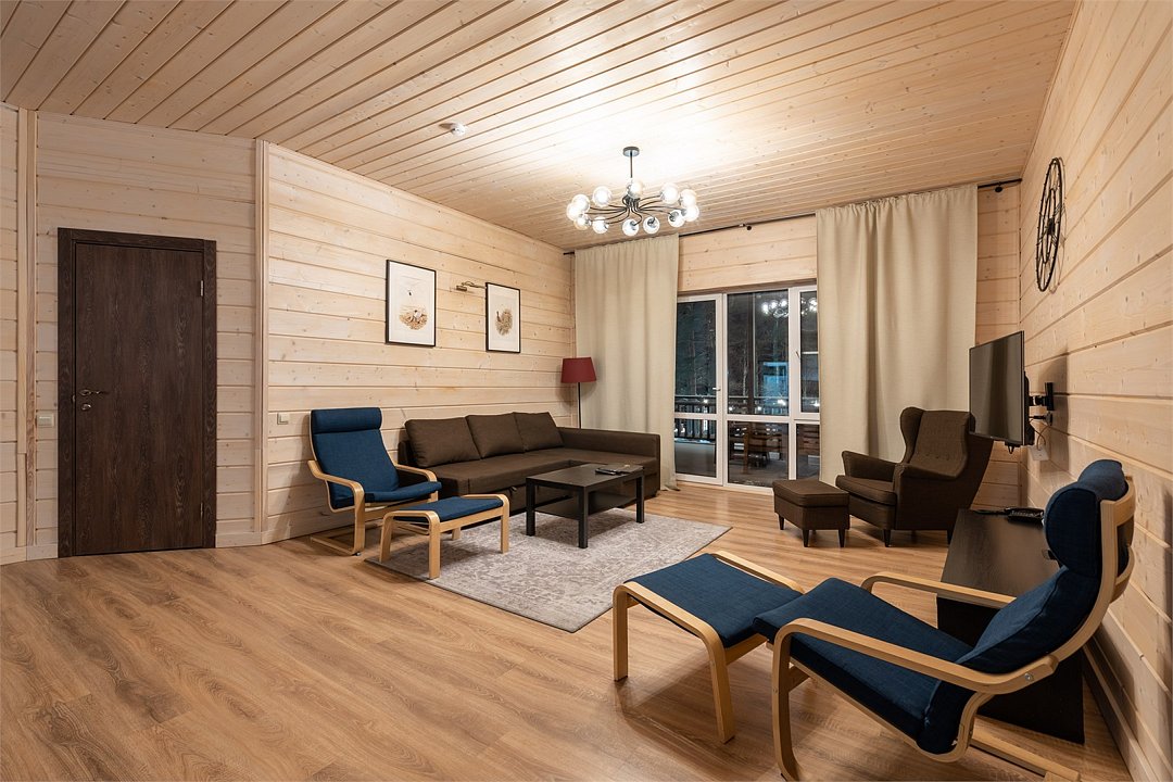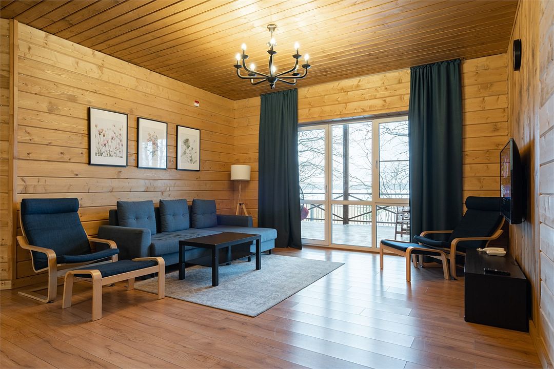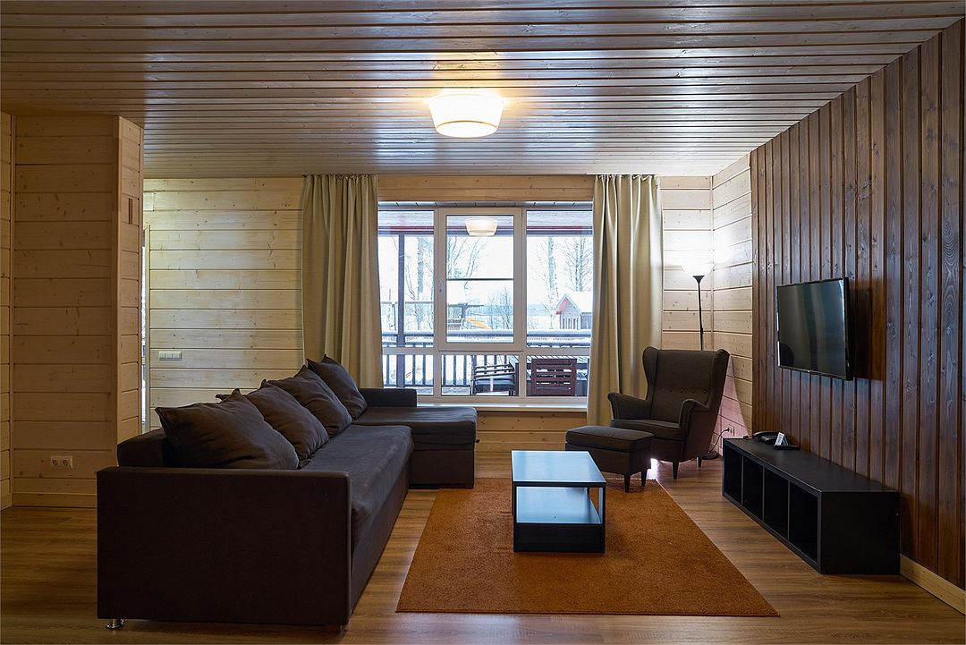 Это большие дома со стильным интерьером и огромными террасами с видом на Вуоксу. Первый и второй этажи — отдельные шале с независимыми входами, расположенными на разных уровнях. Второй этаж — это шале на 8-10 персон, а первый этаж — шале на 6-8 персон.