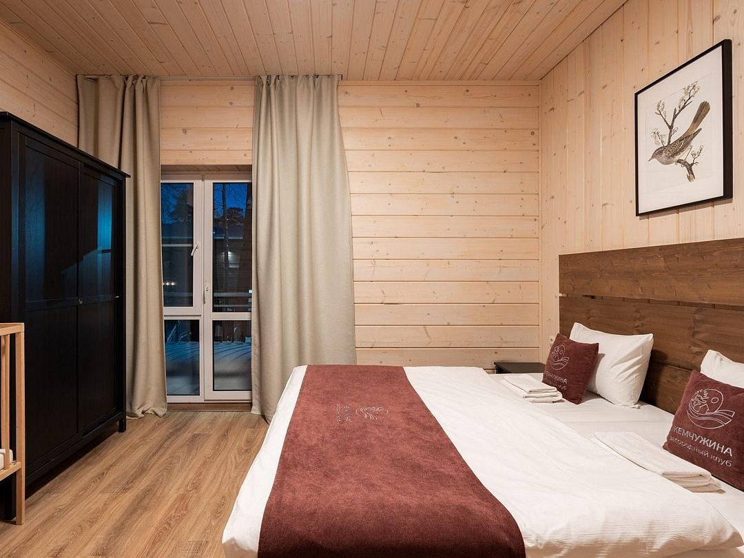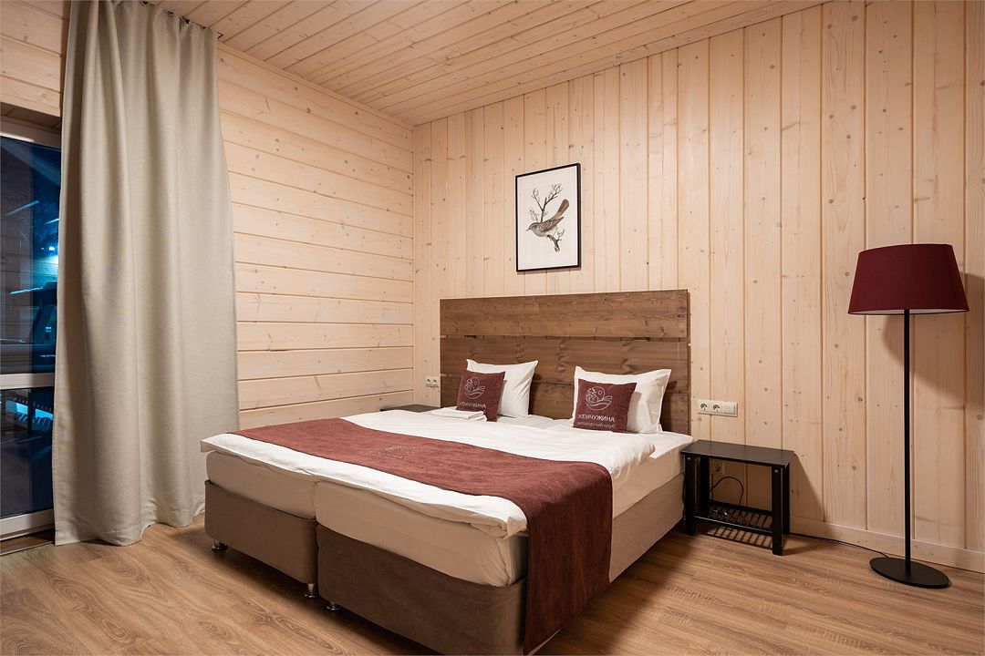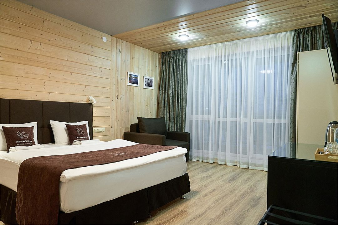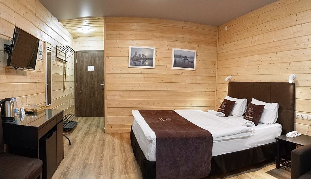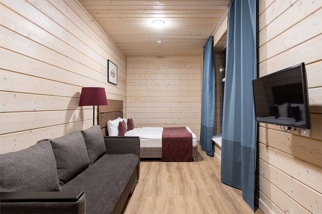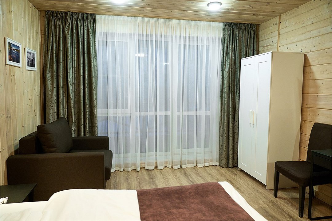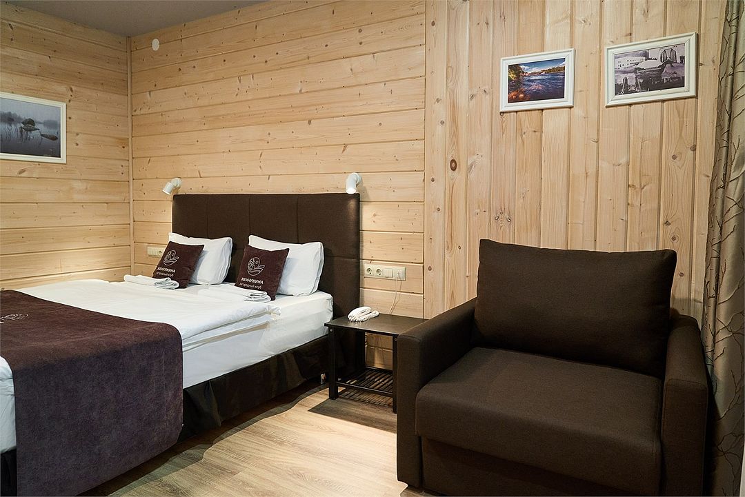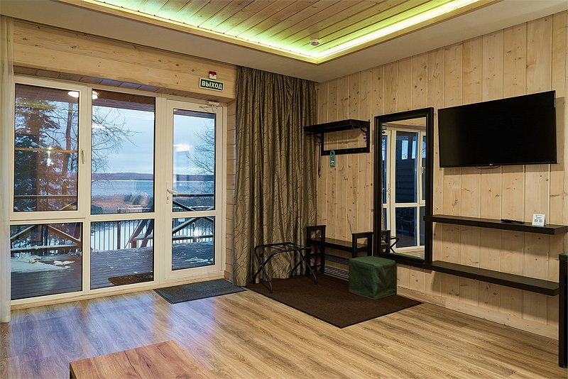 Прекрасный номер в отеле на 2 персоны, с возможным комфортным размещением до 3-х гостей. Панорамные окна — с видом на реку Вуокса или на территорию загородного клуба.