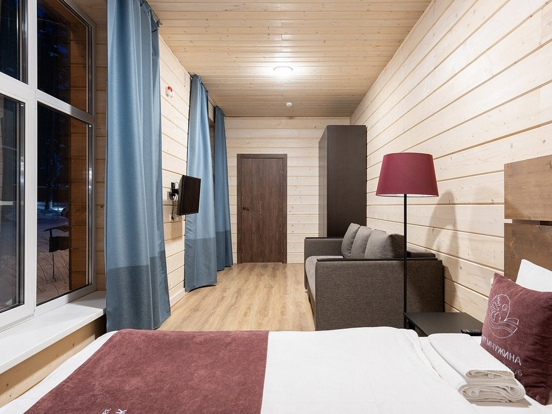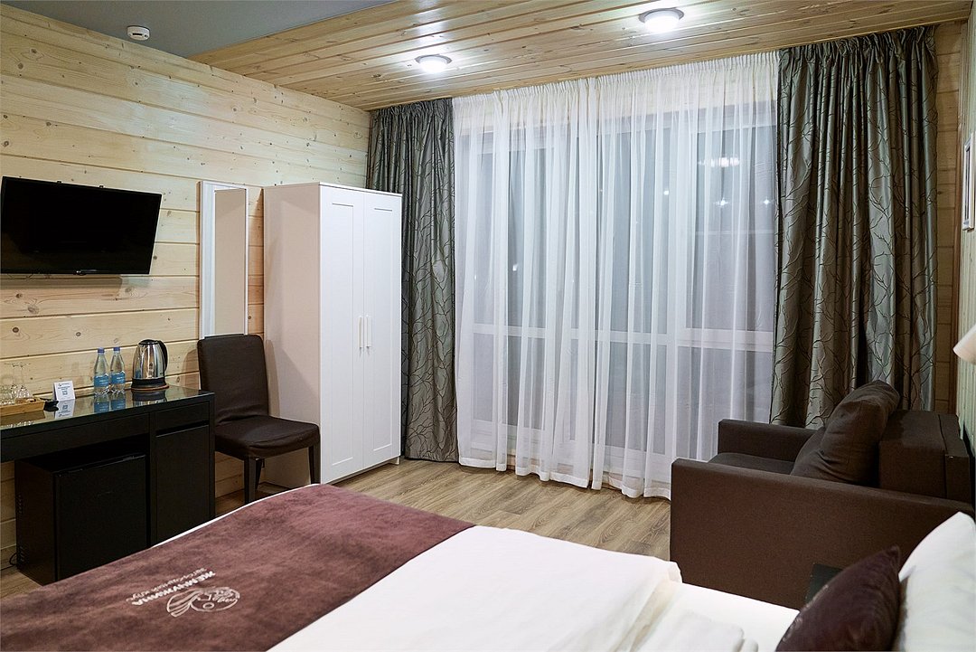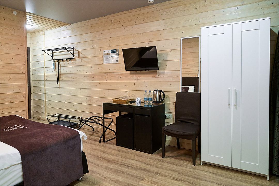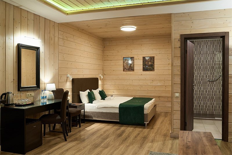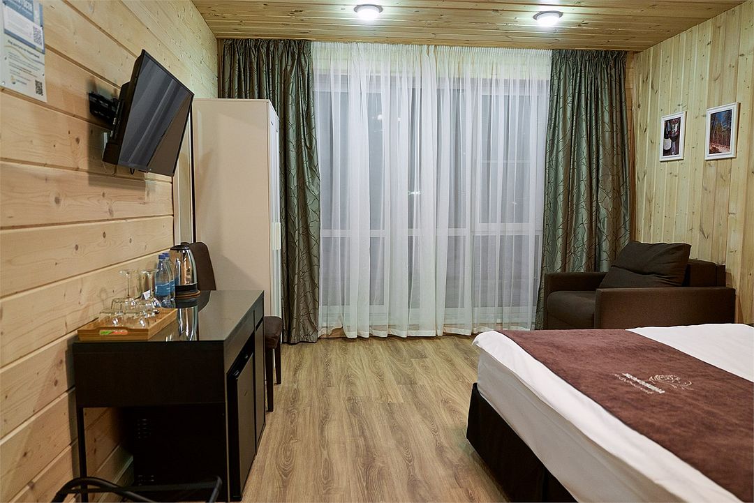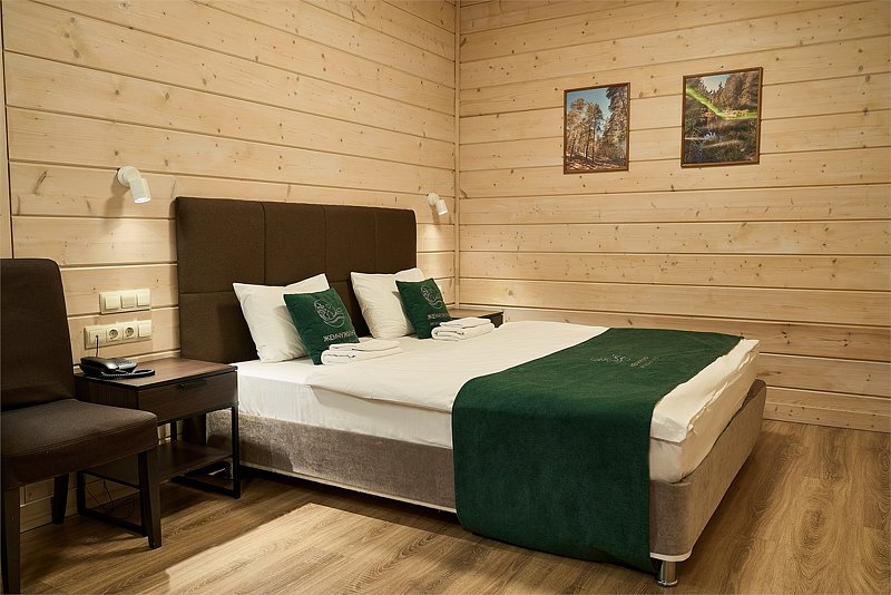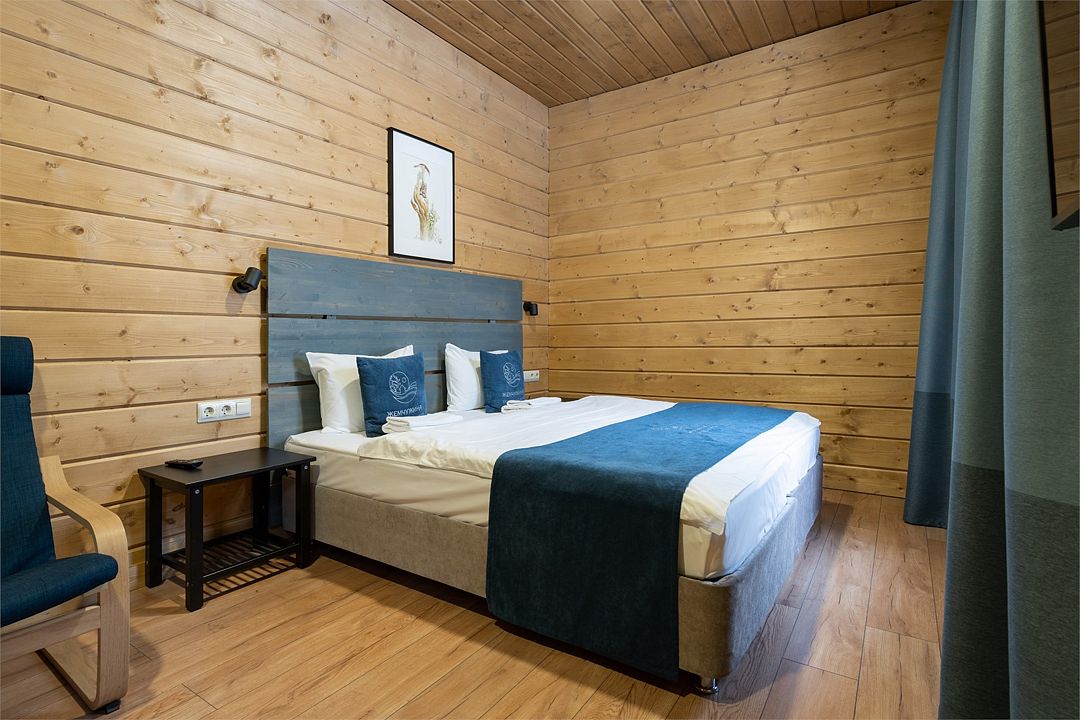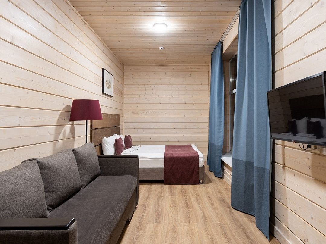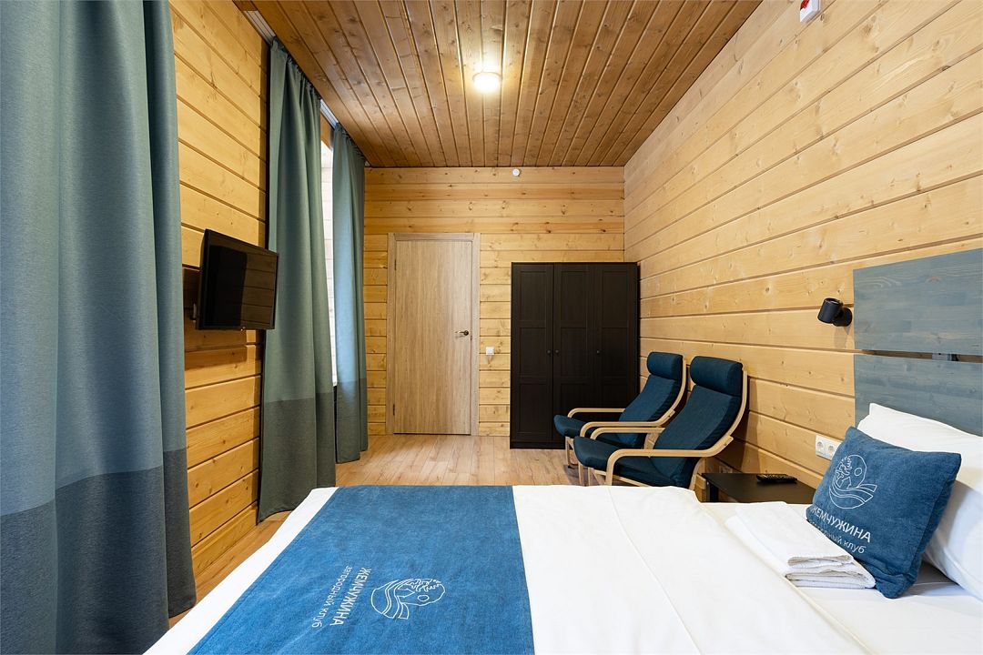 Прекрасный номер в отеле на 2 персоны, с возможным комфортным размещением до 3-х гостей. Панорамные окна — с видом на реку Вуокса или на территорию загородного клуба.