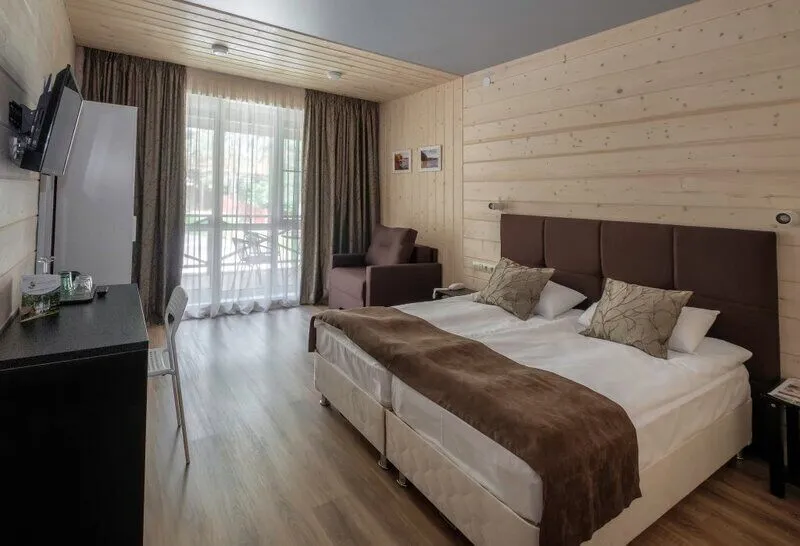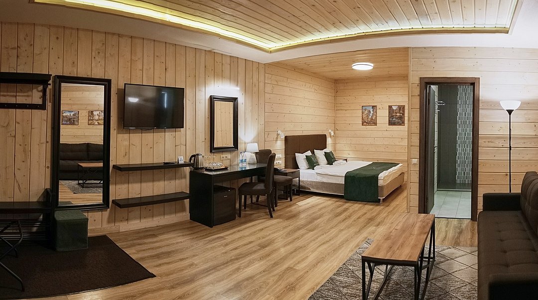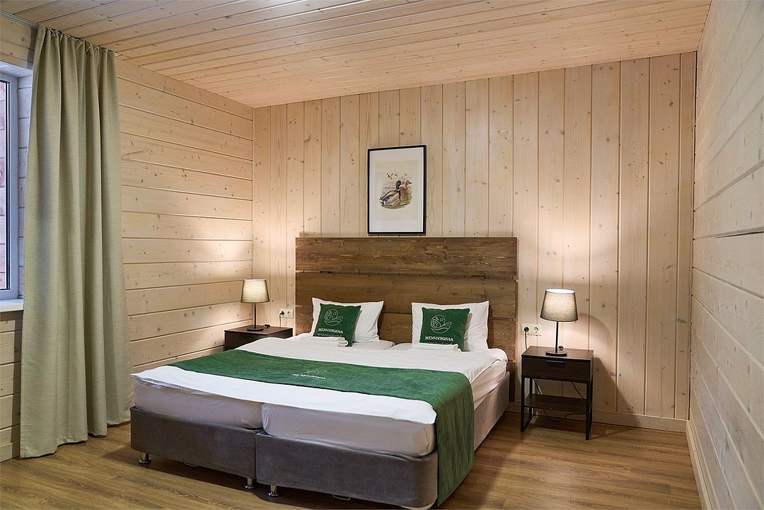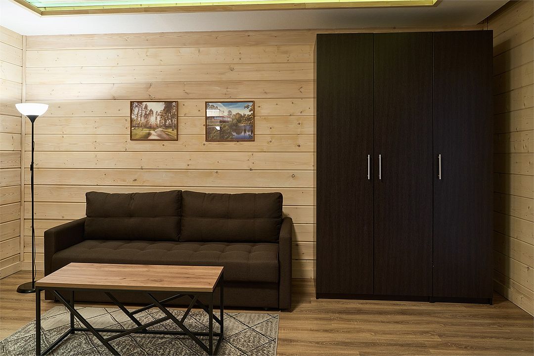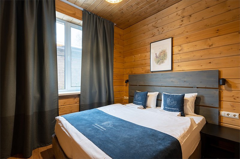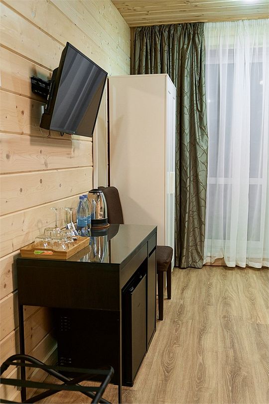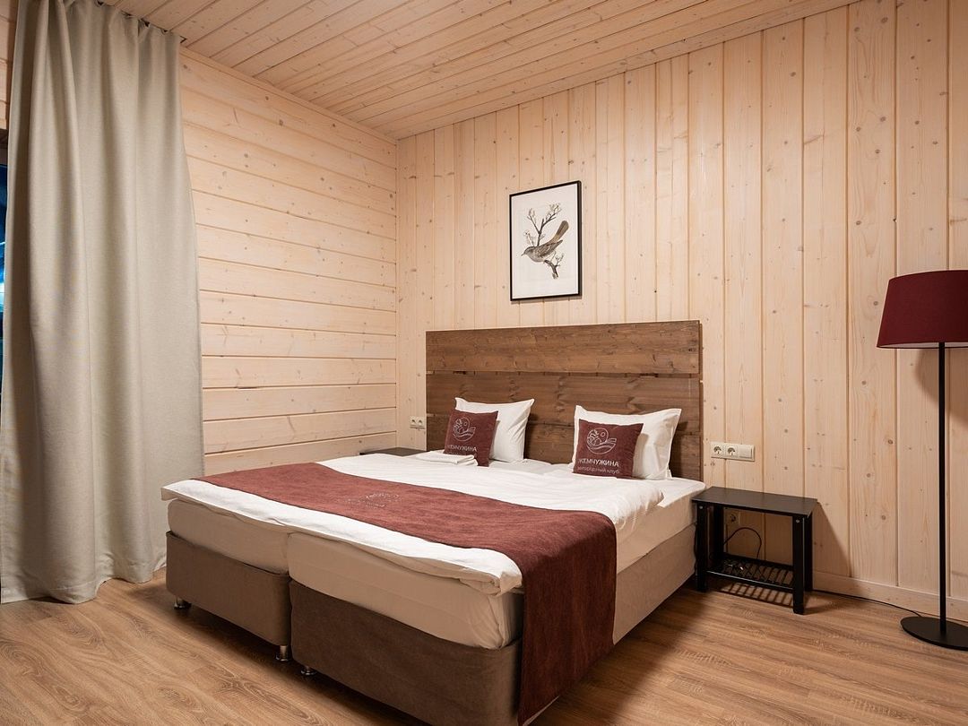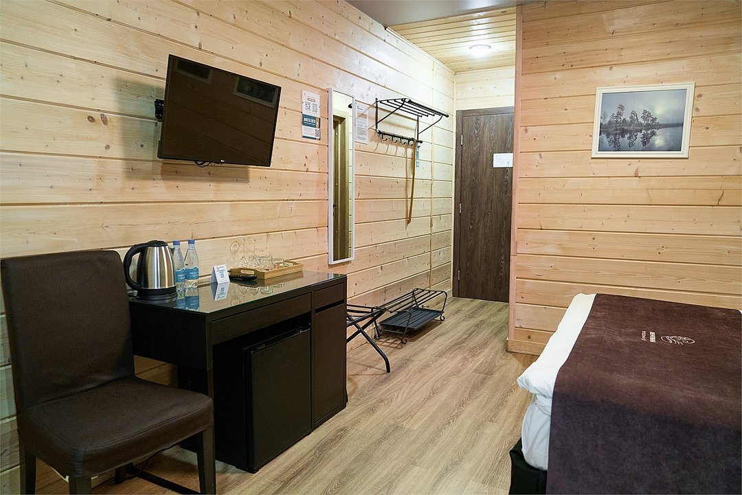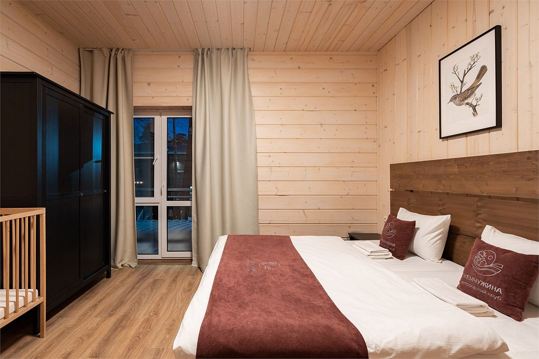 Прекрасный номер в отеле на 2 персоны, с возможным комфортным размещением до 3-х гостей. Панорамные окна — с видом на реку Вуокса или на территорию загородного клуба.