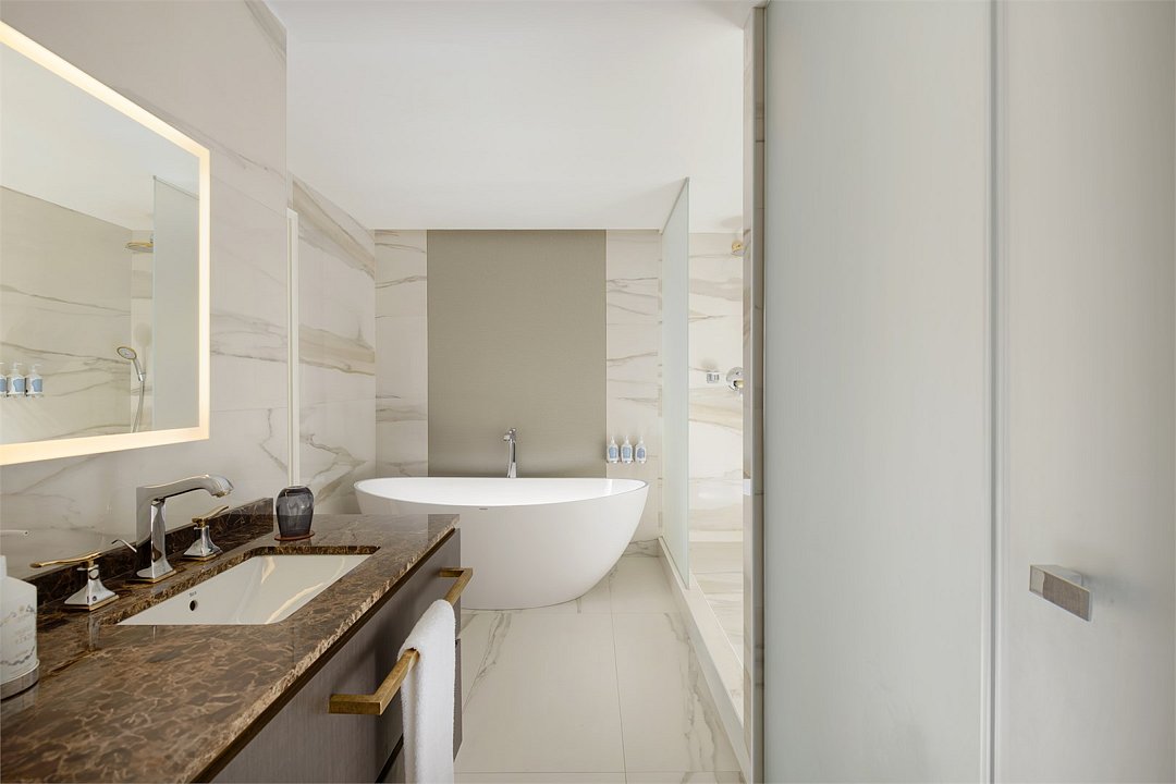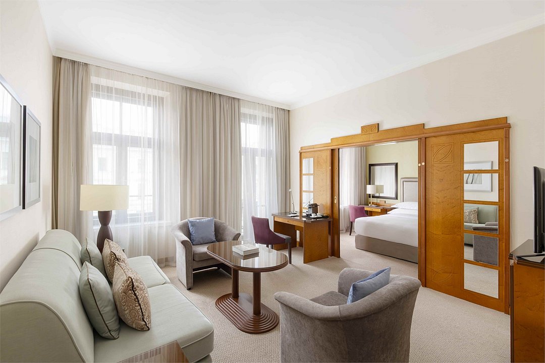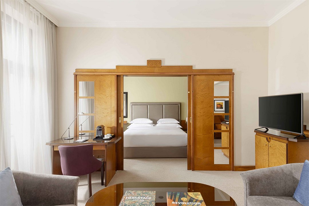 Wi-Fi, телефон, кондиционер, фен, ванная комната, ванна, халаты, банные полотенца, тапочки, косметические средства, кровать «King size», диван, кресла, шкаф для одежды, журнальный столик, багажная тумба, зеркало, две комнаты, чайный набор, обслуживание номеров, сейф, чайник, питьевая вода, гостиная зона, ковровое покрытие, отопление, вид на город, меню подушек, туалетный столик, стул, тумба, туалетный столик, туалет, телевизор с плоским экраном, номер для некурящих, рабочий стол, мини-бар (платно)В гостиничном номере