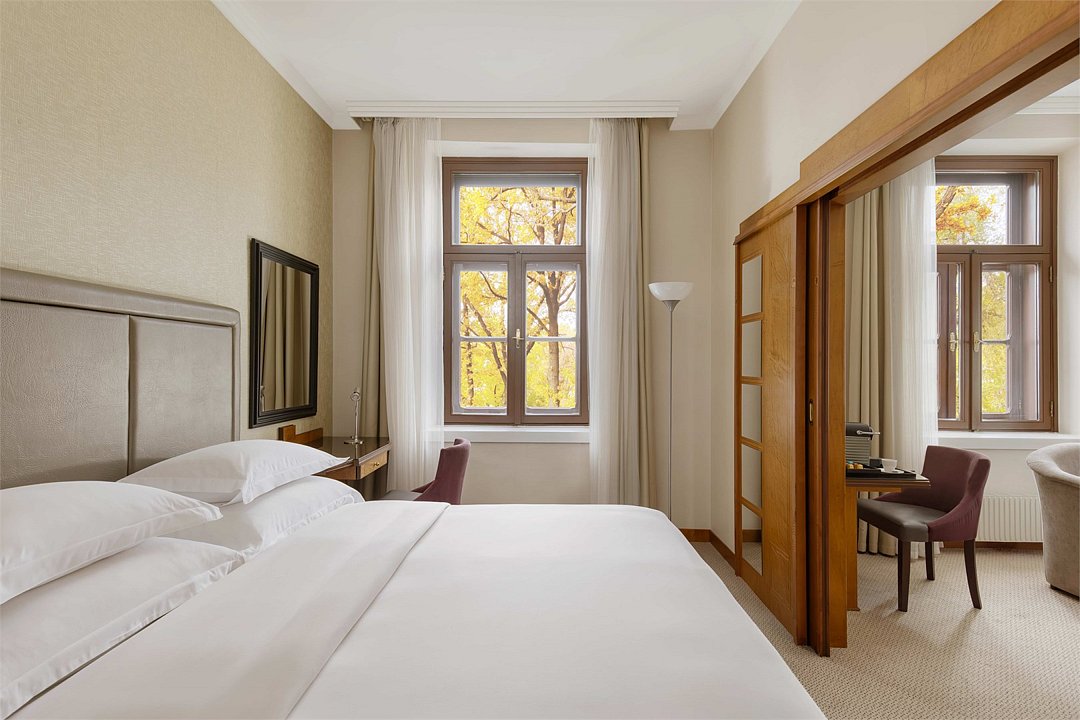 Wi-Fi, ванная комната, душевая кабина, халаты, банные полотенца, тапочки, косметические средства, кровать «King size», диван, кресла, шкаф для одежды, журнальный столик, сейф, минеральная вода, гостиная зона, вид на город, меню подушек, внутренний телефон, пуфик, рабочий стол, чайная станция, мини-бар (платно)В гостиничном номере