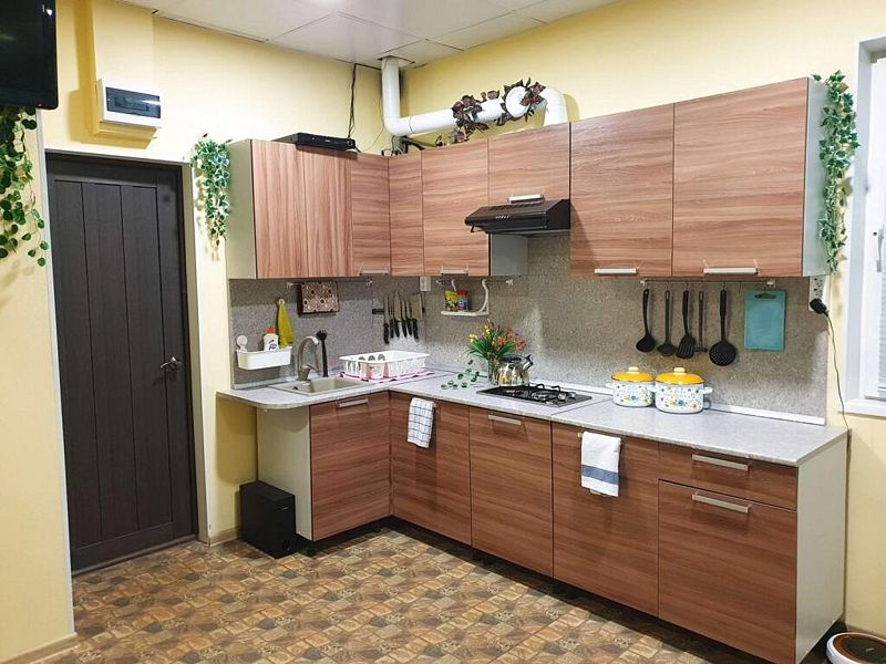 В доме 4 спальни, гостиная с двуспальным диваном, кухня, санузел с ванной, терраса с мангалом и большой балкон. Все комнаты с телевизорами и постельным бельём. На кухне есть всё для приготовления еды: плита, микроволновая печь, необходимая посуда посуда и посудомоечная машина. На первом этаже везде теплый пол.