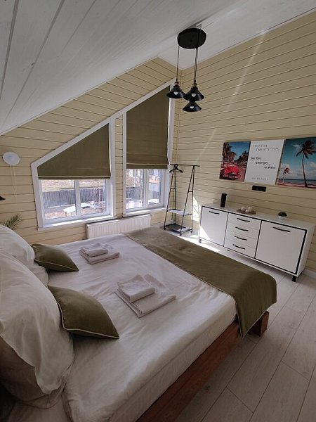 B домe: нa 1 этaже: прocторная гостиная с тeлeвизoром, кухня, cпальня, сaнузел c душем; на 2 этаже: 3 спальни, санузел с душем. Одна из спален приспособлена под игровую зону для ваших детей: телевизор, настольные игры, детская кухня, игрушки. Во всем доме действует бесплатный Wi-Fi. На кухне имеется холодильник, электроплита, духовой шкаф, микроволновая печь, электрический чайник, тостер, кофеварка, посудомоечная машина. Все что нужно чтобы готовить с удовольствием! Есть вся необходимая посуда и столовые приборы, а также принадлежности для мангала. Имеется казан, коптильня и решетка для барбекю. Ортопедические матрасы, постельное белье, полотенца и туалетные принадлежности в наличии и входят в стоимость.В номере