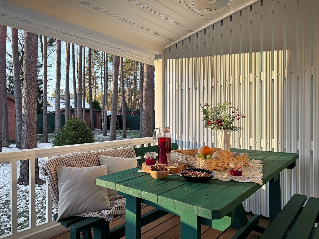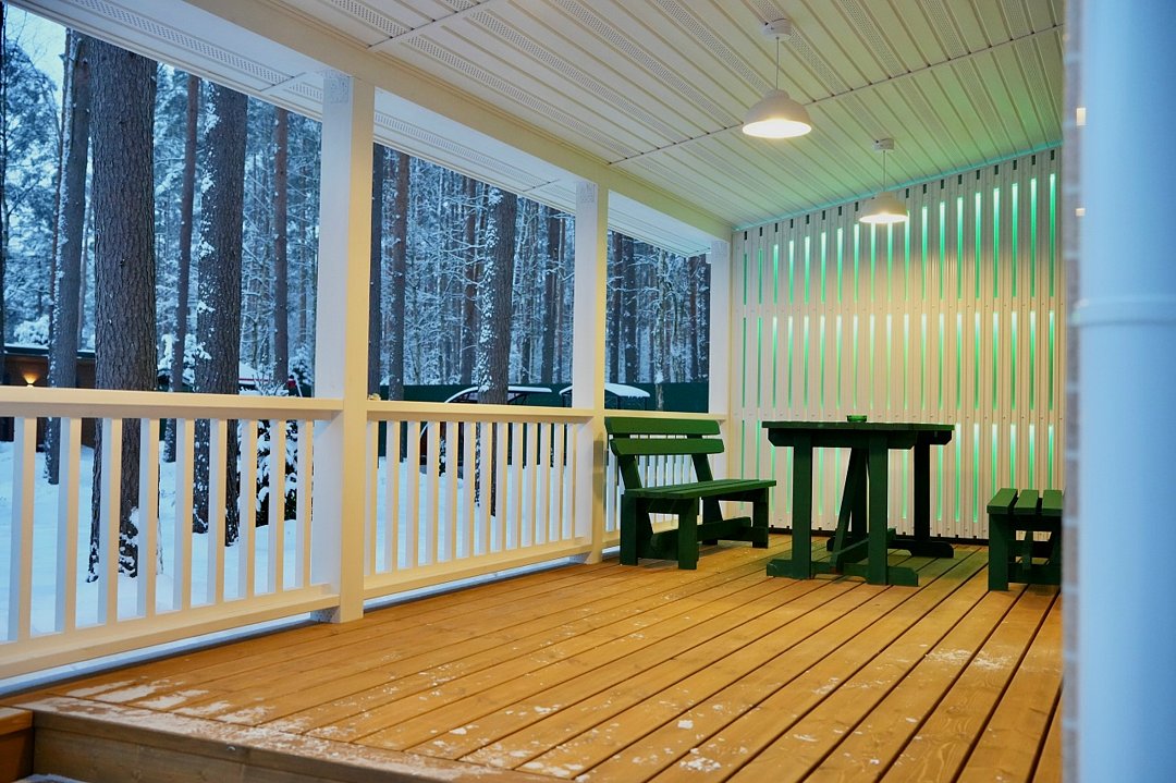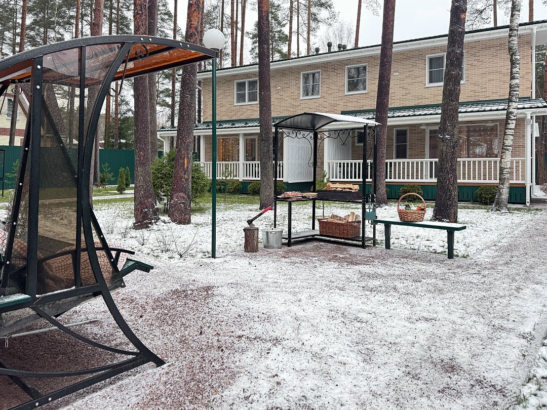 «Сосновка» расположена на лесном участке, утопающем в соснах. Имеются качели, батут, садовая мебель, стационарный мангал, шашлык, веранда, места для трапез и посиделок на свежем воздухе. Водоснабжение — скважина с чистейшей водой. Отопление — тёплый водяной пол на первом этаже, водяные радиаторы — на втором.К дополнительным услугам: русская баня на дровах с уединенной террасой, а зимой еще и прокат лыж.