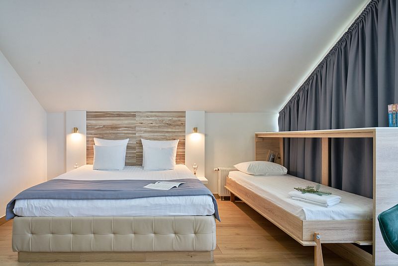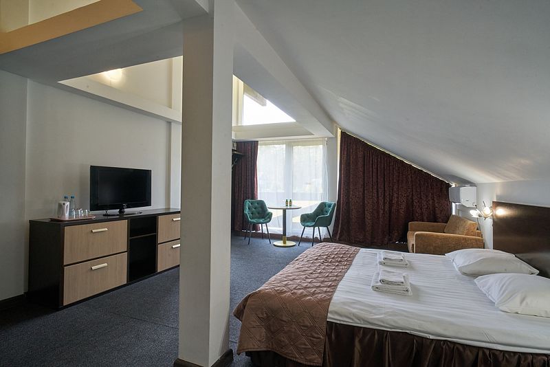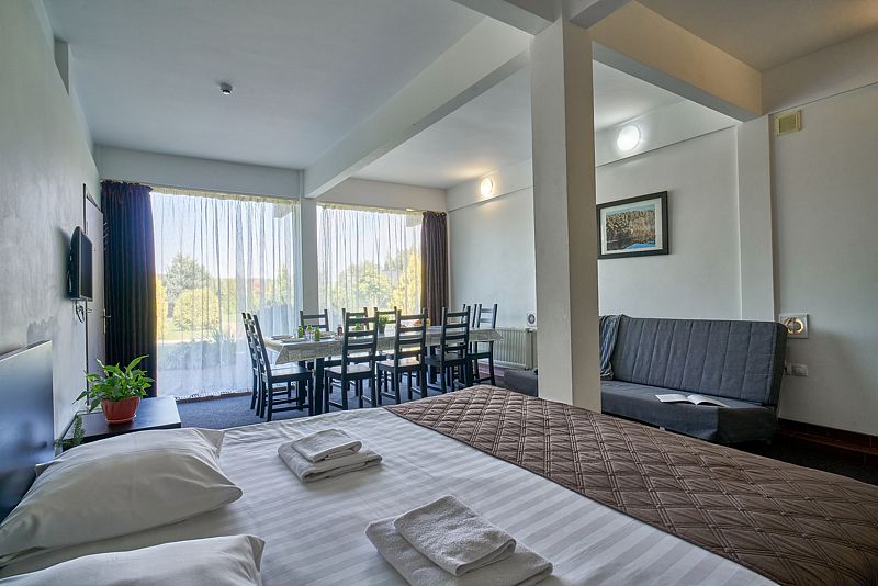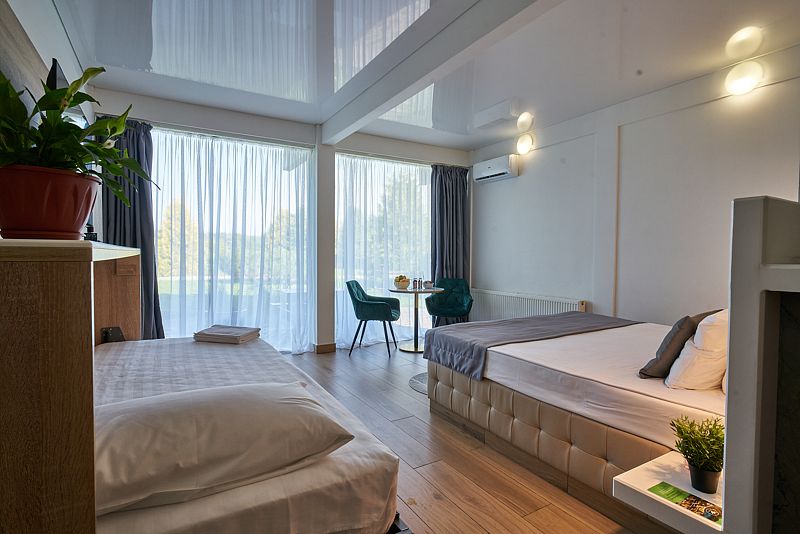 В номере: две двуспальные кровати или двуспальная кровать и диван-кровать, раскладное кресло, шкаф, ТV с плоским экраном и HDMI входом, мини холодильник, кондиционер, стол, стулья, чайник, чашки, стаканы, постельное белье, набор полотенец, диспенсер с гель-шампунем, собственная ванная комната с санузлом.