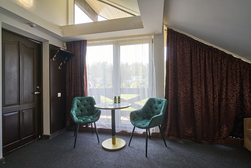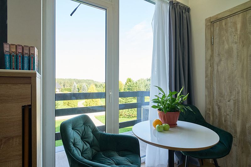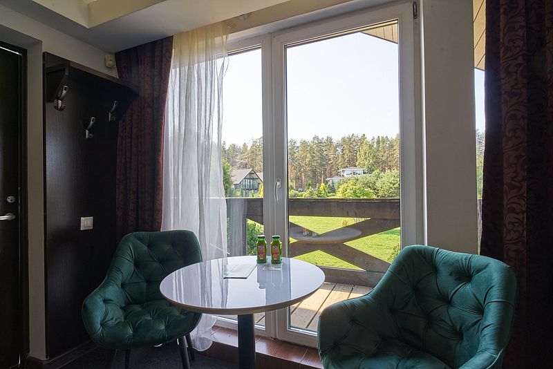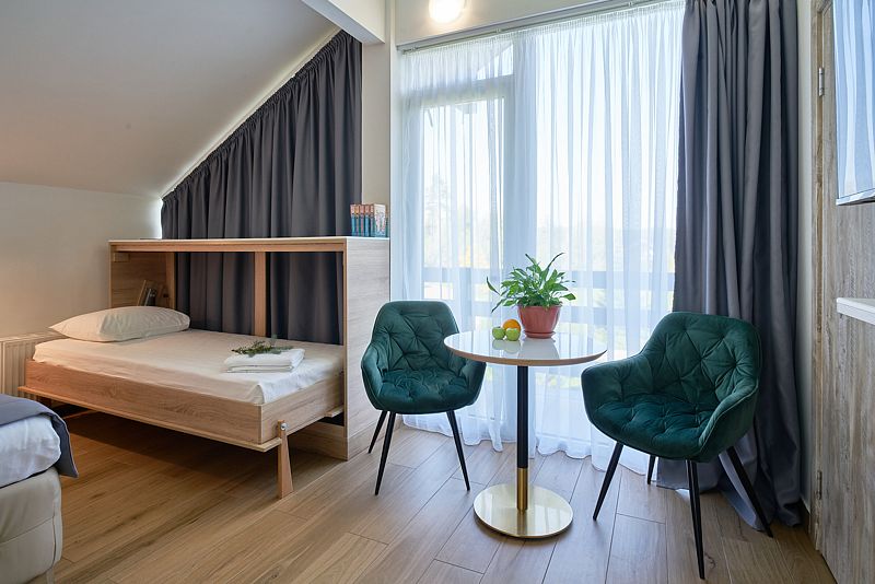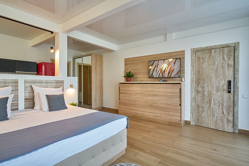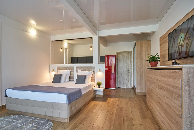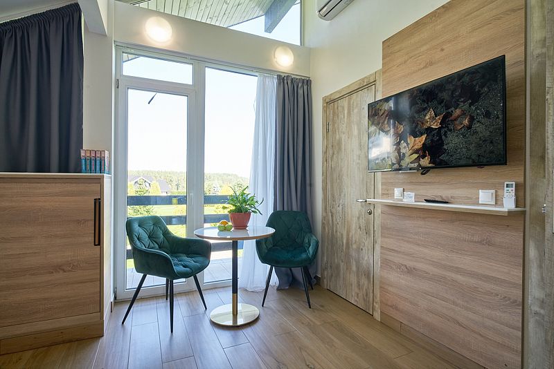 Просторный однокомнатный номер с полноценной кухней и видом на территорию комплекса.