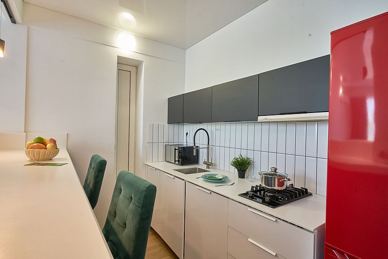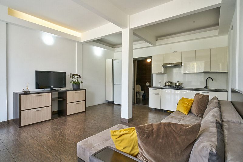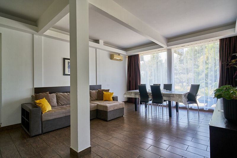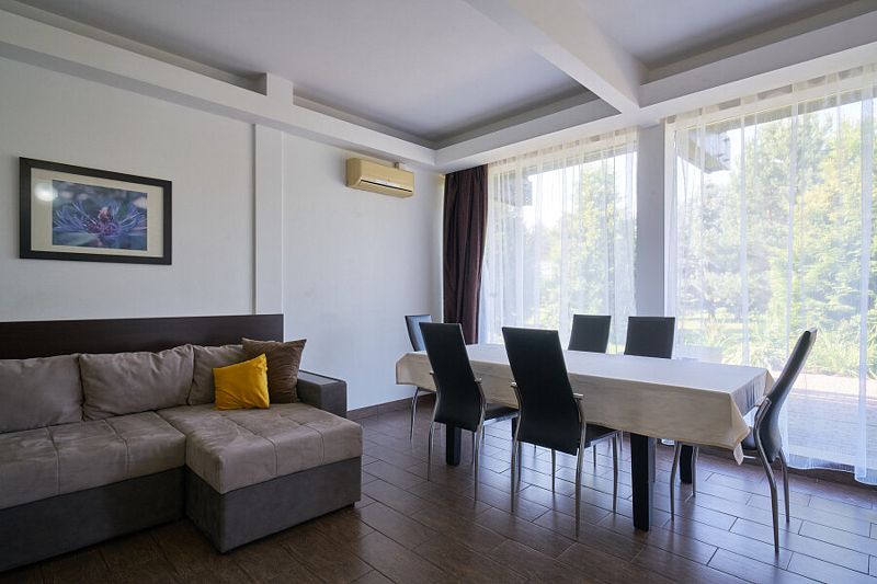В номере: Двуспальная кровать, диван-кровать, собственная полноценная кухня с газовой варочной панелью на 4 конфорки, холодильник, стол, стулья, набор посуды и столовые принадлежности, чайник, шкаф, ТV с плоским экраном и HDMI входом, кондиционер, постельное белье, набор полотенец, диспенсер с гель-шампунем, собственная ванная комната с санузлом.